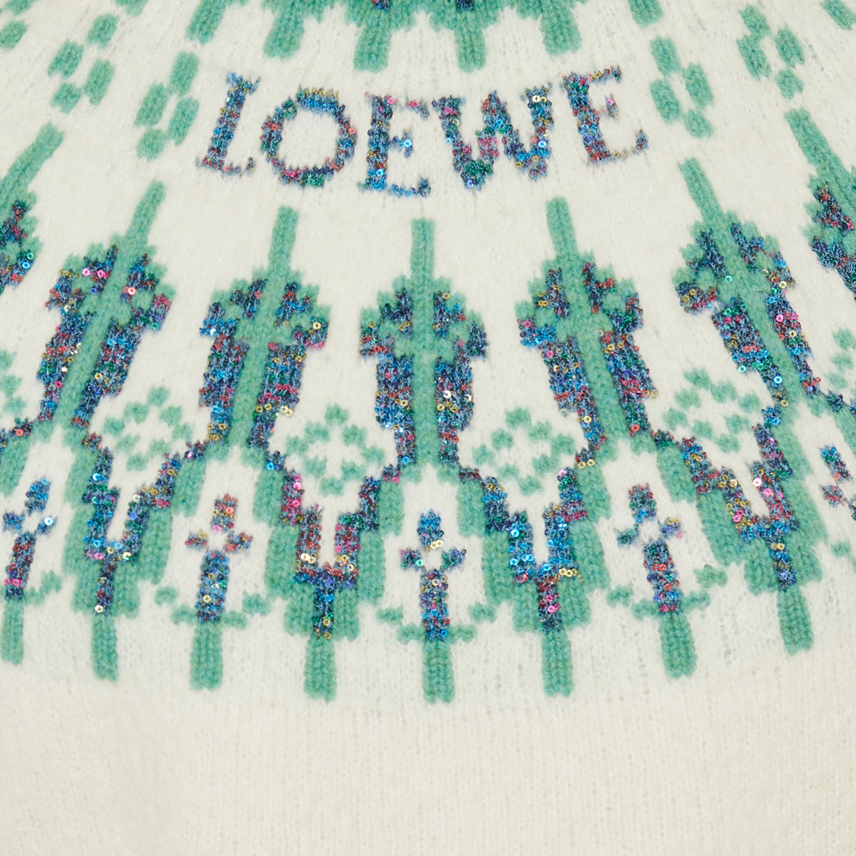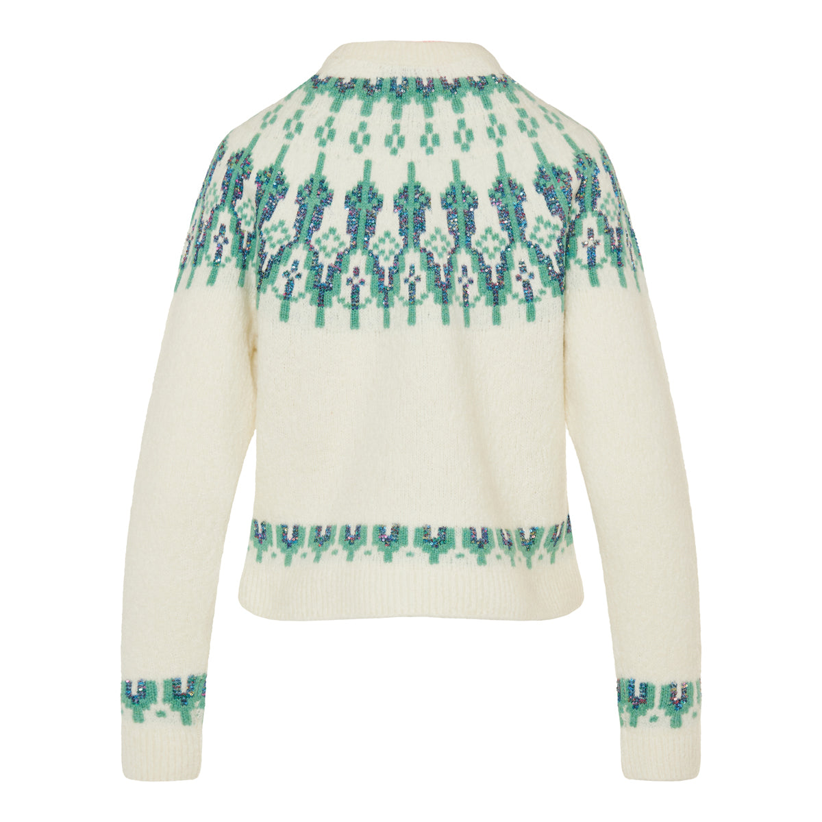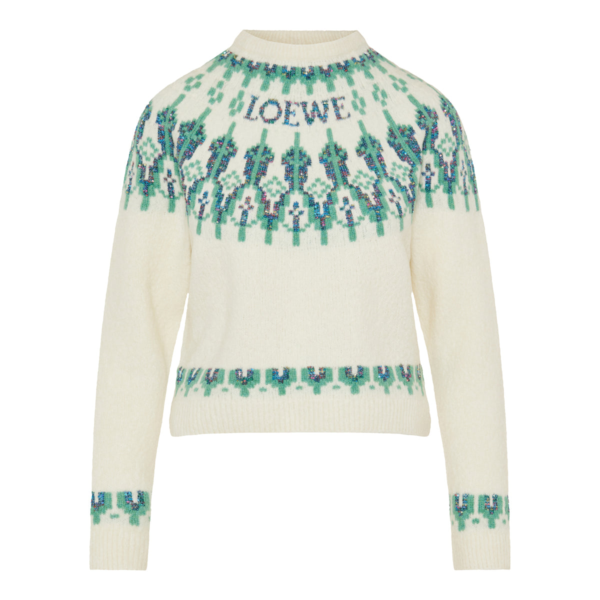 The sweater in wool blend offers refined comfort and understated elegance, ideal for polished everyday layering or smart‑casual ensembles. Its medium‑weight knit features a boxy silhouette and a distinctive Fair Isle–inspired pattern with sequinned‑yarn detailing, making it a luxurious staple for autumn‑winter wardrobes.