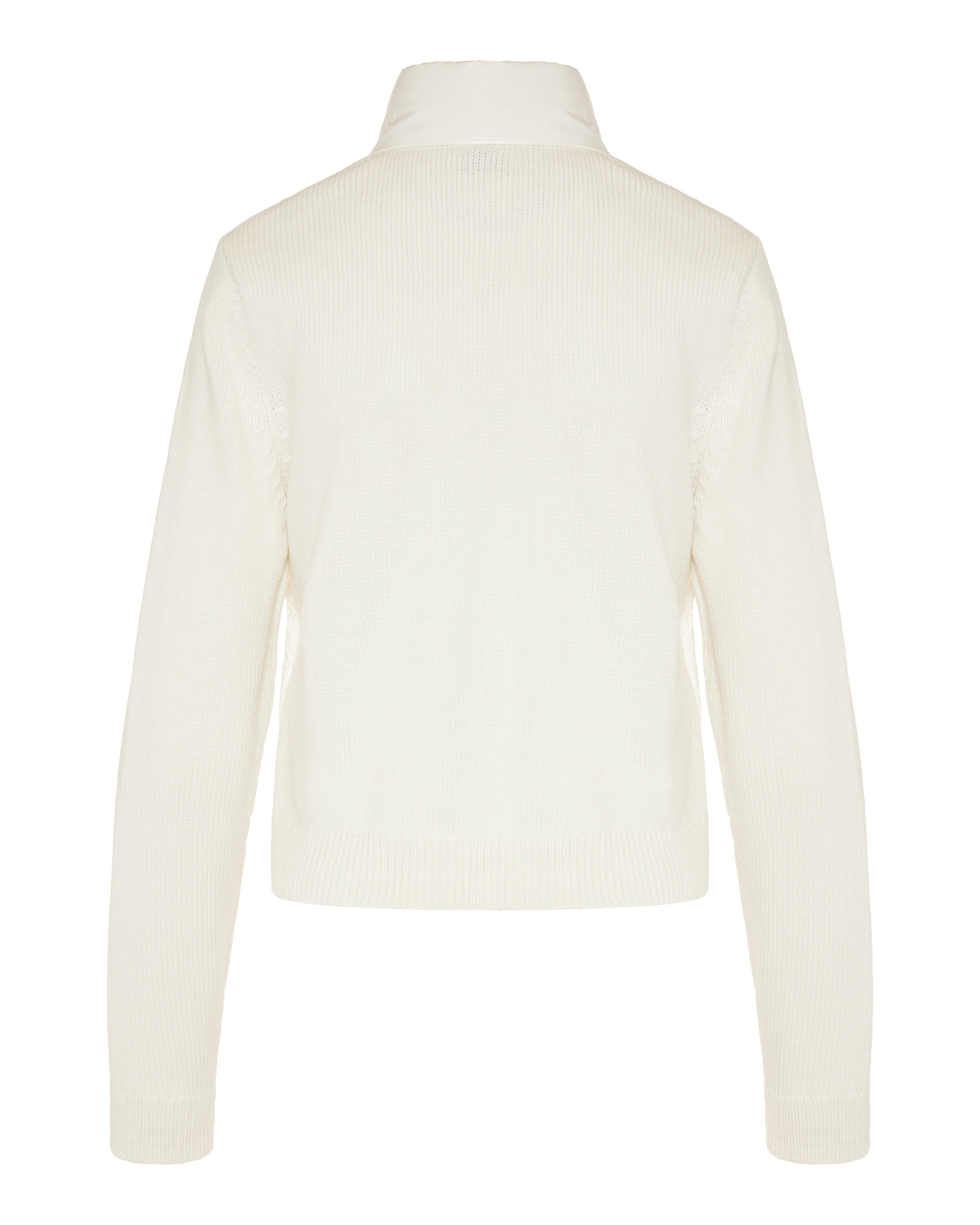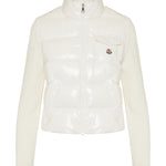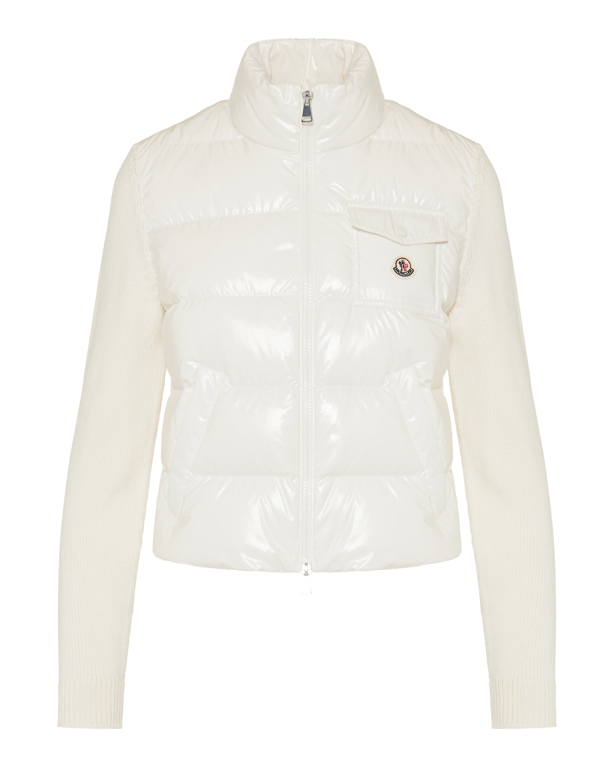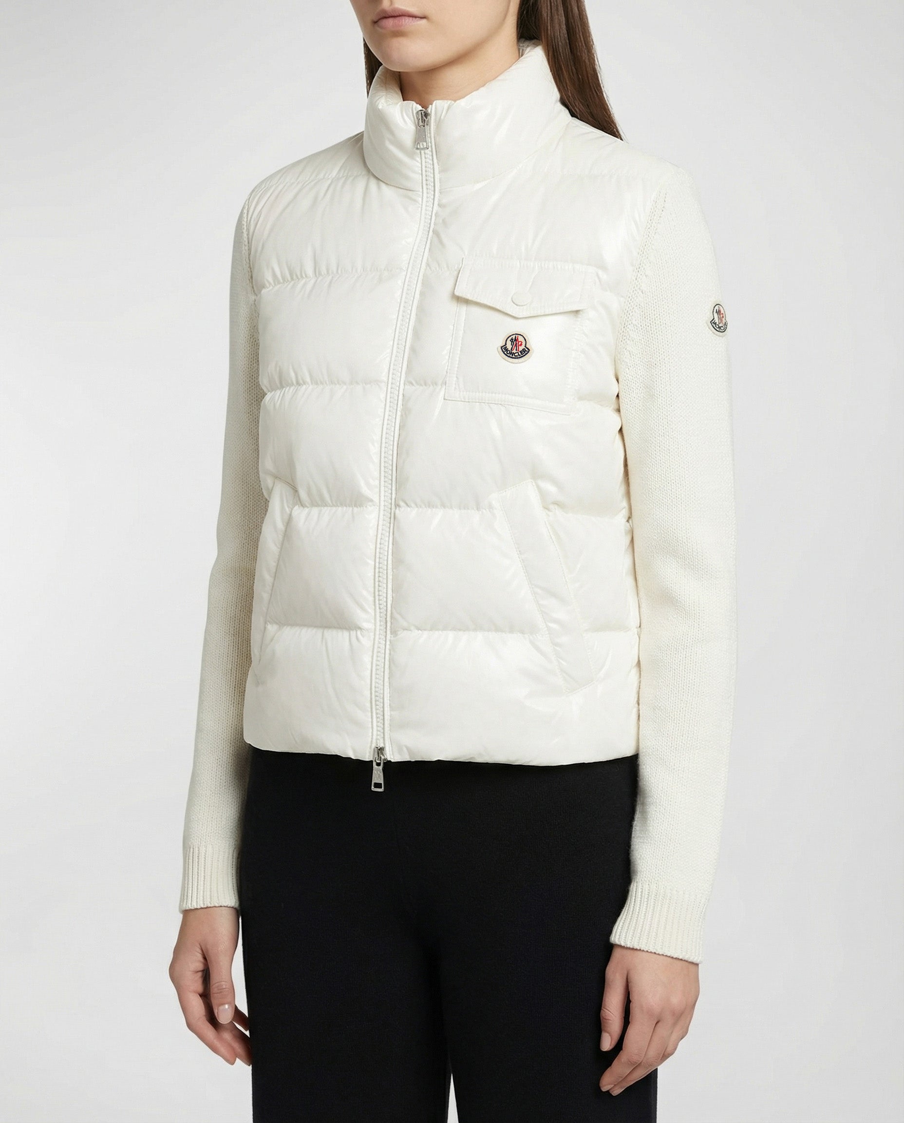 A refined hybrid cardigan that blends Moncler’s knitwear elegance with functional padded detailing, offering warmth and contemporary style.