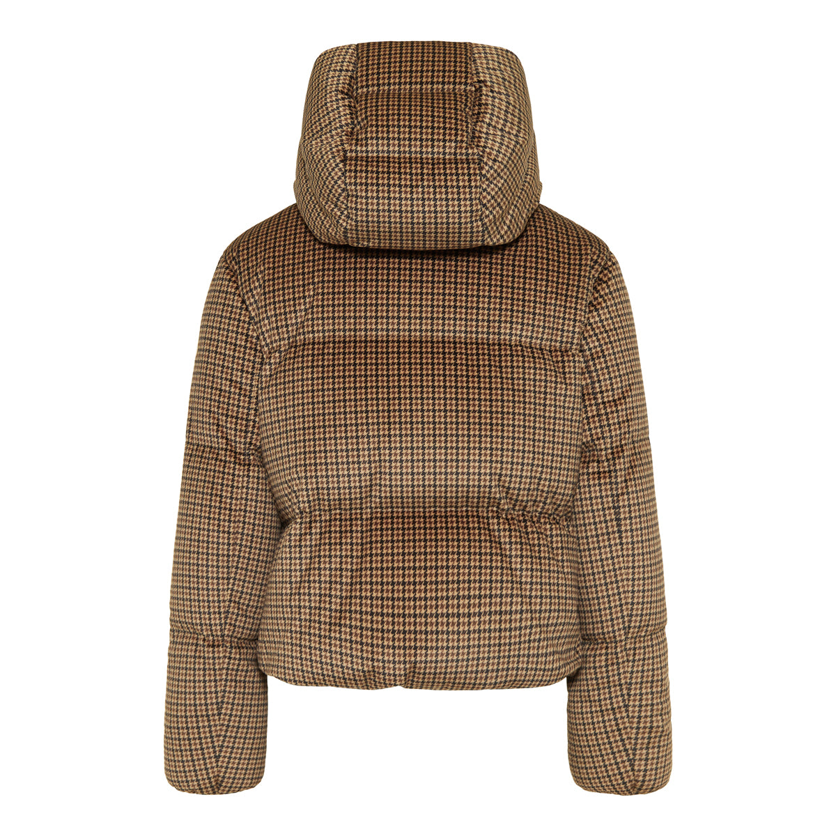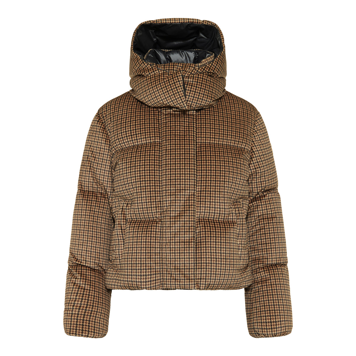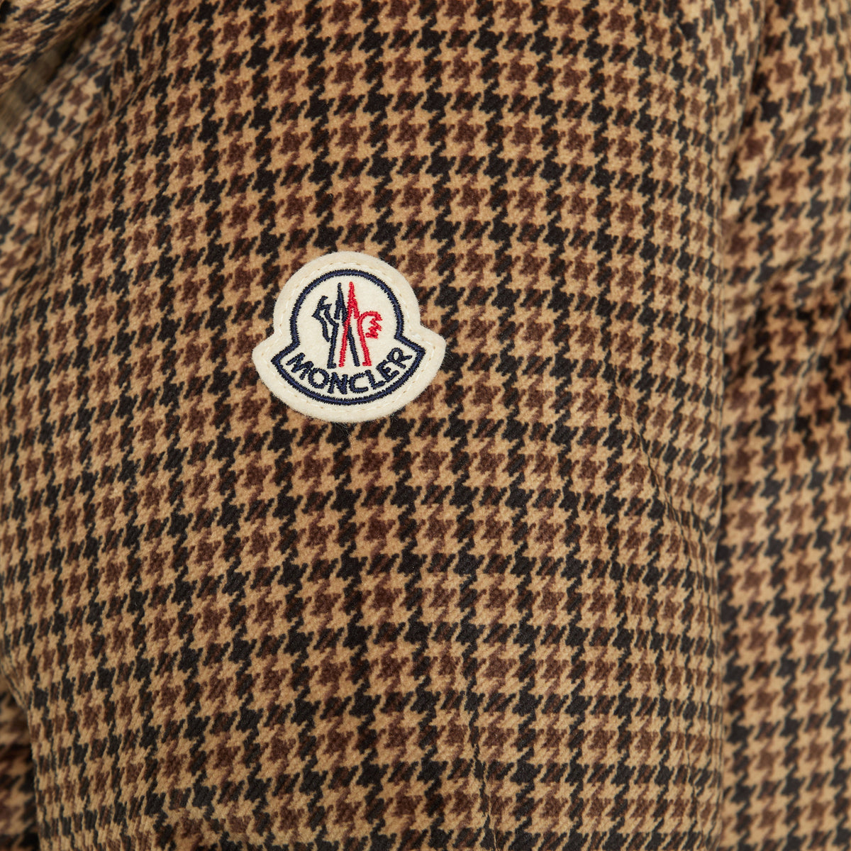 A stylish and functional brown down jacket from Moncler, featuring a micro-check pattern, detachable hood, and adjustable hem. Crafted from soft-touch polyester with a down-filled interior, it's designed for warmth and comfort.