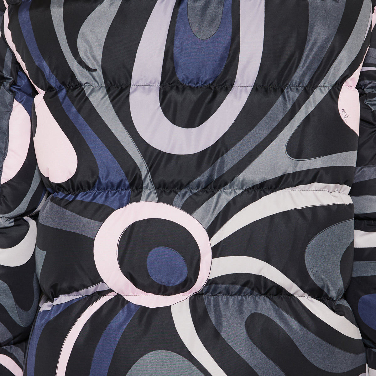 A vibrant puffer jacket fully printed in Pucci’s signature Iride stripes, featuring quilted padding, a high neck, drawstring hood, and full zip closure. The down fill and technical nylon shell make it ideal for cold climates while keeping a bold, fashion-forward edge.