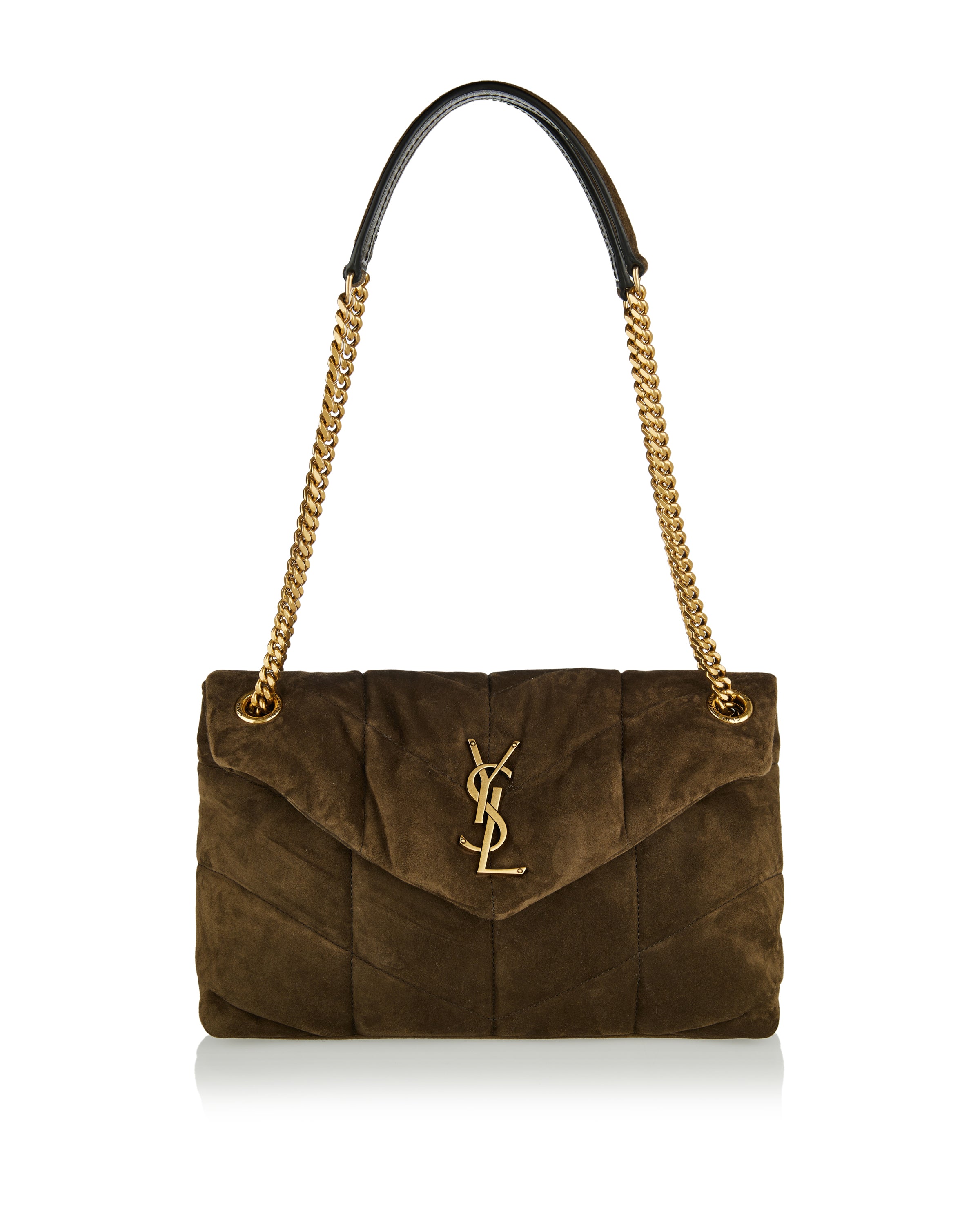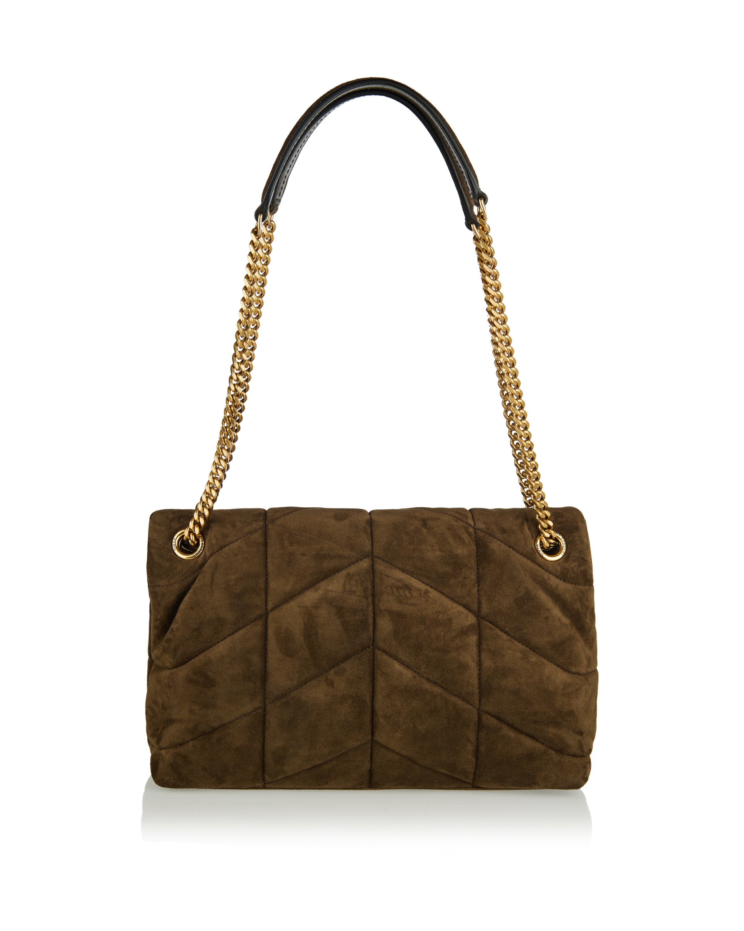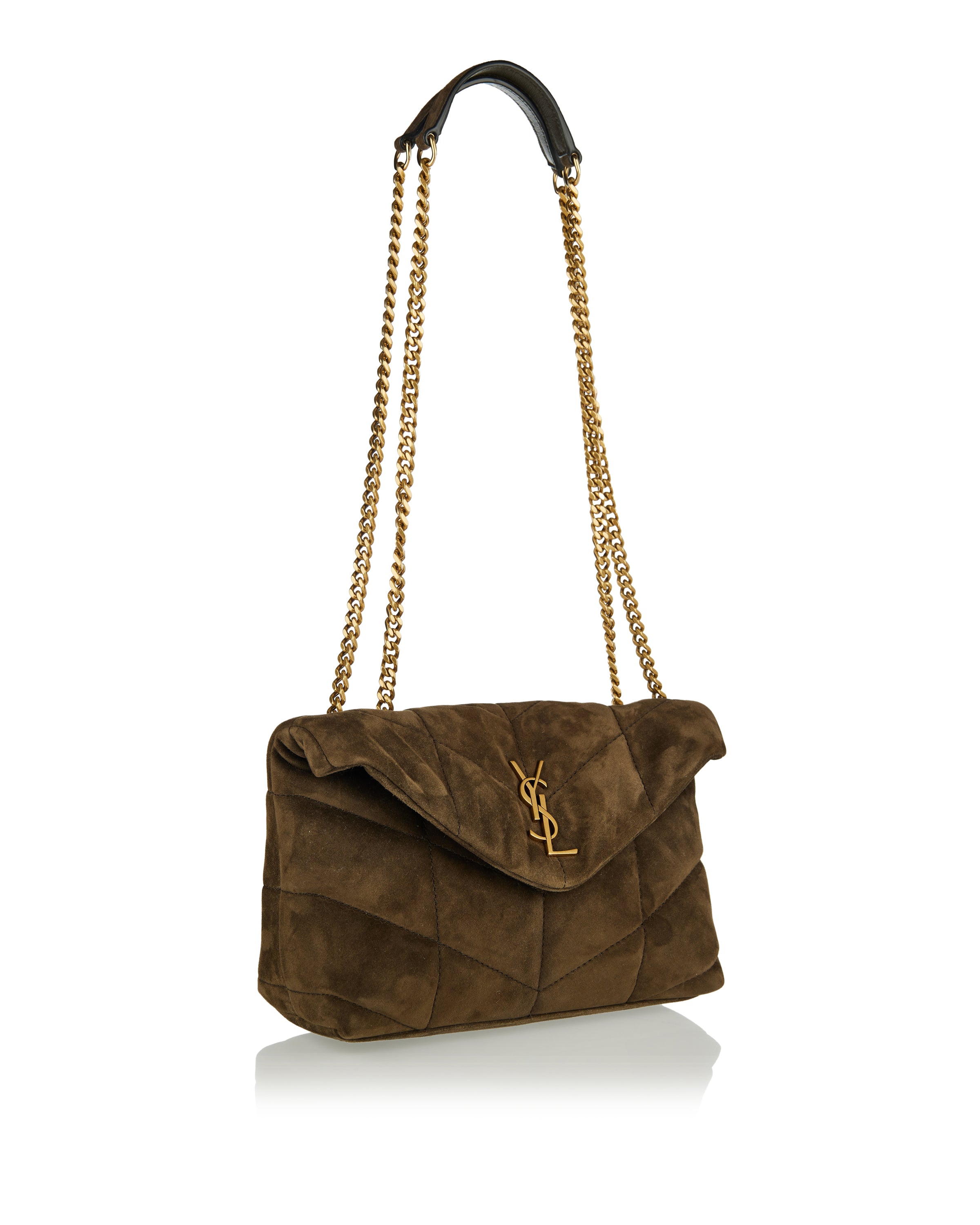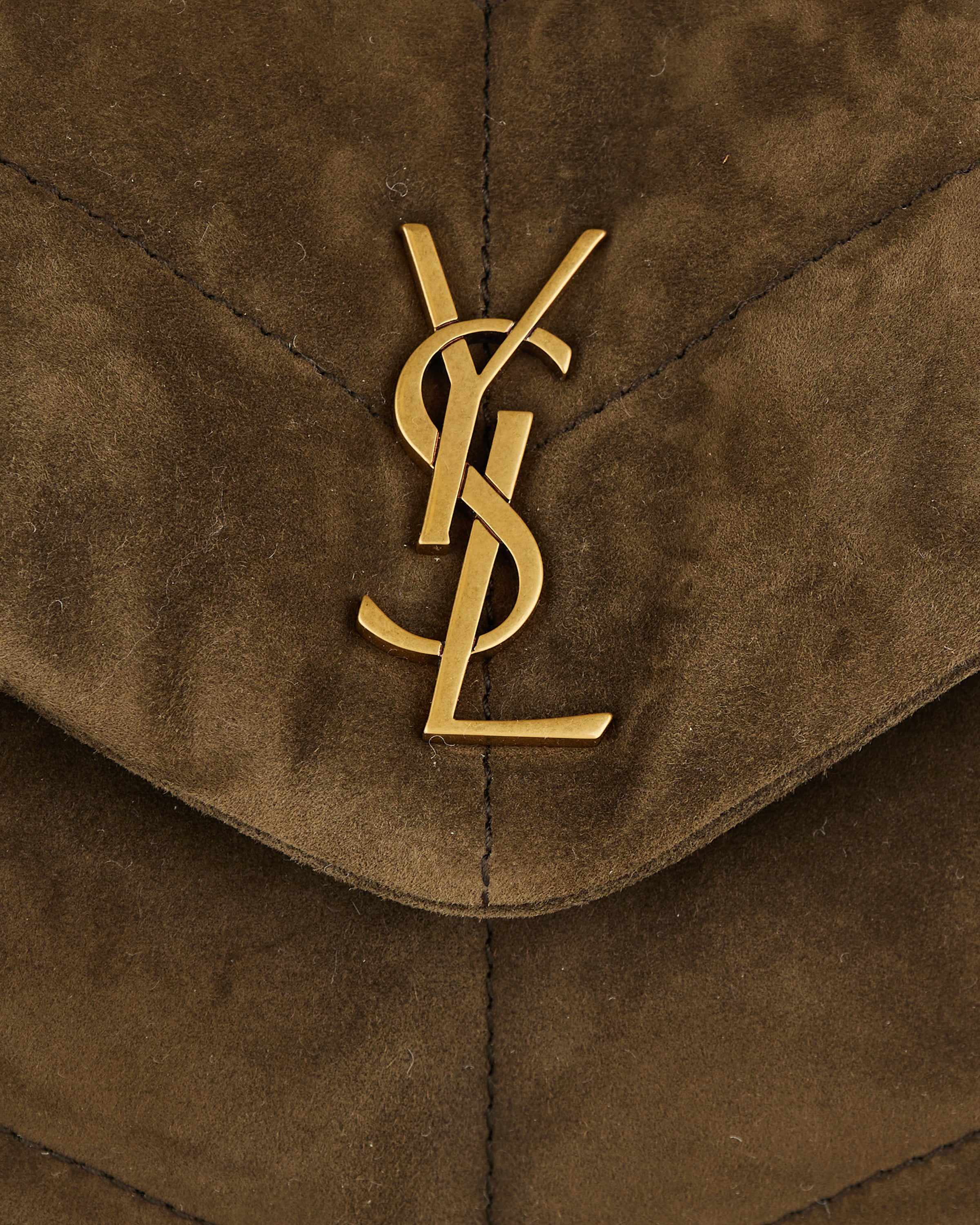 The Saint Laurent toy puffer bag in suede elevates everyday elegance with its chevron-quilted design and sliding chain strap for shoulder or crossbody wear. A refined accessory for both casual and formal ensembles, it combines timeless Parisian allure with luxurious soft suede and bronze-toned hardware.