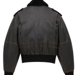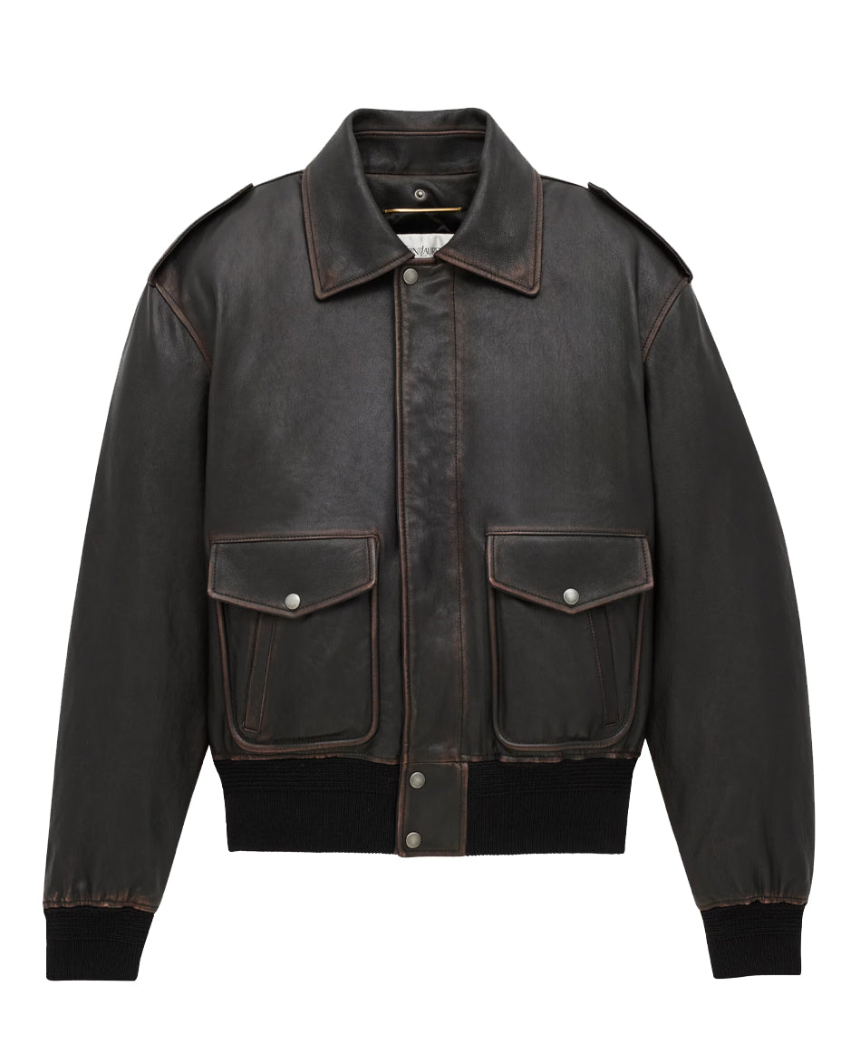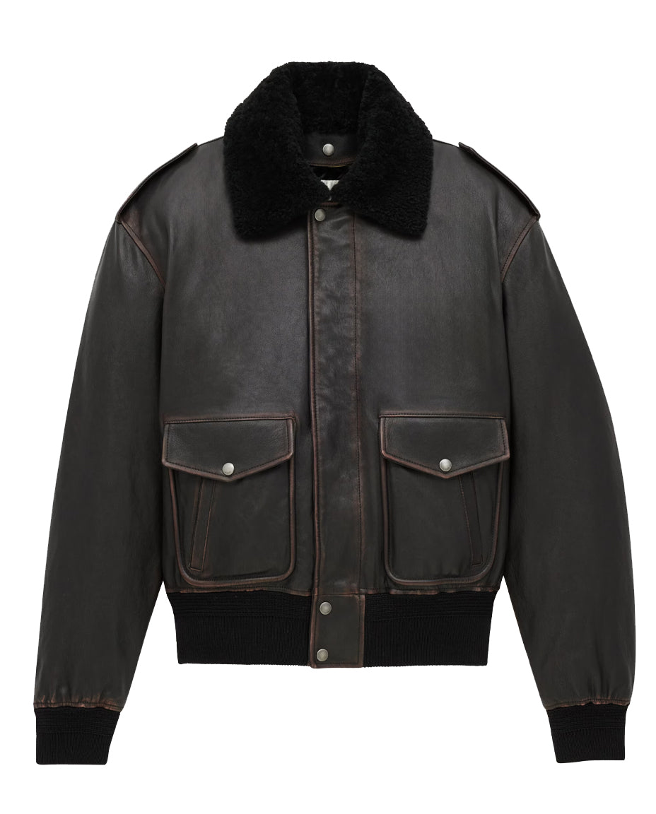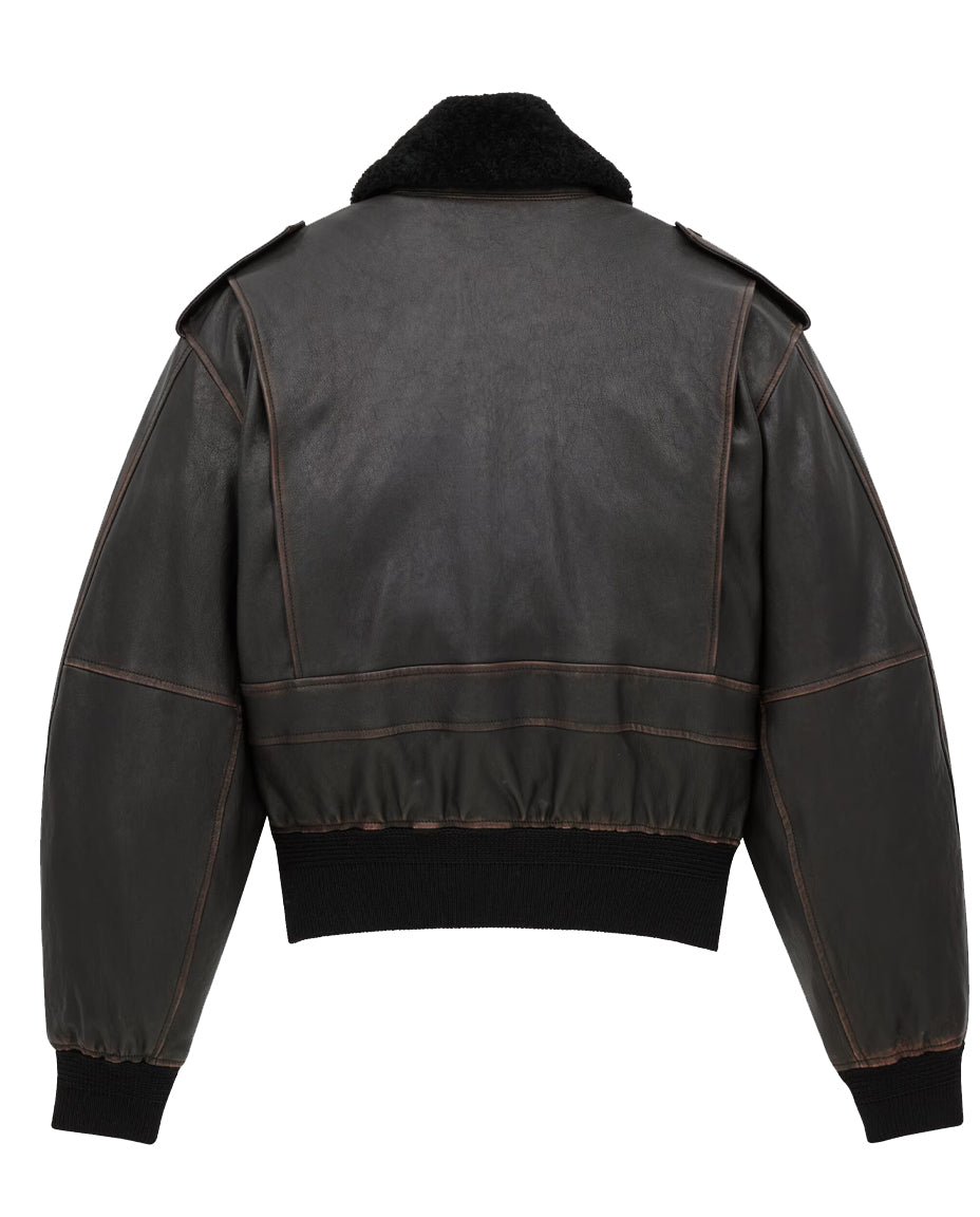 Designed with a bold yet refined silhouette, this bomber jacket is crafted from vintage-effect grained leather and accented with shearling for added depth and warmth. The structured shape balances classic bomber proportions with a luxurious, tactile finish, creating a statement outerwear piece that remains timeless. Polished and distinctive, it is suitable for everyday wear, refined city styling, and elevated cold-weather looks, offering contemporary sophistication with a confident, fashion-forward attitude.