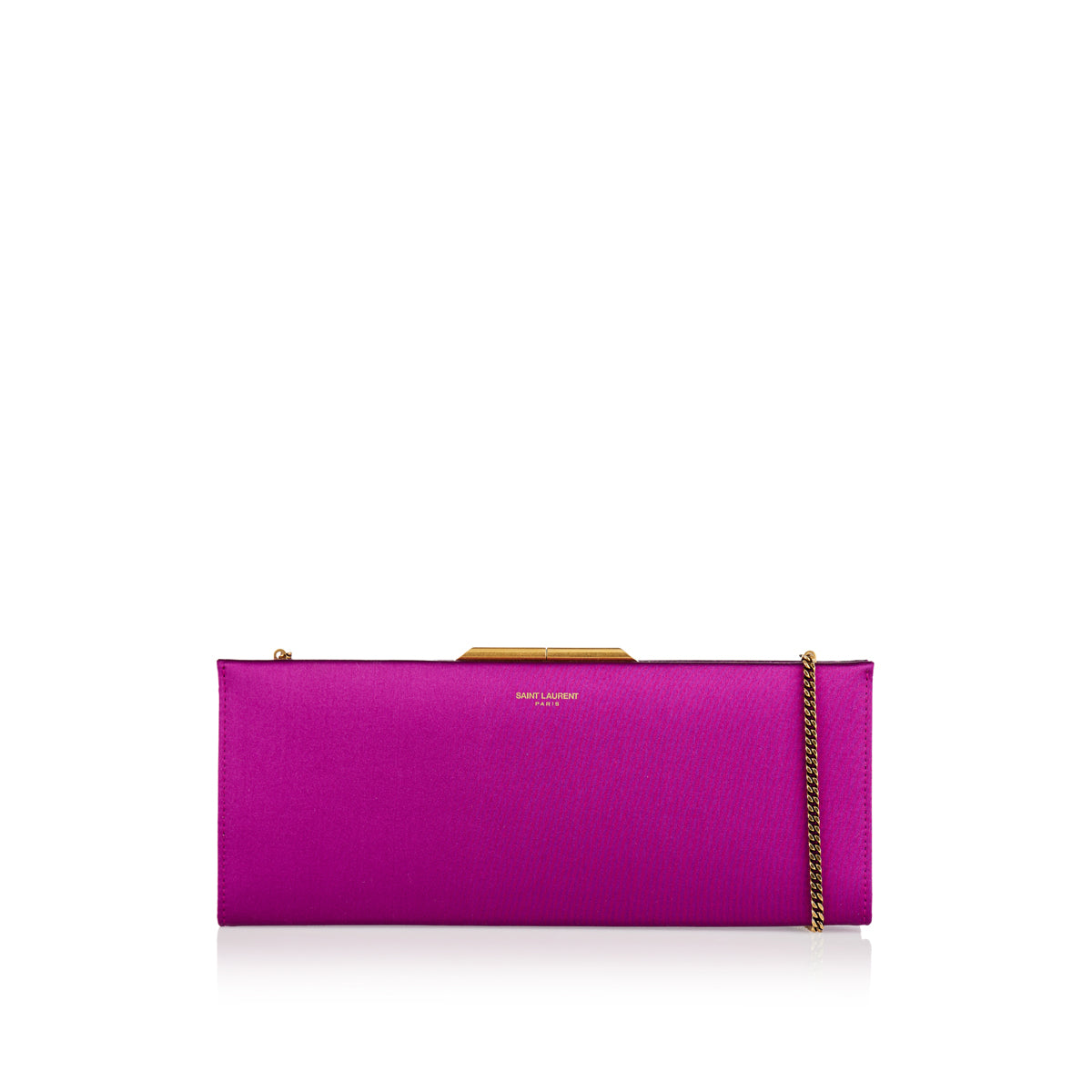 Elegant slim clutch in lustrous satin with gold-tone hardware and embossed logo. Features a stowable chain shoulder strap and a flat interior pocket. Ideal for evening events or as a refined day-to-night accessory.