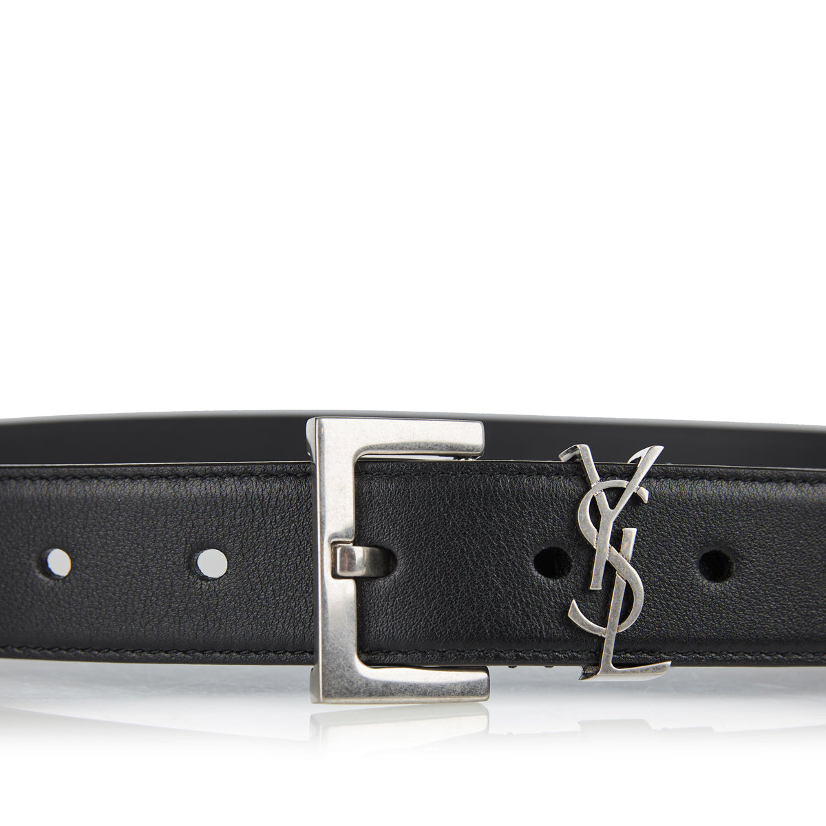 This elegant black belt from Saint Laurent is crafted from 100% calf leather, featuring a polished silver-tone square buckle adorned with the iconic Cassandre logo. Its slim profile and adjustable fit make it a versatile accessory, suitable for both formal and smart-casual occasions.