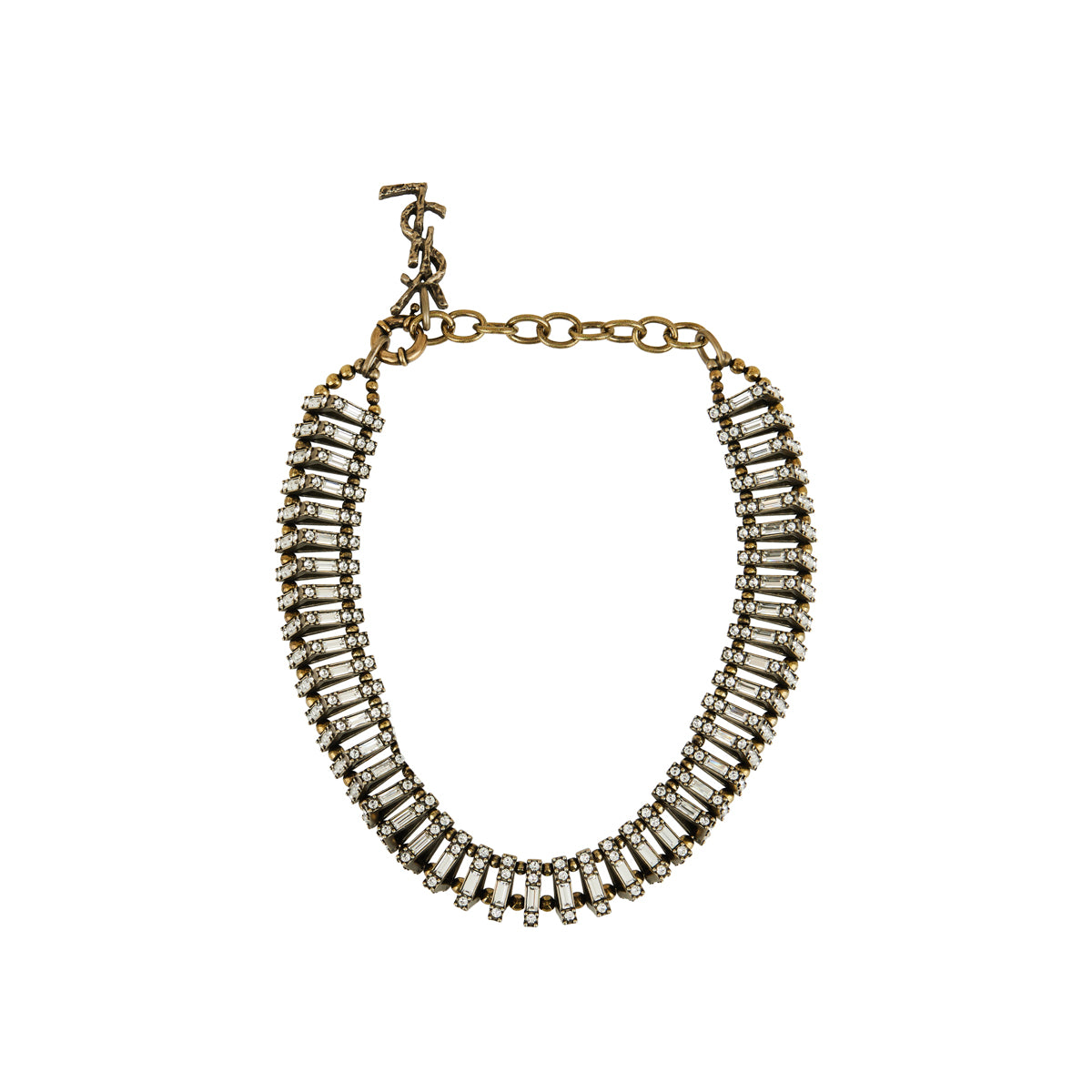 A bold triangular chain necklace by Saint Laurent, adorned with round and emerald-cut crystals set in aged-bronze tone metal. The adjustable clasp includes a Cassandre charm and engraved Saint Laurent detailing.