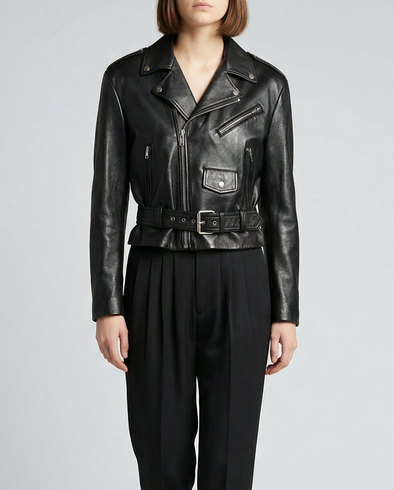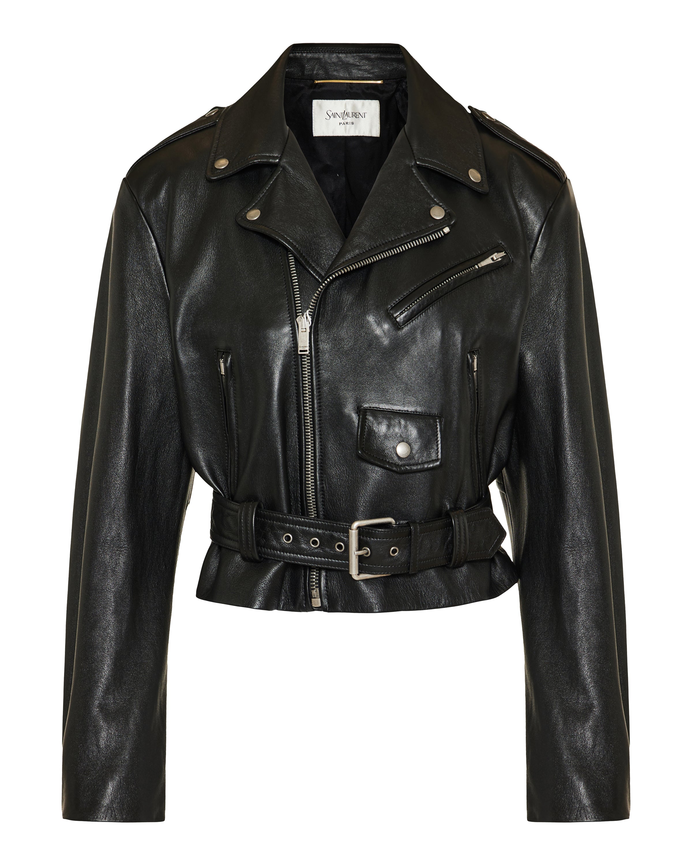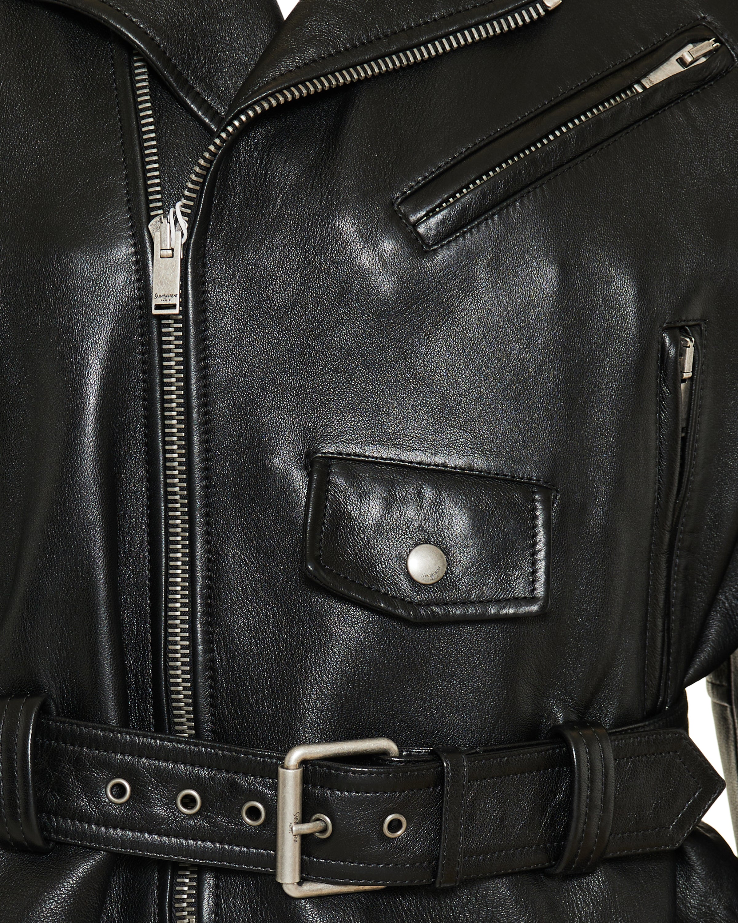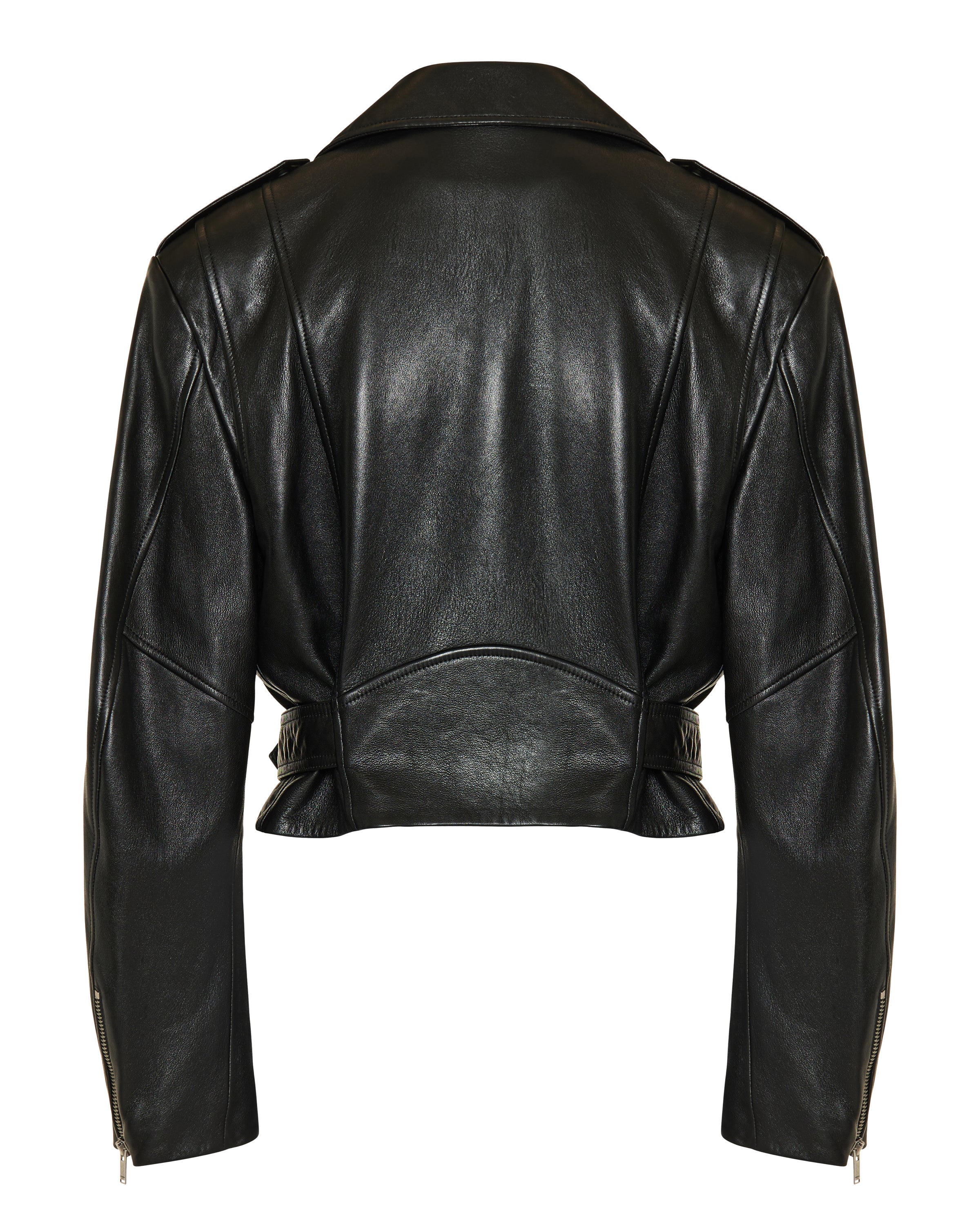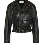 A sleek and edgy biker jacket in supple lambskin, defined by a tailored silhouette and refined hardware details for a modern luxury look.