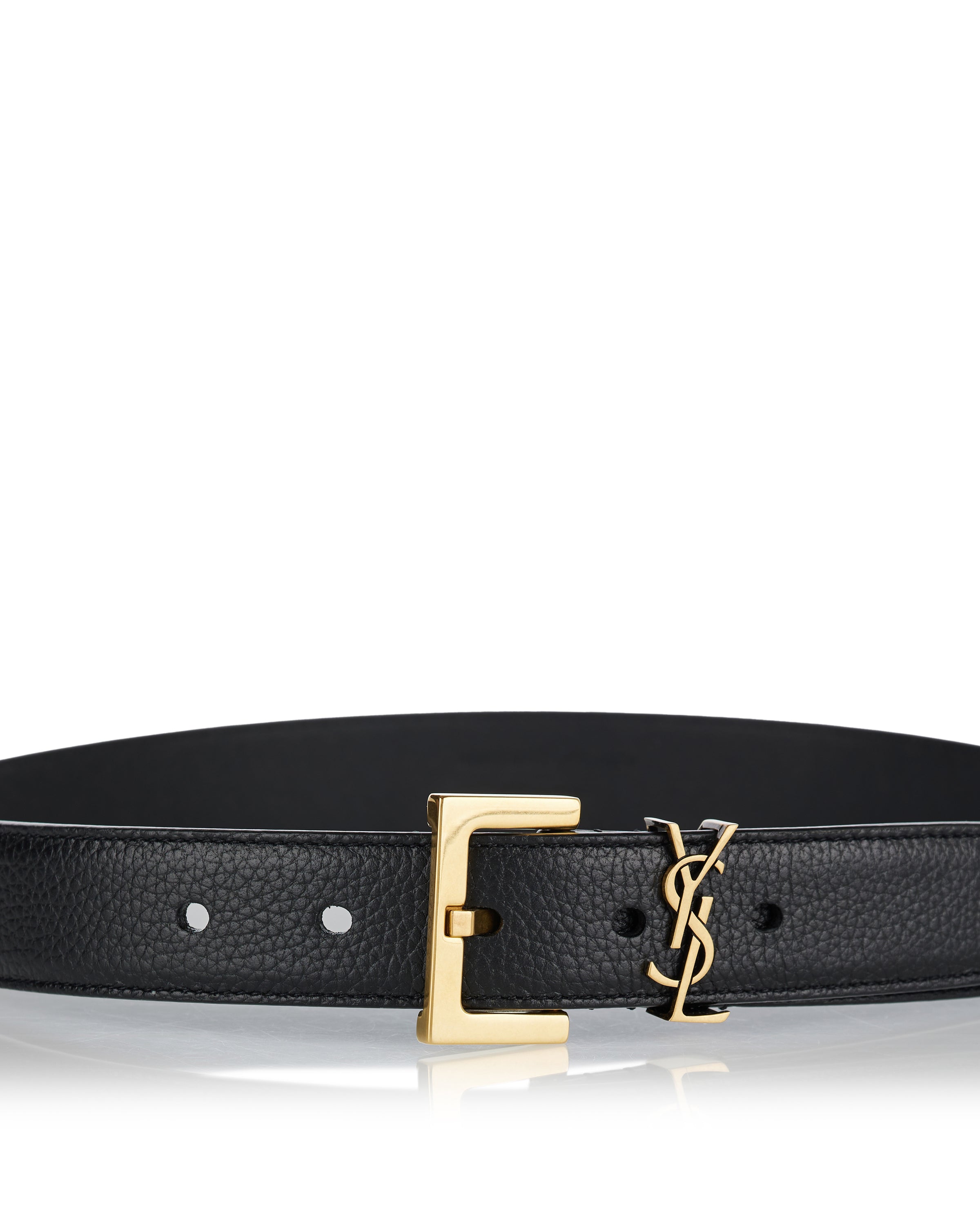 Slim belt crafted in textured grained leather, defined by the iconic Cassandre logo buckle in polished metal. A timeless accessory designed to elevate tailoring and everyday denim alike.- Grained leather construction
