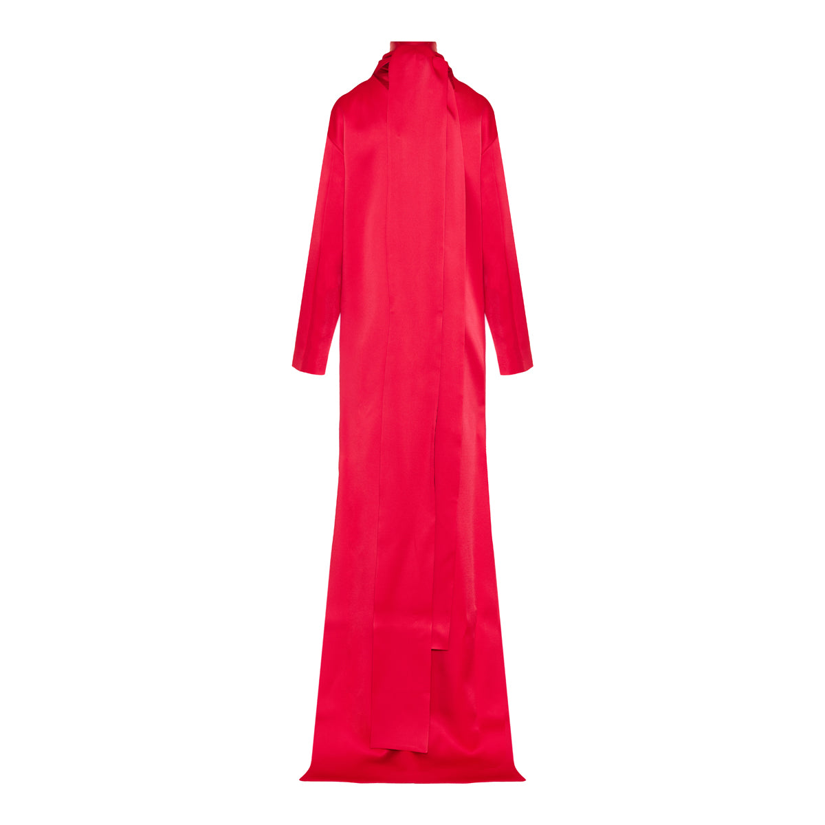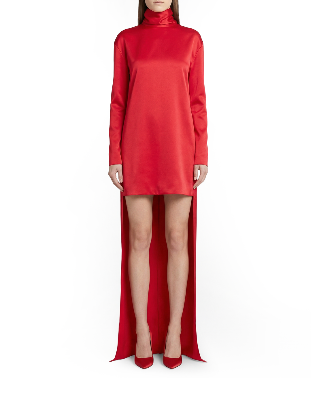 A sculptural cocktail dress from Tom Ford, crafted in fluid crêpe with a dramatic scarf detail cascading from the mock neckline and an asymmetric hemline. Lined in silk with panels of varying lengths, it exudes refined elegance for formal evenings and high style events.