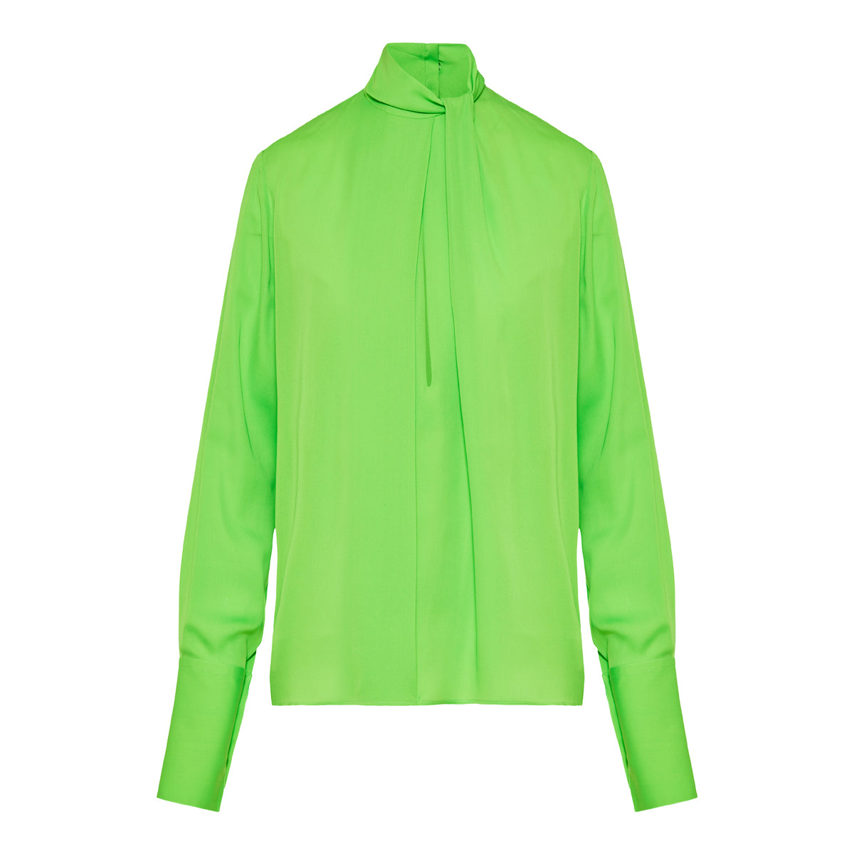 Crafted from 100% silk georgette, this Tom Ford blouse features a stand collar, deep knife pleat at the center front, and a concealed hook-and-eye closure at the center back collar. The blouse is finished with self-covered buttons on the cuffs, offering a refined and elegant silhouette.