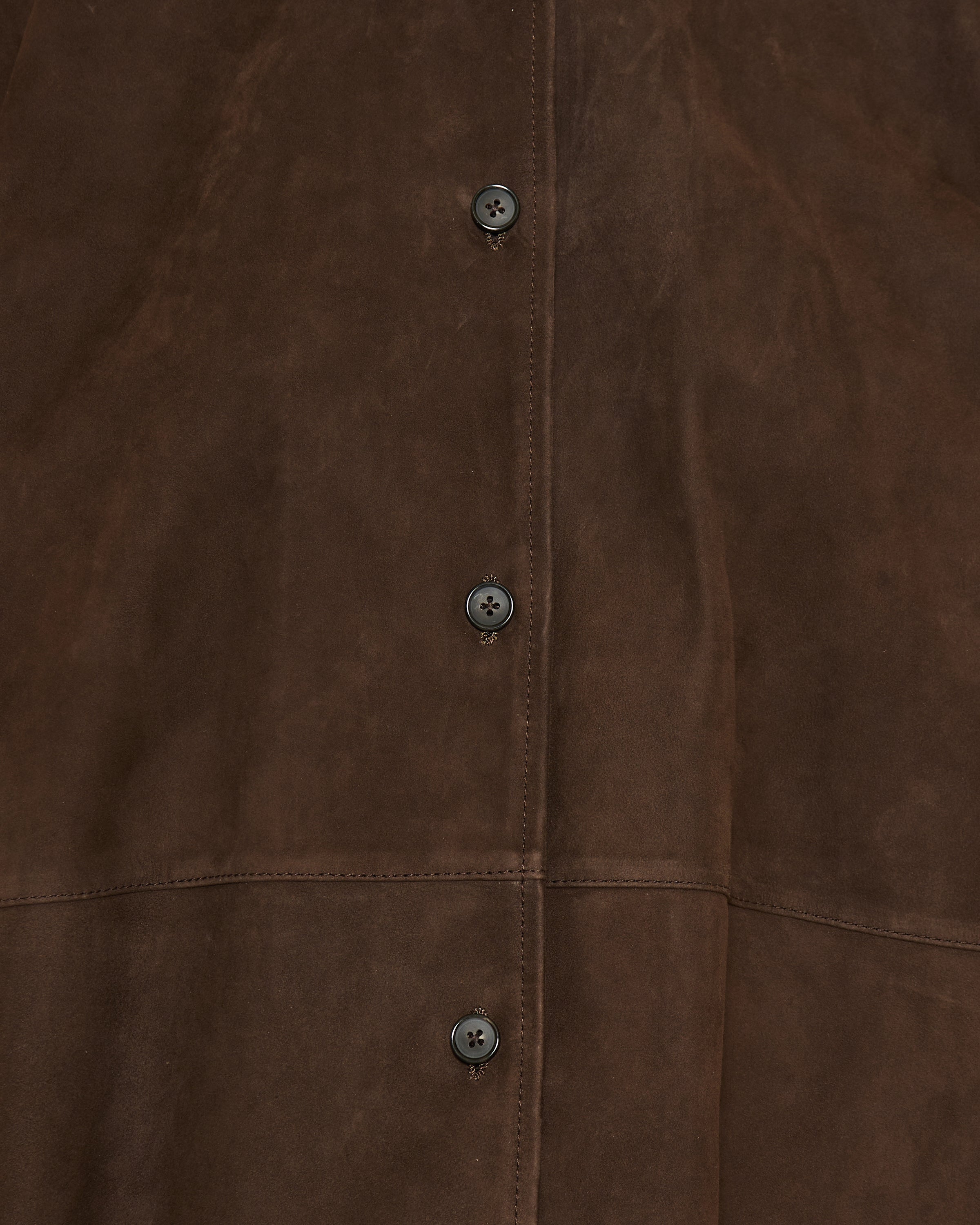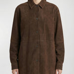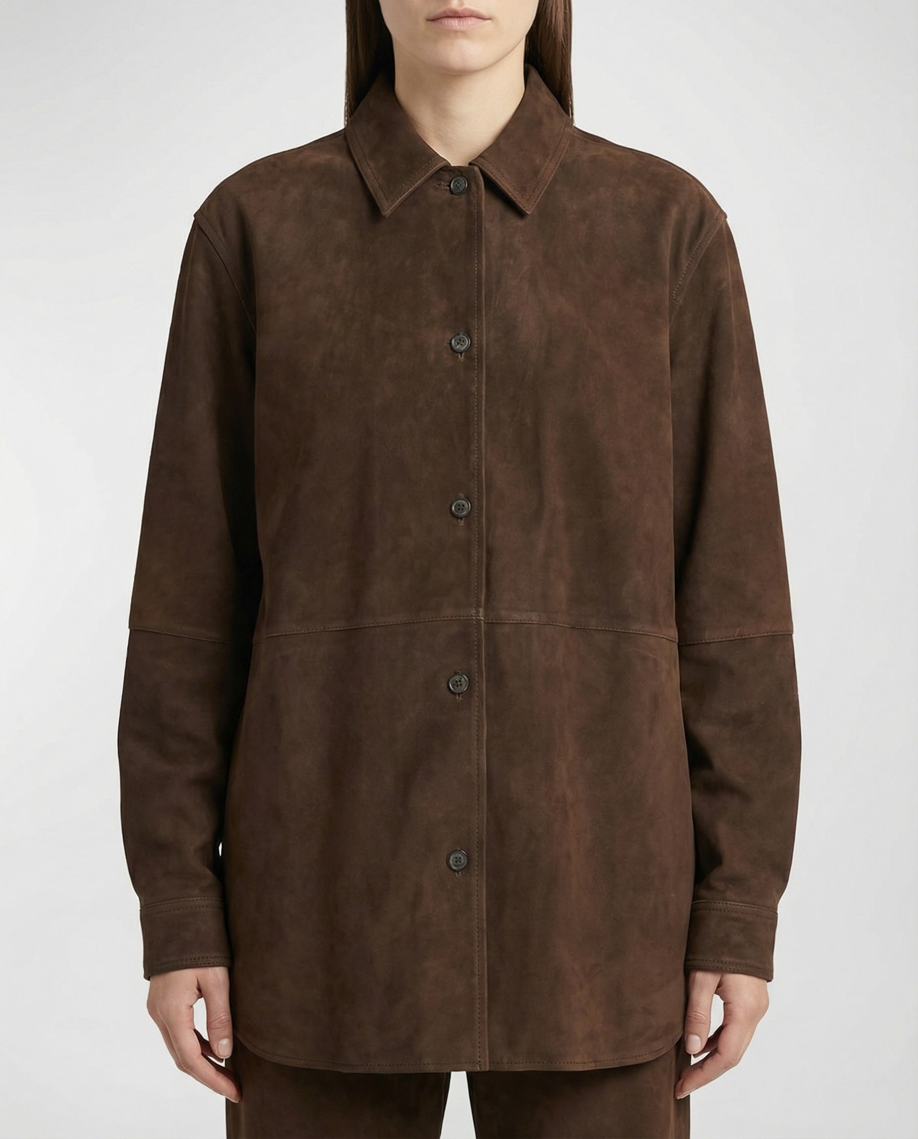 Refined suede overshit crafted from supple lambskin with a classic point collar and button‑through front for versatile styling. Cut for a relaxed, layering‑friendly silhouette, this elevated piece brings understated Scandinavian luxury to transitional and elevated casual wardrobes.