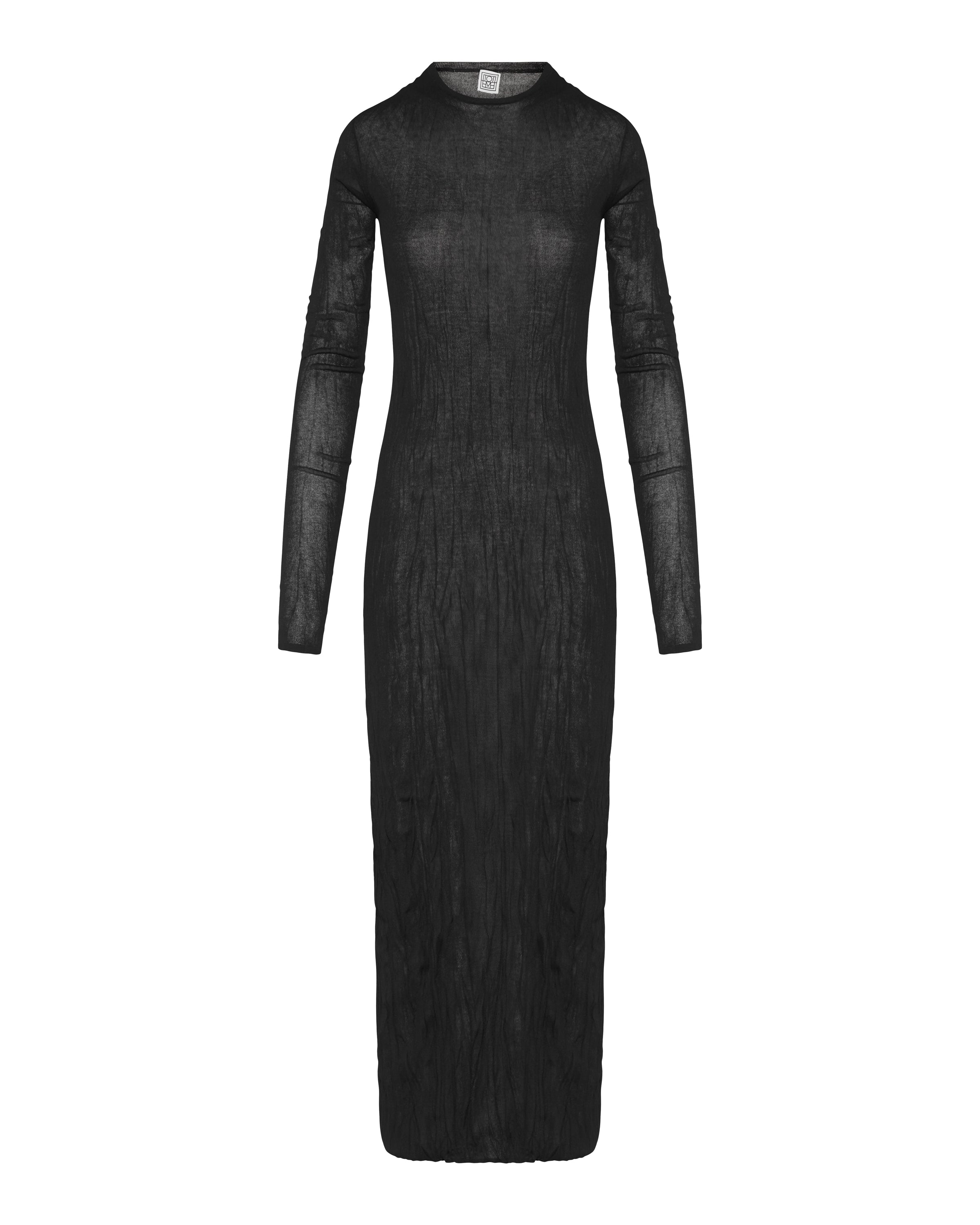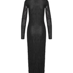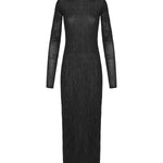 A sleek and elegant maxi dress in lightweight fabric, defined by finely pleated details and a flowing silhouette for modern sophistication.