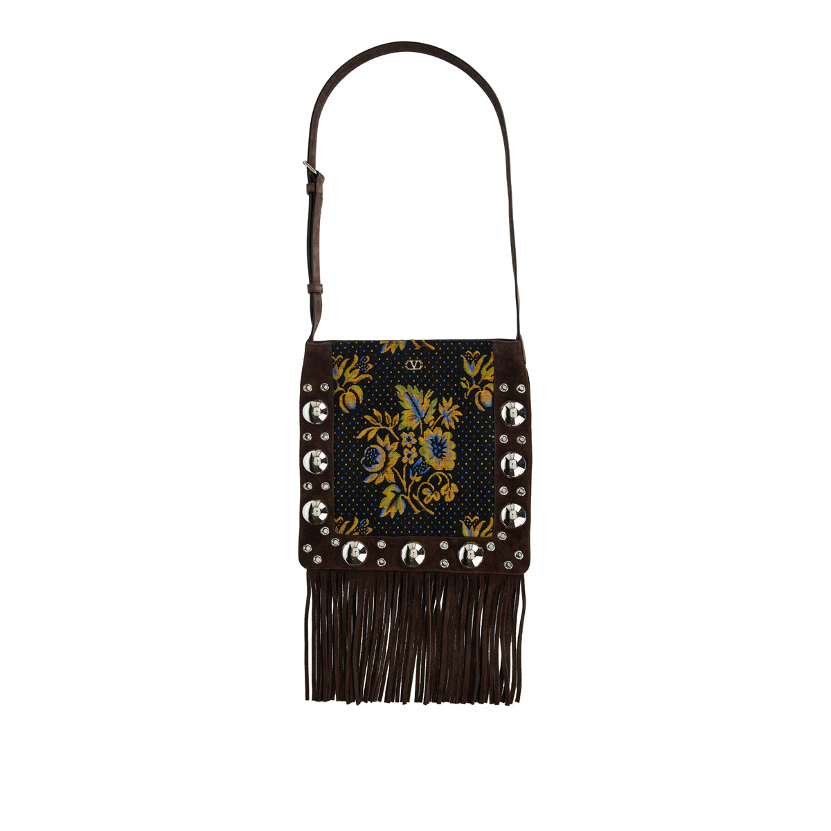 Elevate your style with the Valentino Garavani Nellcôte Shoulder Bag, a masterpiece of craftsmanship. Designed in exquisite jacquard fabric with delicate fringe detailing, this statement accessory blends vintage allure with contemporary sophistication. Finished with the signature VLogo chain strap, it exudes effortless luxury for the modern connoisseur.
