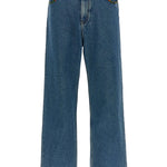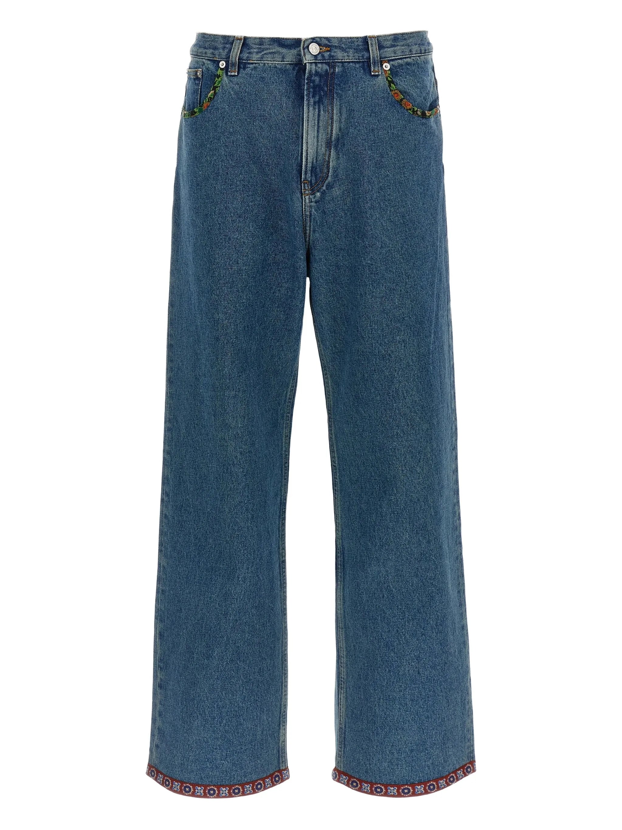 Denim jeans defined by a classic silhouette and contrasting floral inserts, blending everyday structure with refined statement detailing.