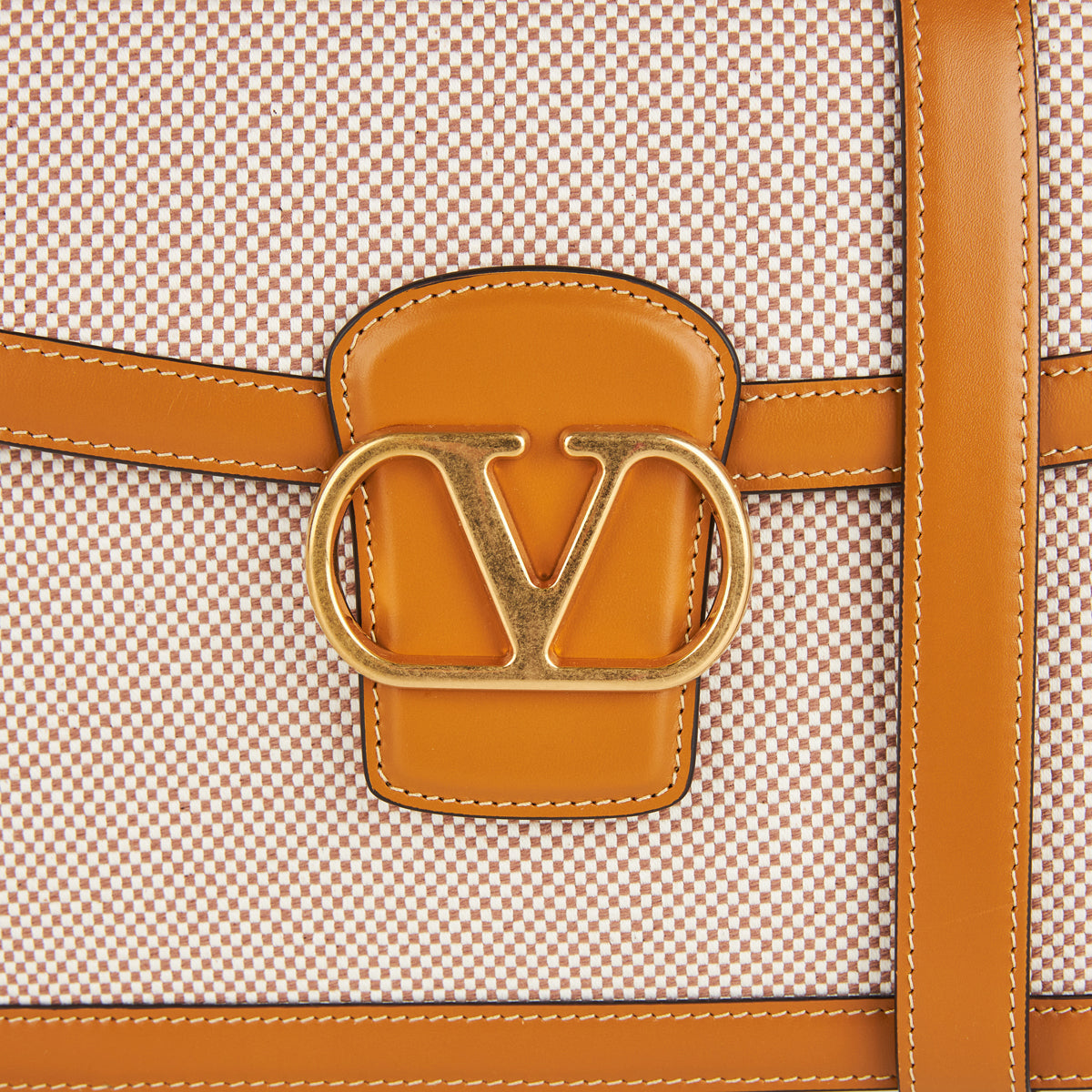 This Valentino Garavani 9TO5 shoulder bag in canvas features leather trims and VLogo Signature closure. It also comes with adjustable leather shoulder strap and three compartments on the inside.