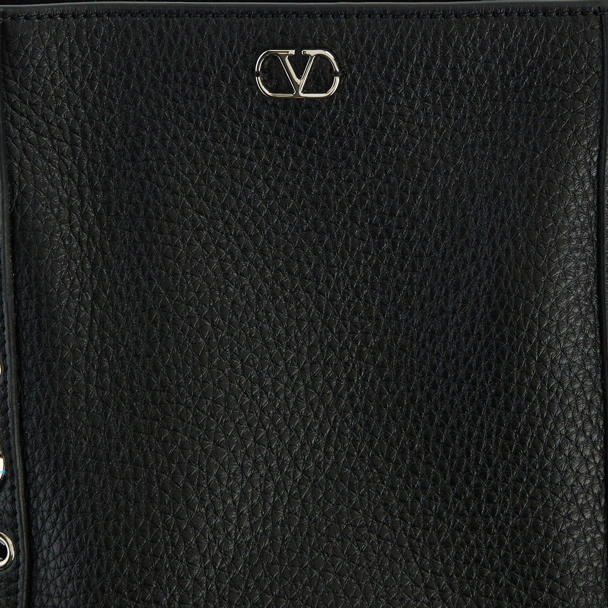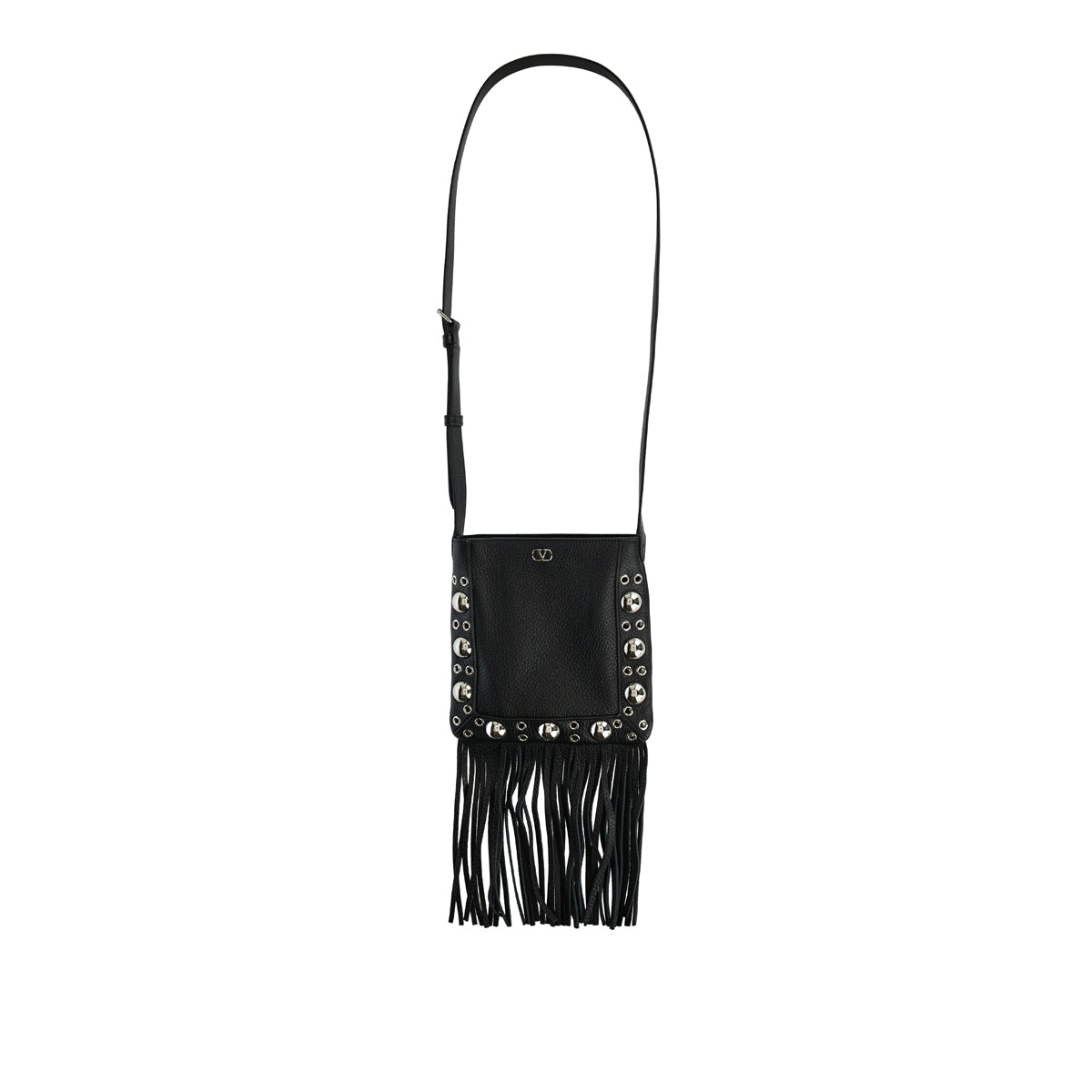 Valentino Garavani’s crossbody bag is crafted from supple black leather, offering a sleek and versatile design for daily use. With its compact rectangular silhouette, adjustable strap, and discreet logo detailing, it balances practicality with understated elegance, making it an essential urban accessory.