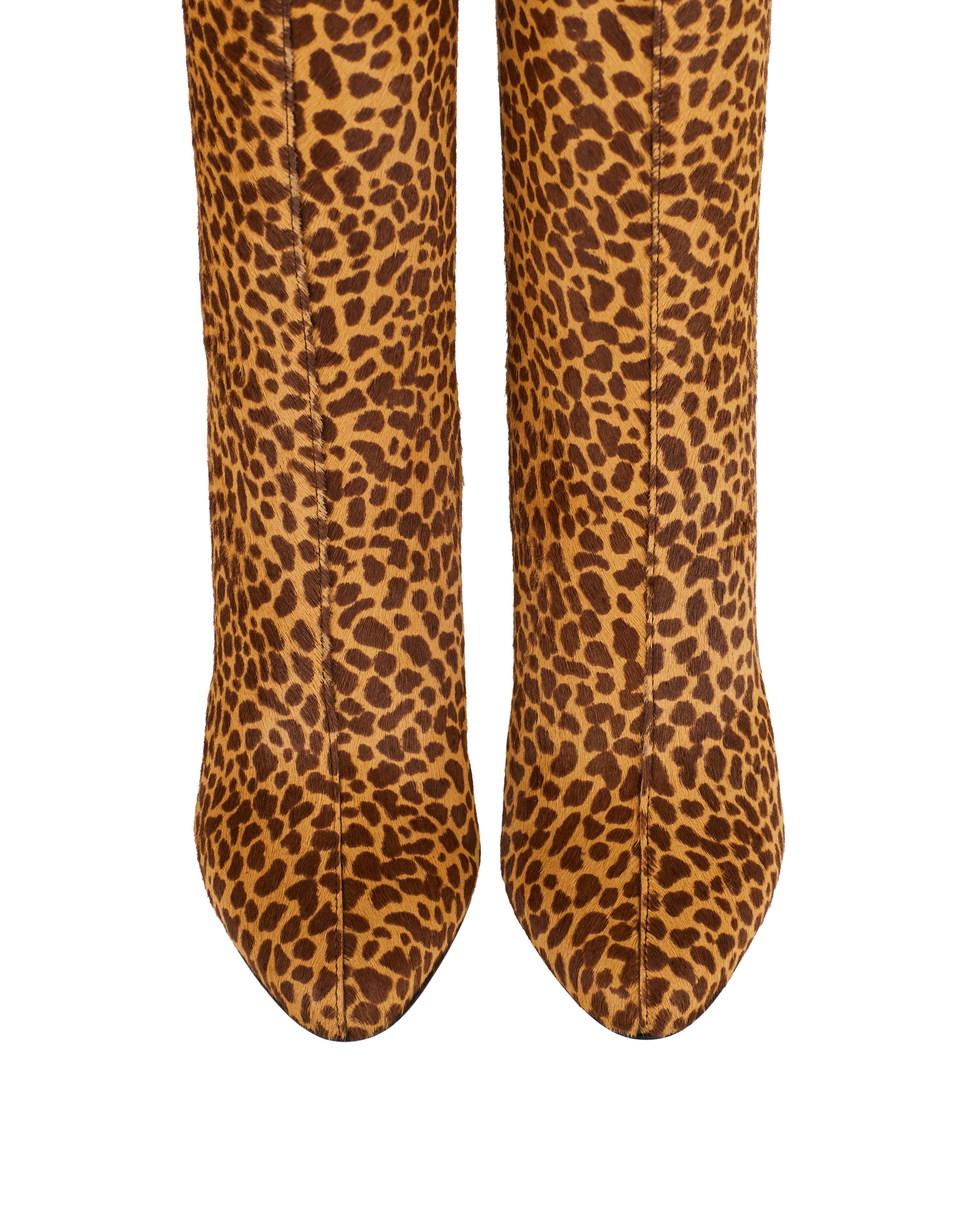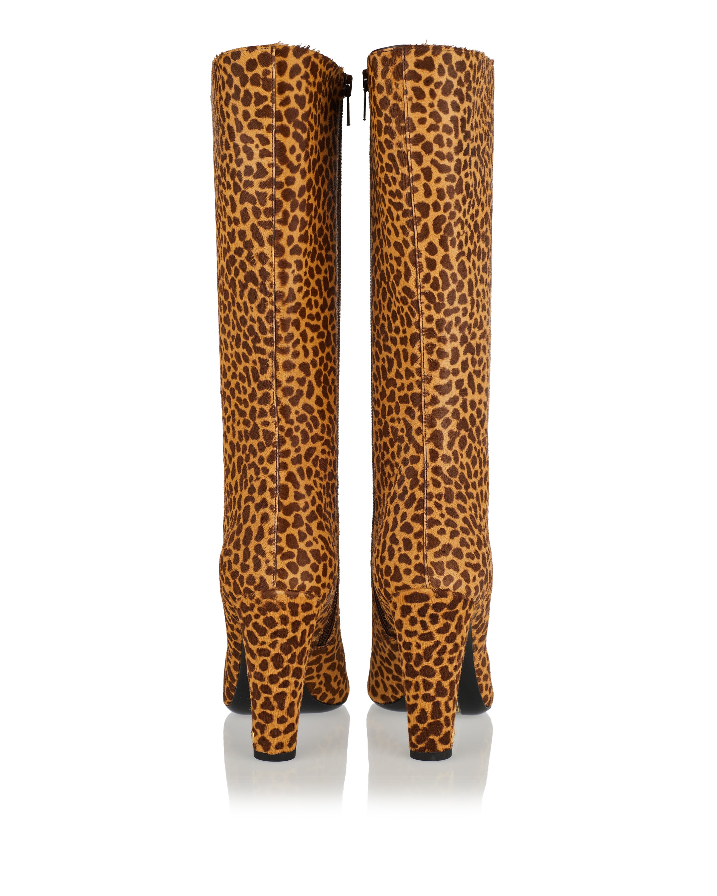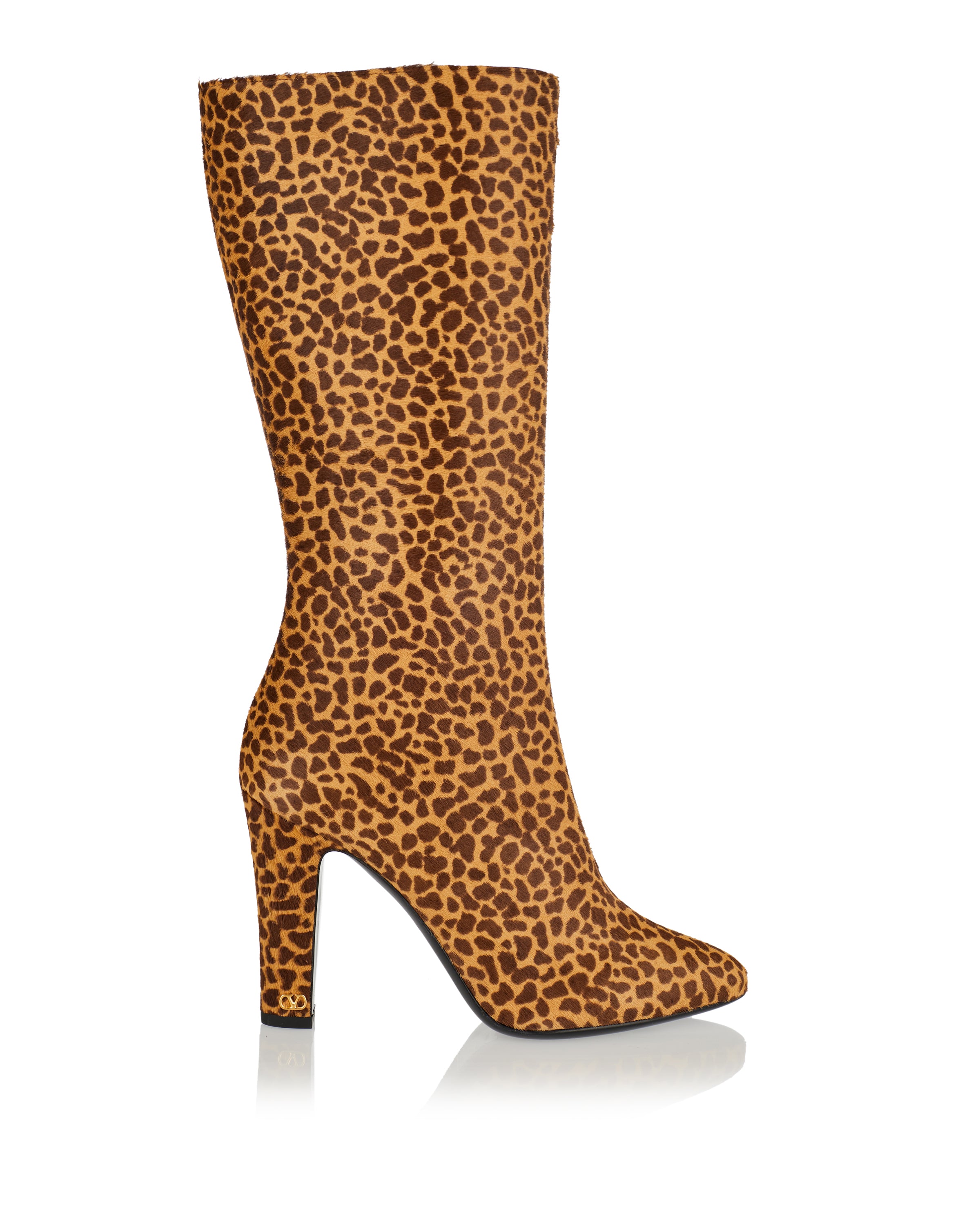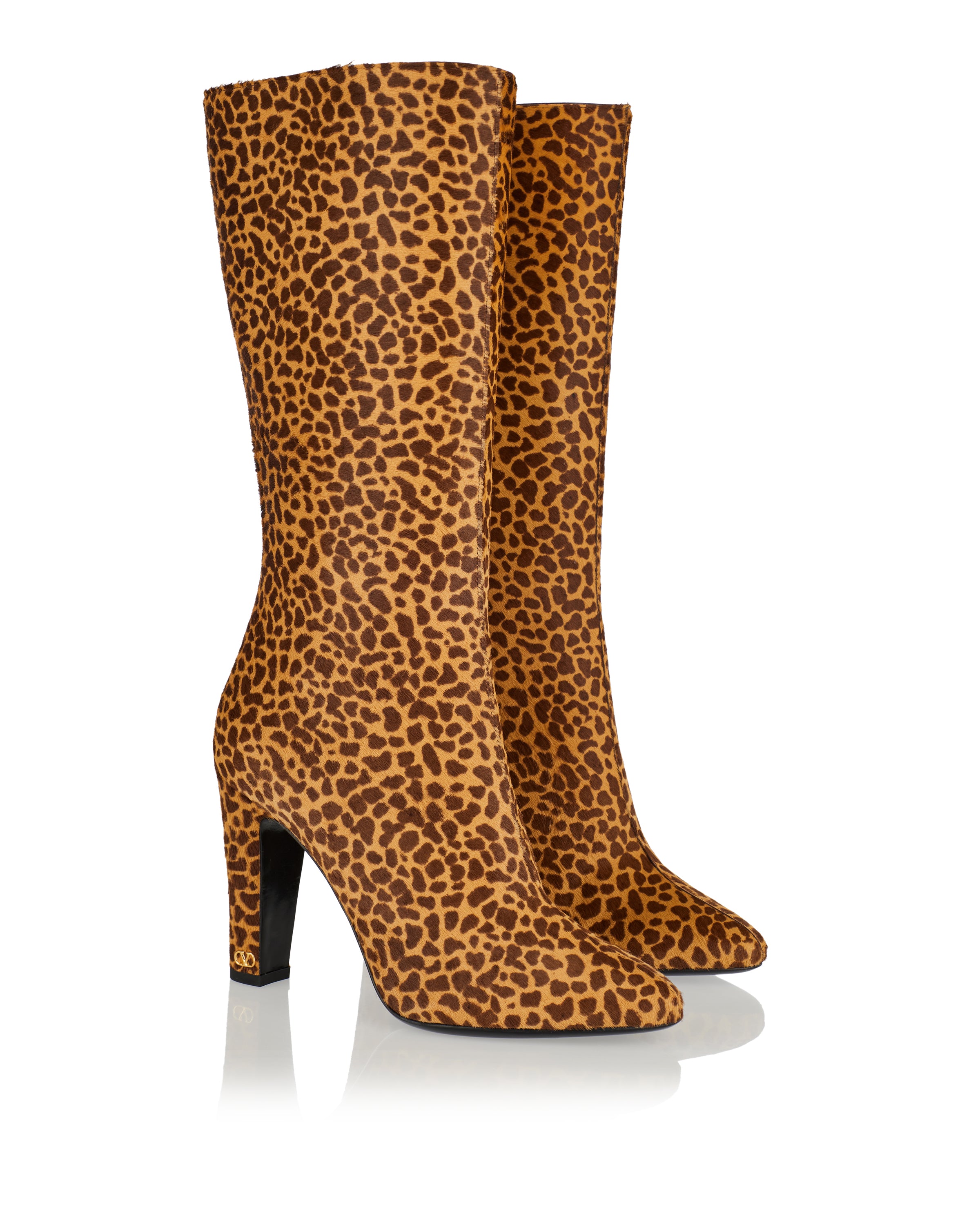 Statement knee‑high boots in leopard‑print calf hair with an almond toe and block heel, crafted in Italy by Valentino Garavani. The bold animal print and sleek silhouette elevate even the simplest outfits, while the side zip fastening ensures easy wear. Ideal for pairing with dresses, skirts or tailored trousers for refined day‑to‑night style.