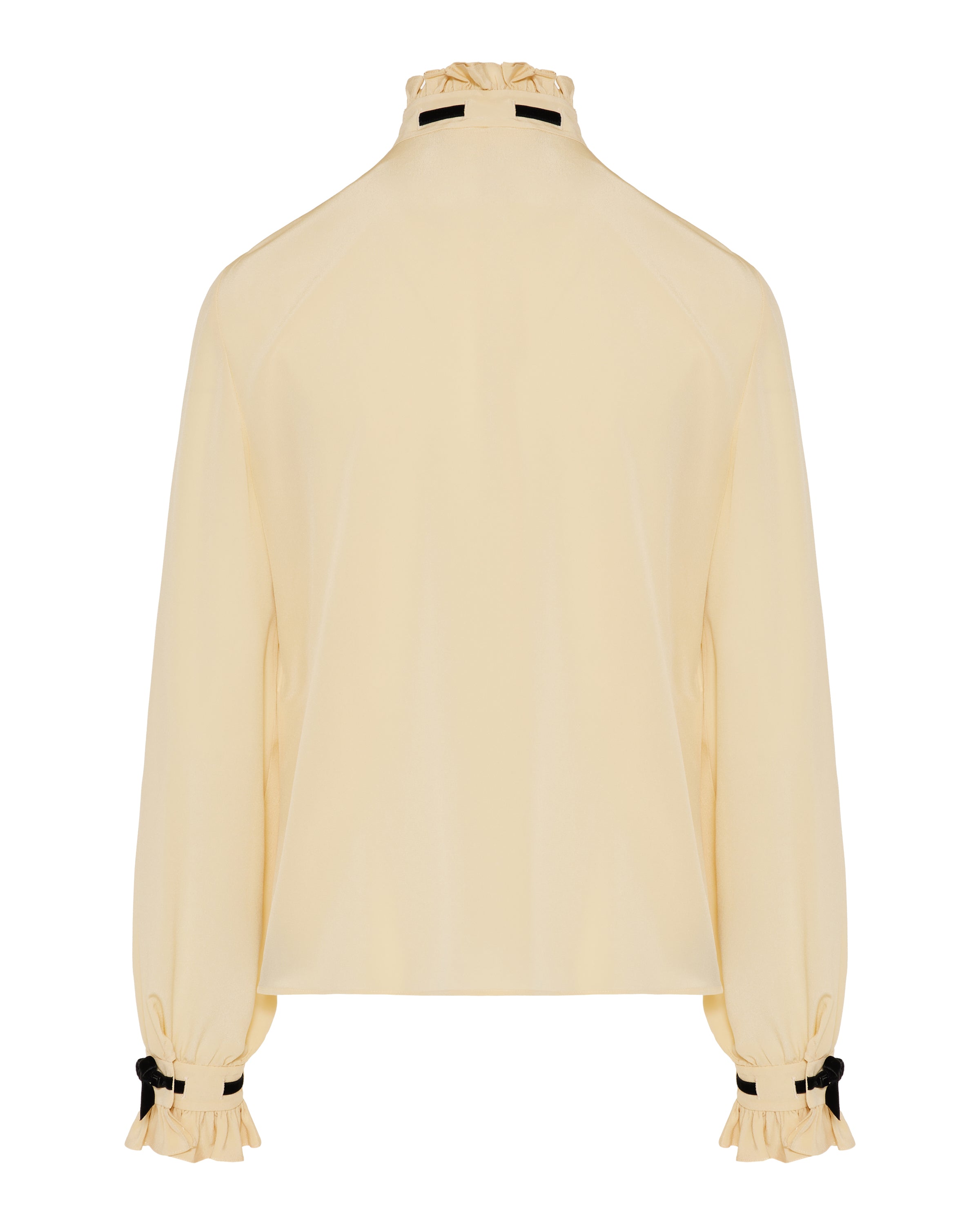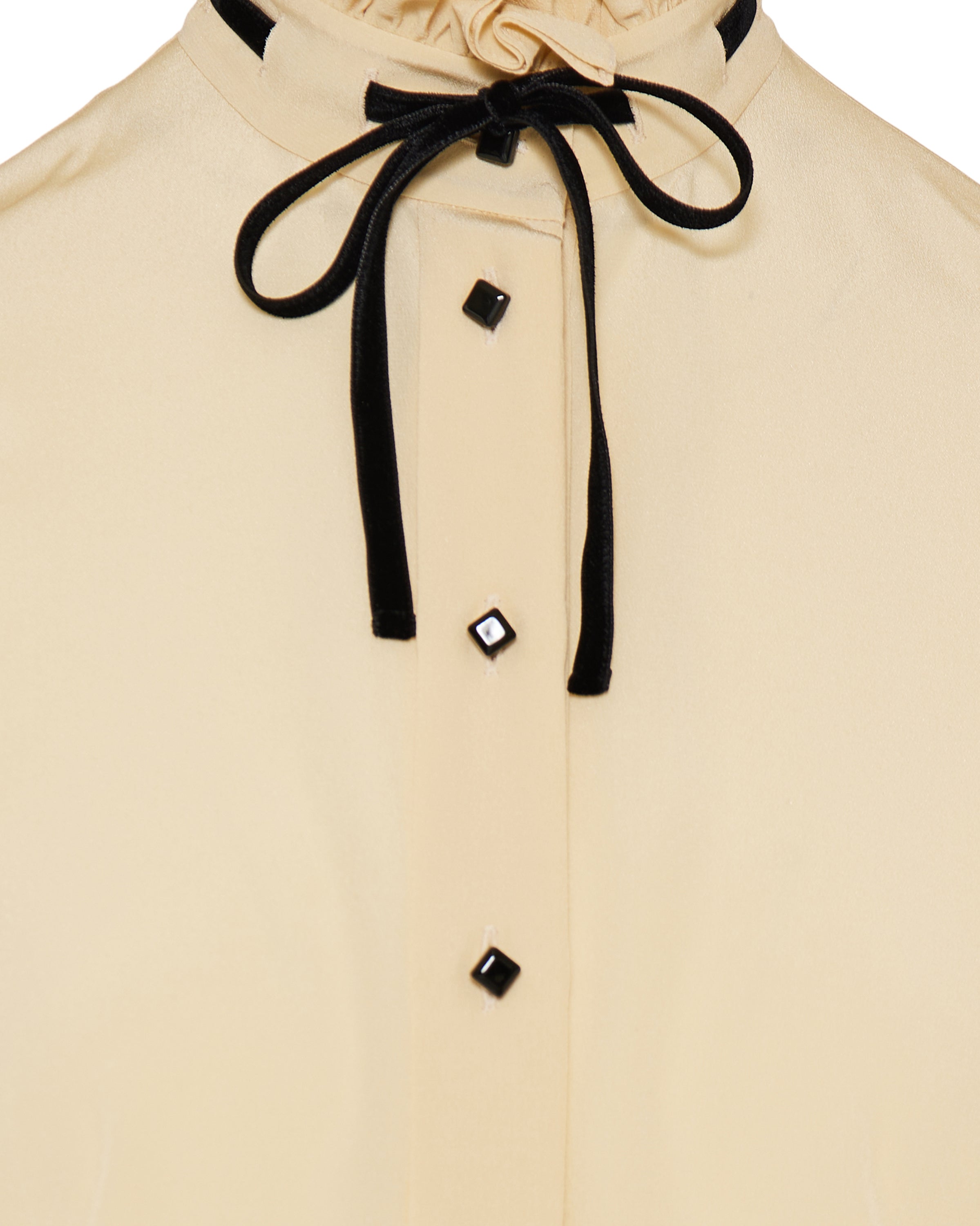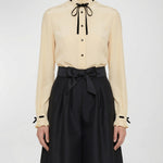 A refined Valentino crepe de chine shirt in birch/black crafted from fluid silk with elegant ruffle and velvet ribbon detailing at the collar and cuffs, and a classic button‑front closure. Designed for elevated daytime and smart‑casual wardrobes, it combines Italian craftsmanship with timeless couture sophistication.
