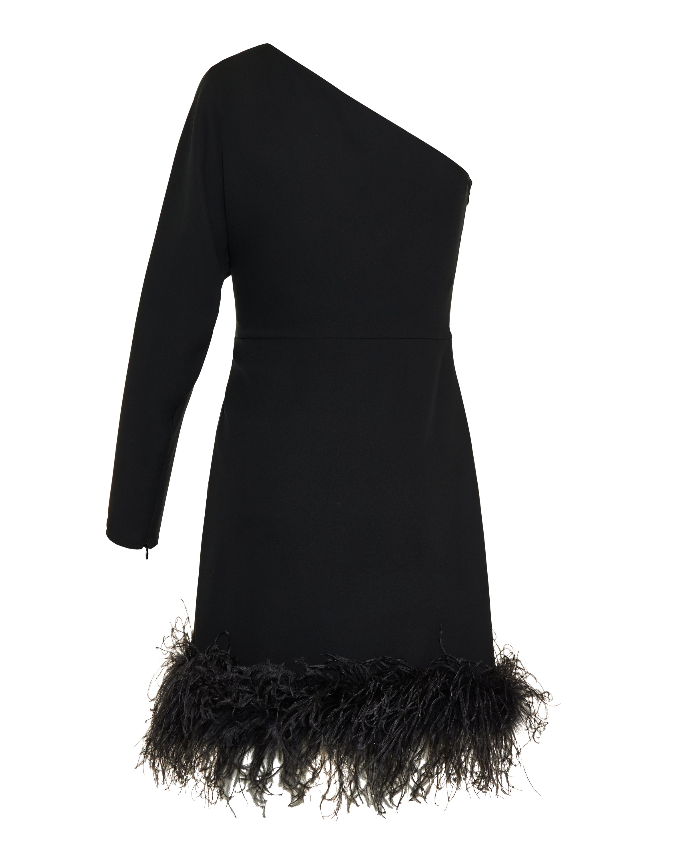 A sculptural one‑shoulder silk dress in black, elevated with dramatic feather trim for a striking, couture‑inspired silhouette. Crafted in Italy, this statement piece blends refined tailoring with tactile glamour, making it ideal for elevated evening occasions and red‑carpet events. Its luxurious finish and elegant lines define contemporary sophistication.