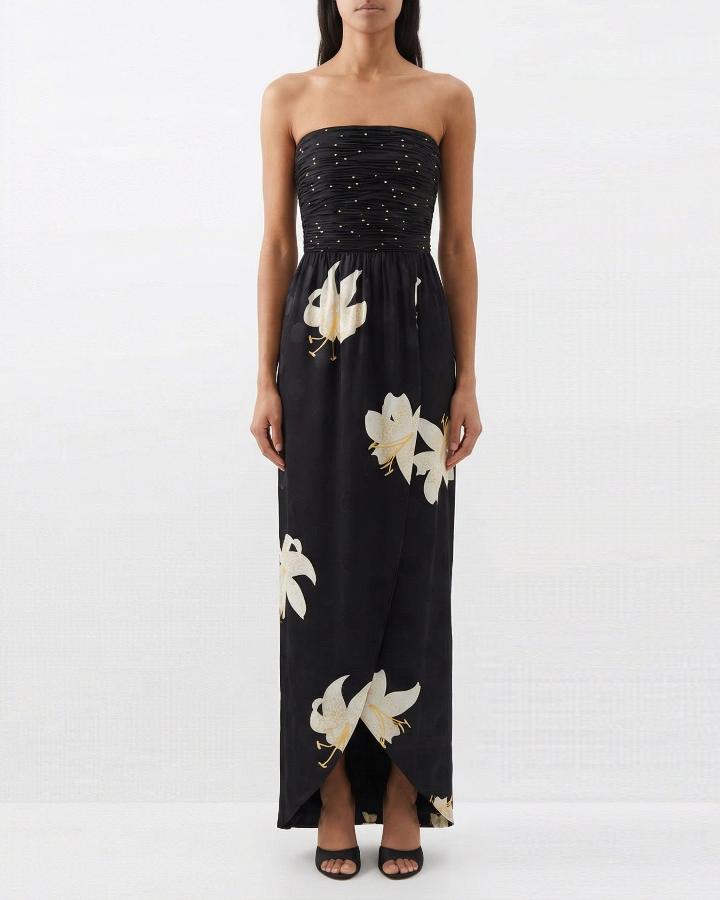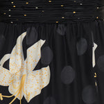 A luxurious long dress in black featuring Valentino’s signature Apres L’Hiver Lilium jacquard pattern in fine crepe de chine silk. Designed with handcrafted draping at the bodice and a front slit, this Italian‑made silhouette combines couture elegance with fluid movement. Ideal for elevated formal and refined evening occasions.