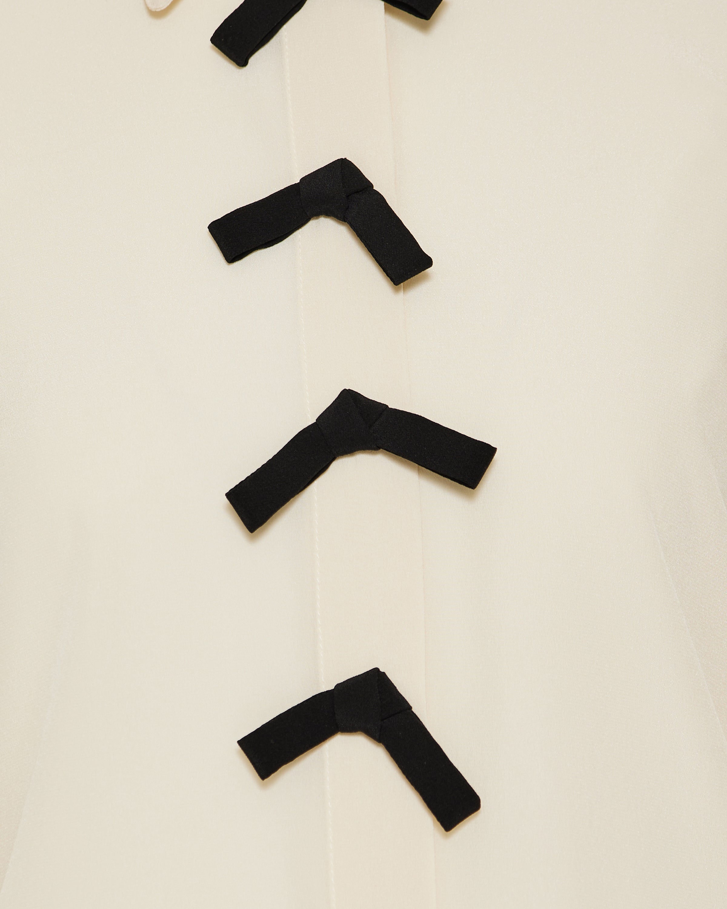 An elegant white blouse in luxurious silk crepe de chine, detailed with contrasting mini bows along the concealed button placket for a refined feminine touch. Designed with a relaxed silhouette and artisanal craftsmanship, this piece brings contemporary sophistication to elevated daytime and refined evening wear.