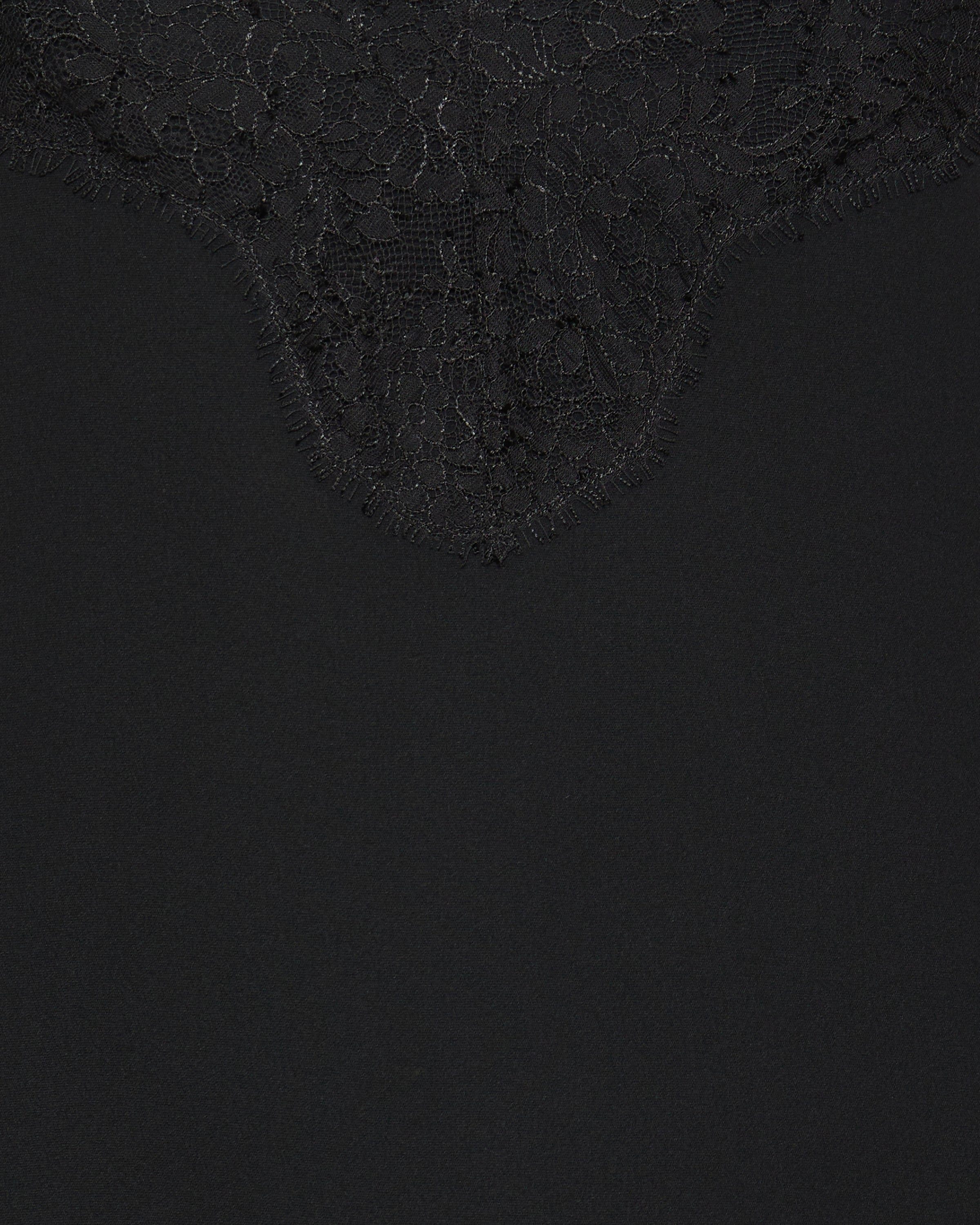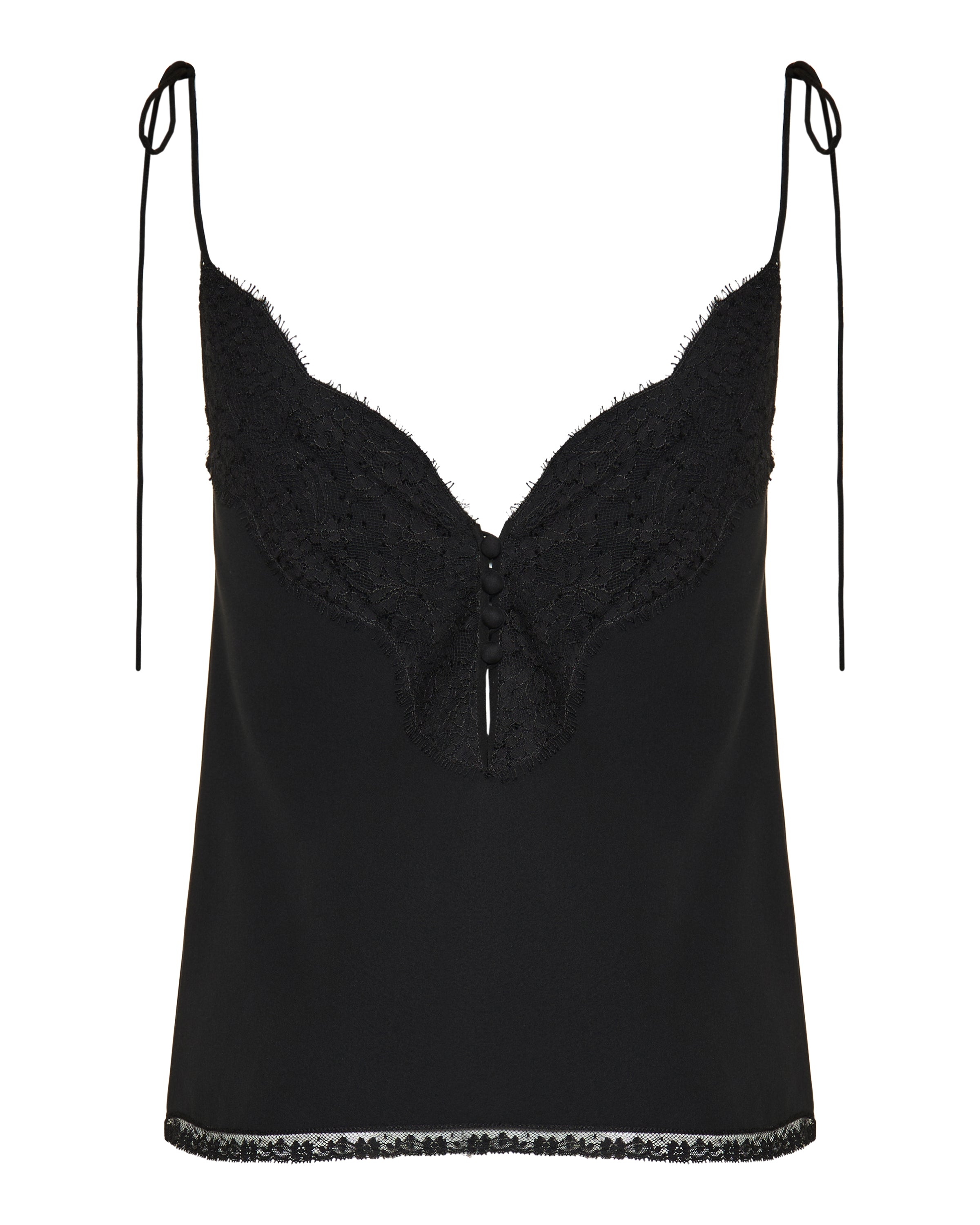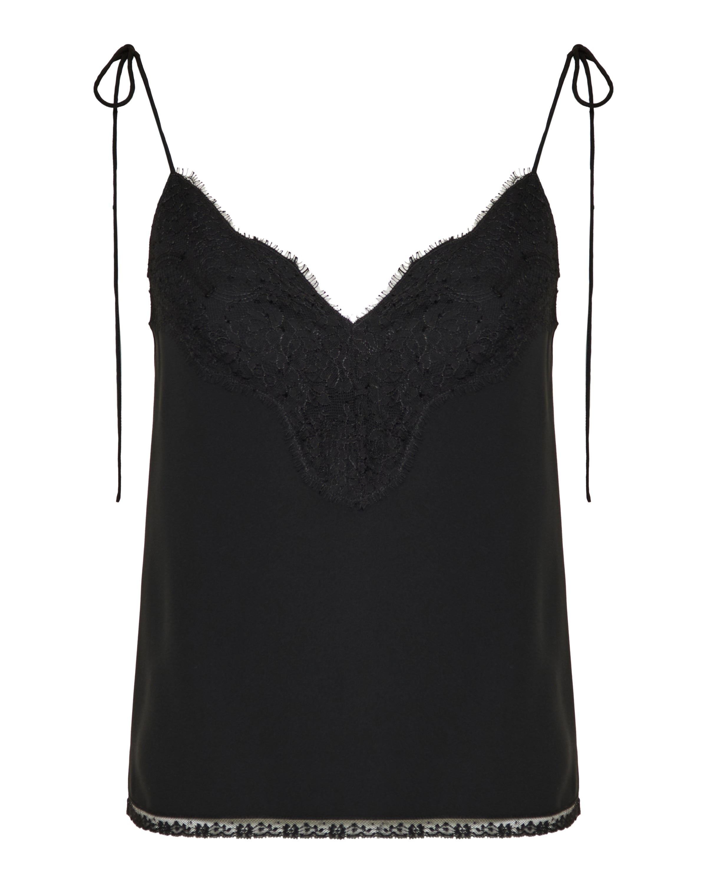 A refined black camisole crafted from luxurious silk crepe de chine, featuring delicate floral lace trim at the V‑neckline and hem. Suspended from slim, bow‑detailed shoulder straps, this piece combines romantic detailing with Italian craftsmanship for elevated casual and refined evening wear.