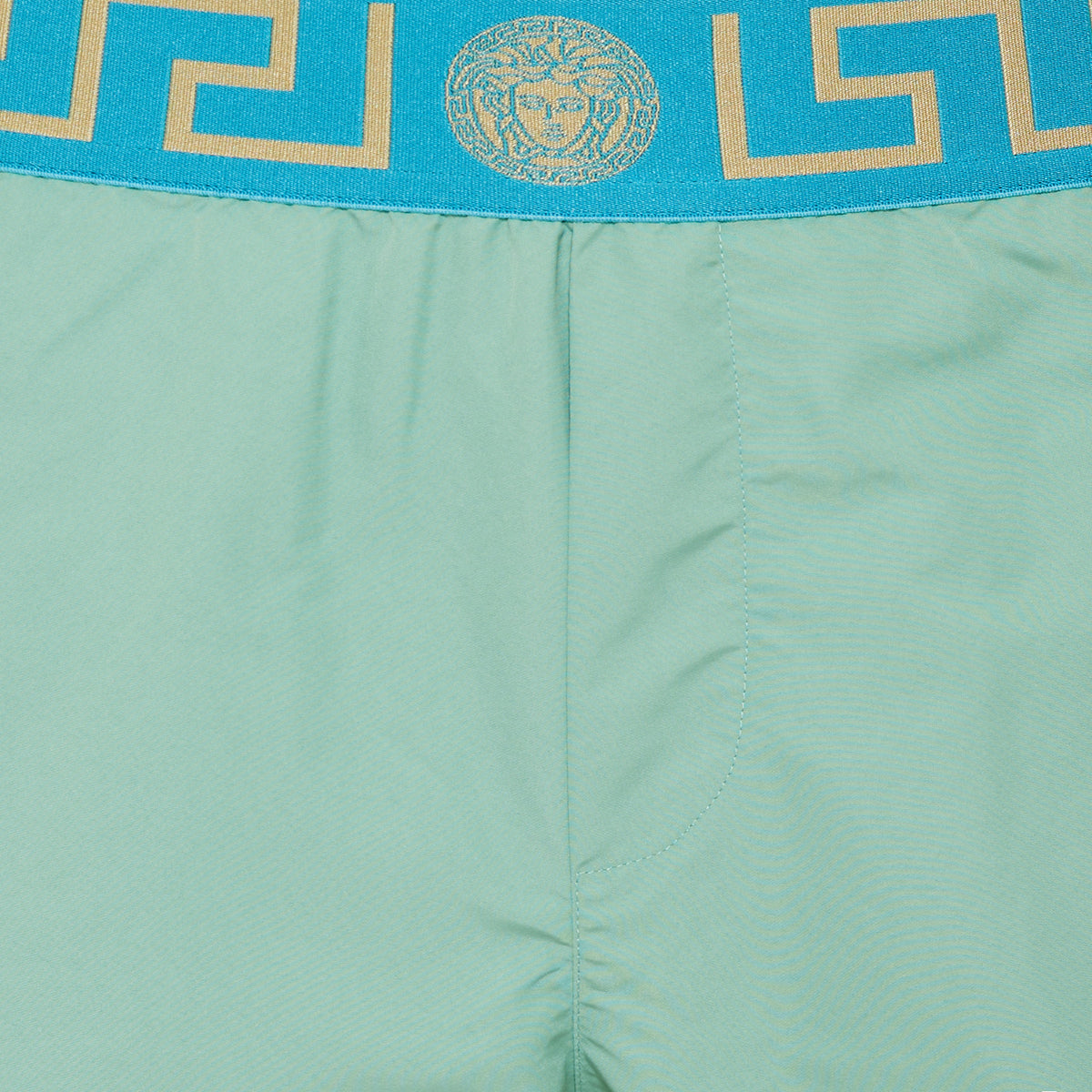 Versace swim shorts crafted in lightweight green fabric, detailed with the iconic Greca border motif at the elastic waistband. Designed for comfort and style, this versatile piece blends practicality with signature house codes, making it a refined addition to both poolside and beachwear wardrobes.