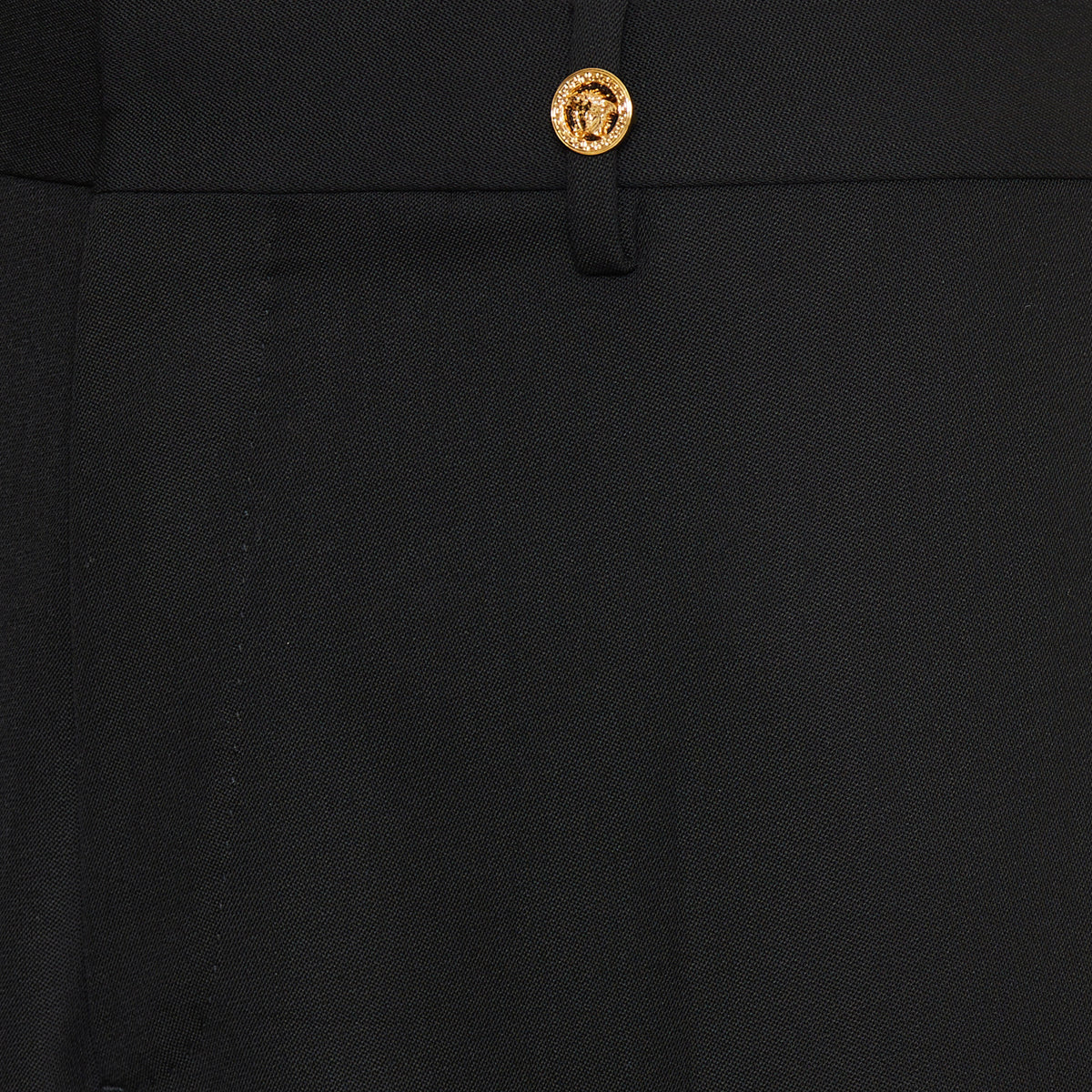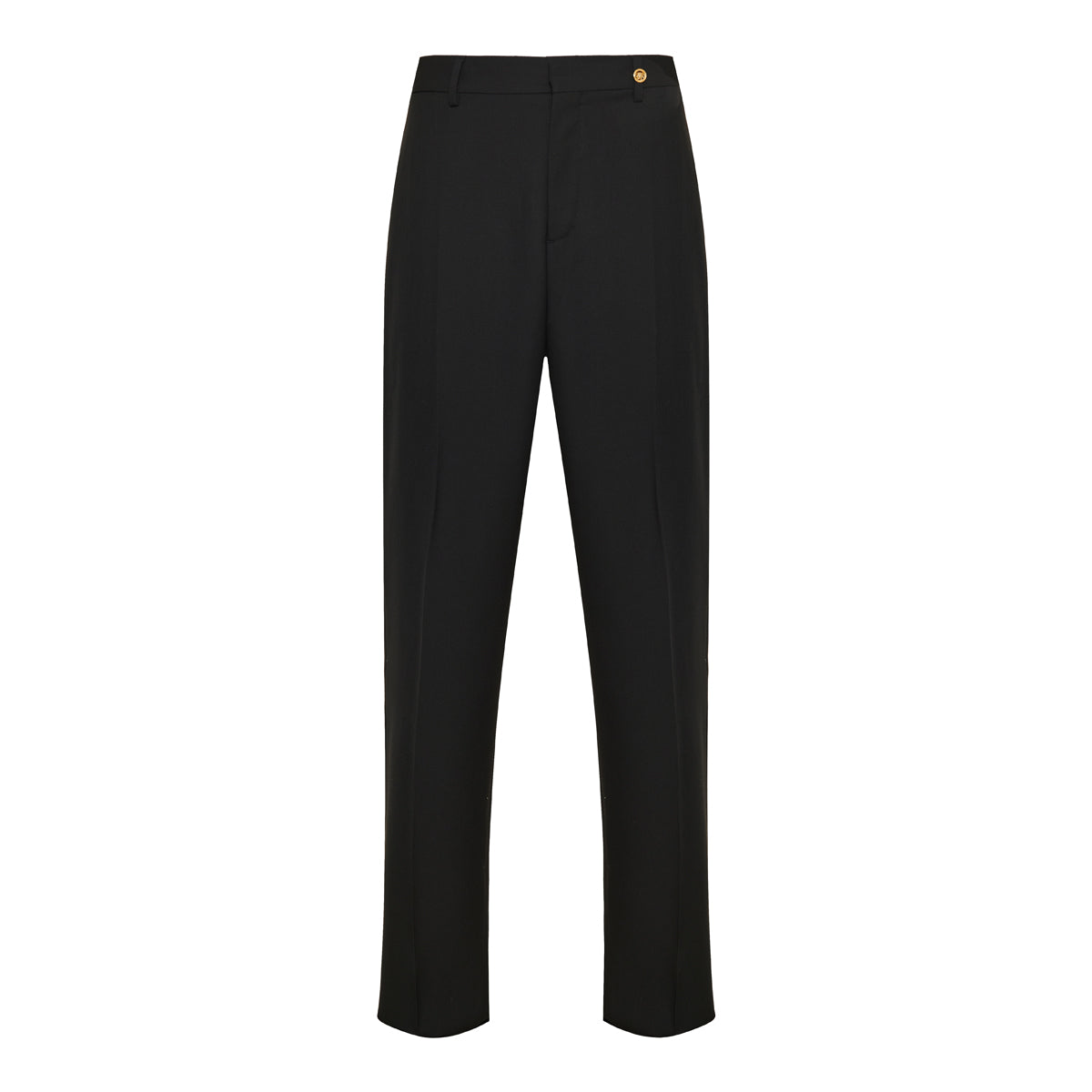 Refined stretch-wool trousers by Versace, tailored with a slightly relaxed silhouette and clean lines for sophisticated daytime or evening outfits. The structured cut and subtle metal-logo detail at the waistband give a polished, luxurious finish — ideal for elegant smart-casual or refined urban looks.