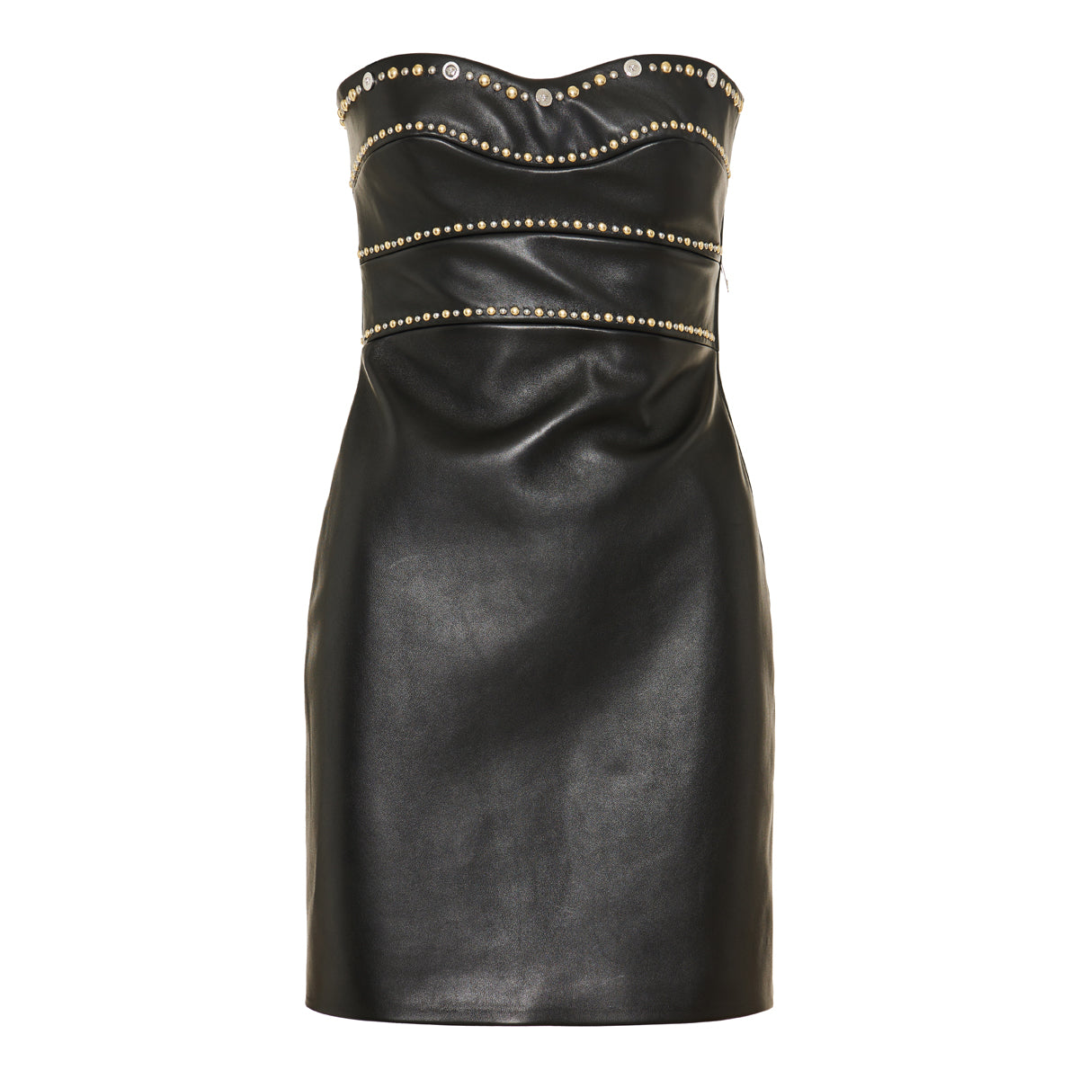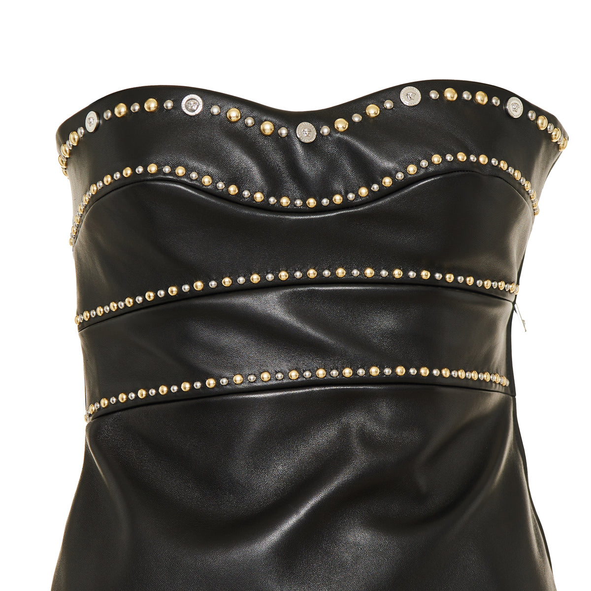 The Versace studded leather strapless dress stands out with its bold, sculptural silhouette — a subtle studded‑strap detail that adds a refined edge. Ideal for upscale evening events or glamorous receptions where modern elegance meets sensual sophistication.