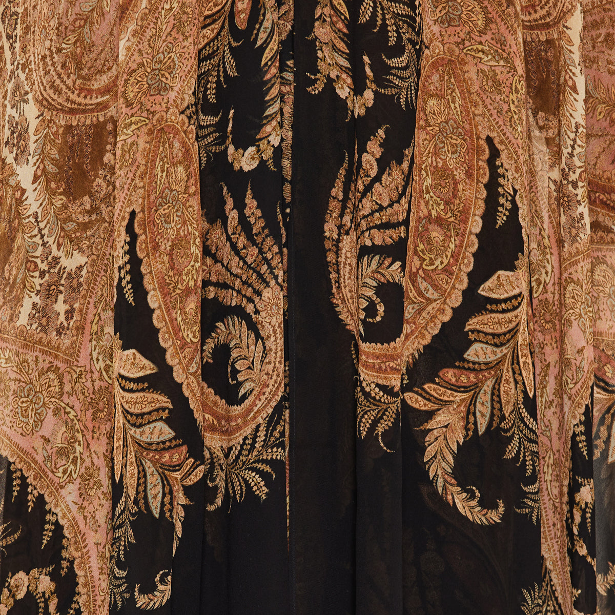 A striking evening gown that blends drama with elegance. This long-sleeved maxi dress features a keyhole neckline with self-ties, buttoned cuffs, and a flowing cape fastened at the neck. Adorned with a vibrant paisley print, it offers a refined finish suitable for upscale events and formal occasions.