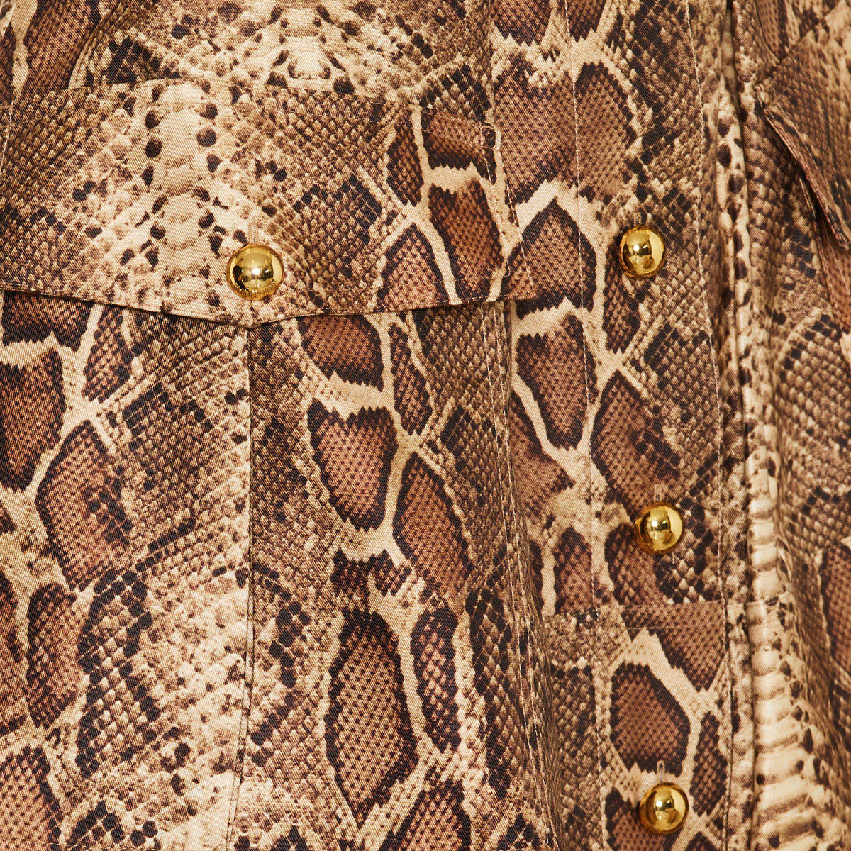 This mini skirt features a bold snake print in warm toffee tones. Designed with a flared silhouette, it includes a removable D-ring belt, front metal button closure, and functional patch pockets. Crafted from a silk-cotton blend, it offers a balance of elegance and utility, suitable for both day and evening wear.