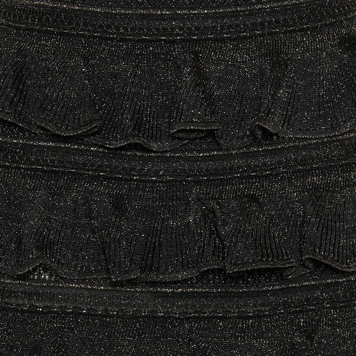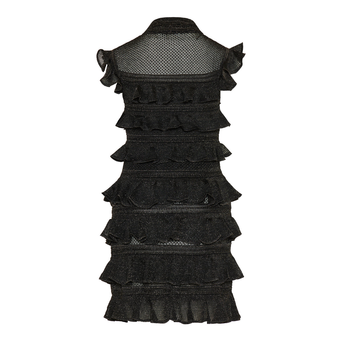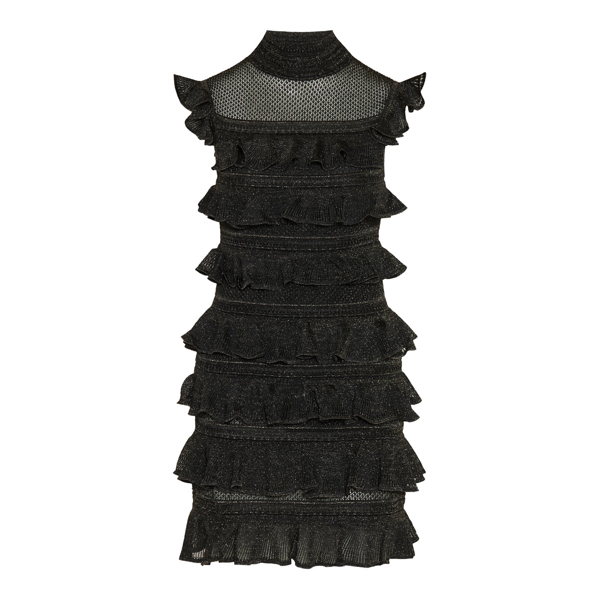 This Zimmermann Rebellion Frill mini dress in metallic‑black exudes sculptural drama and modern polish, perfect for upscale evenings or high‑impact events. Crafted in a metallic knit with a ribbed stand collar, mesh panelling at the neckline, and cascading tiered frills throughout the silhouette.