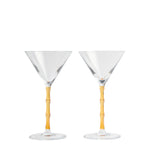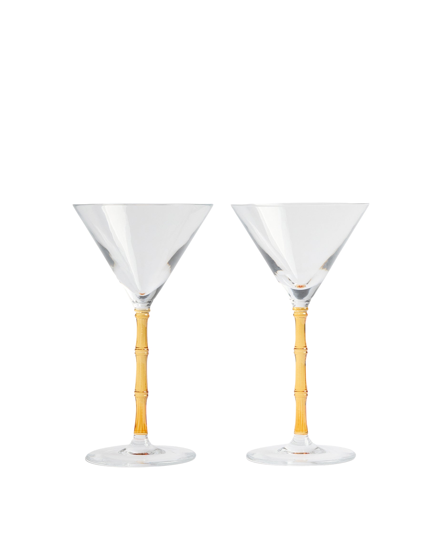 Set of two martini glasses defined by sculptural bamboo-inspired stems and a solid amber tone, designed to elevate cocktails with character and joyful sophistication.
