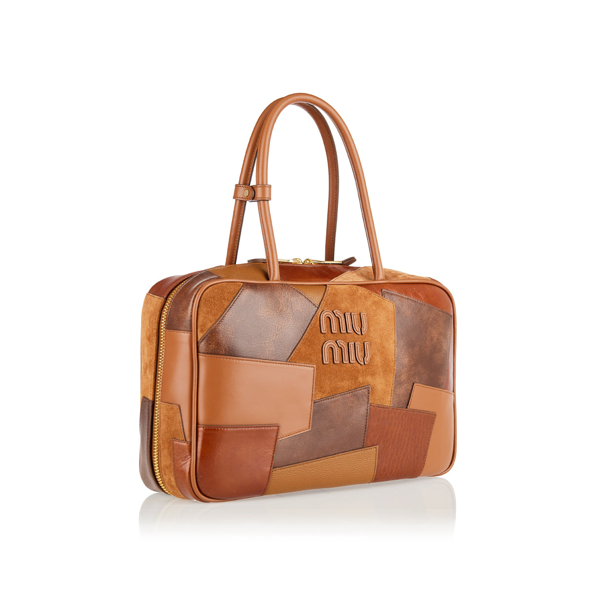 A compact top-handle bag crafted from patchwork lambskin, featuring leather handles, a leather lettering logo, and gold-tone hardware.