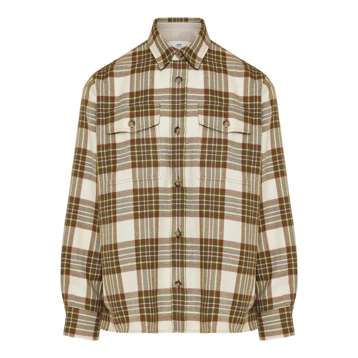 The Ami Paris Wool Checked Overshirt is a versatile wardrobe staple. Crafted from 100% virgin wool, this overshirt features a classic checked pattern, buttoned front closure, and chest pockets. Designed for a relaxed fit, it offers both style and comfort, making it suitable for layering or wearing on its own.