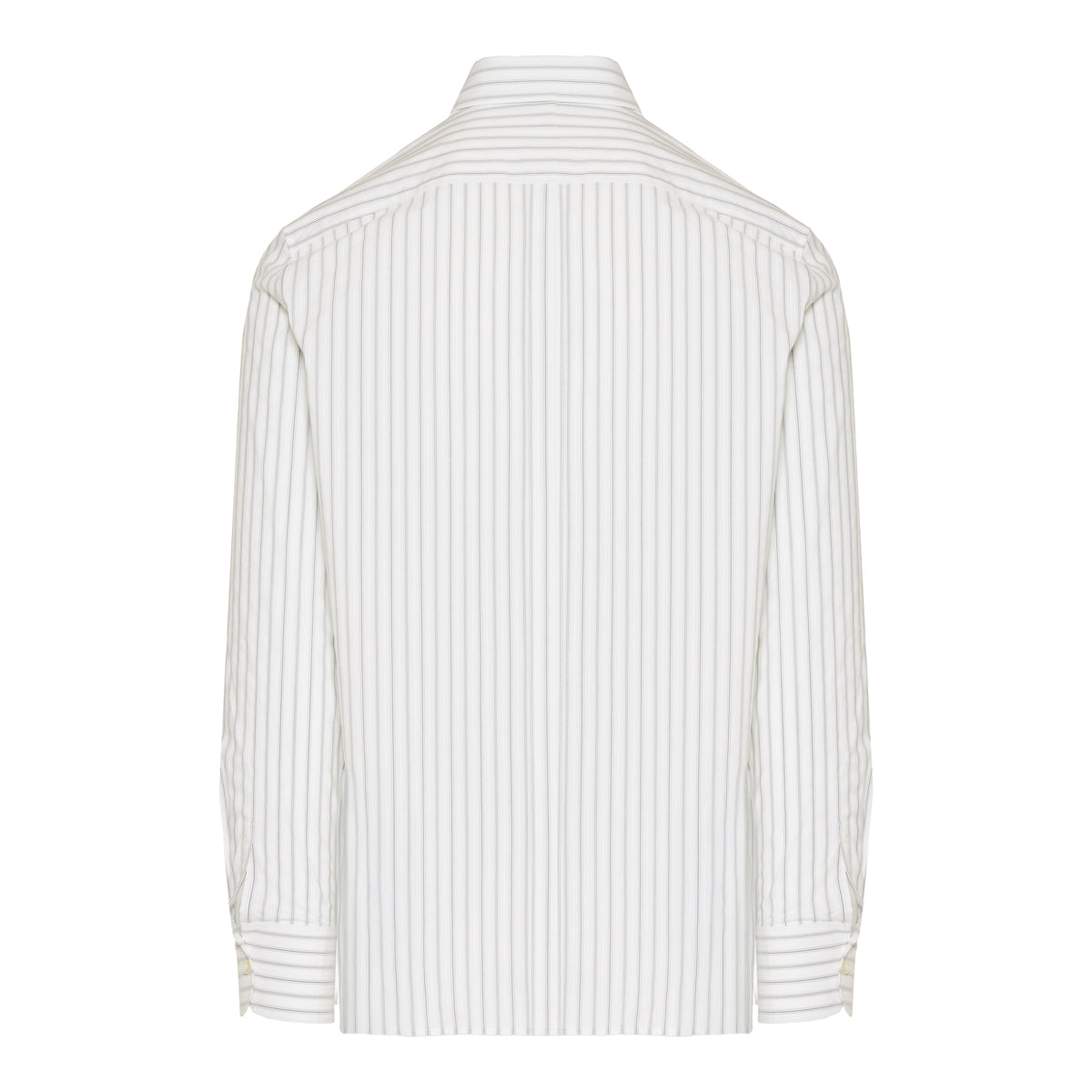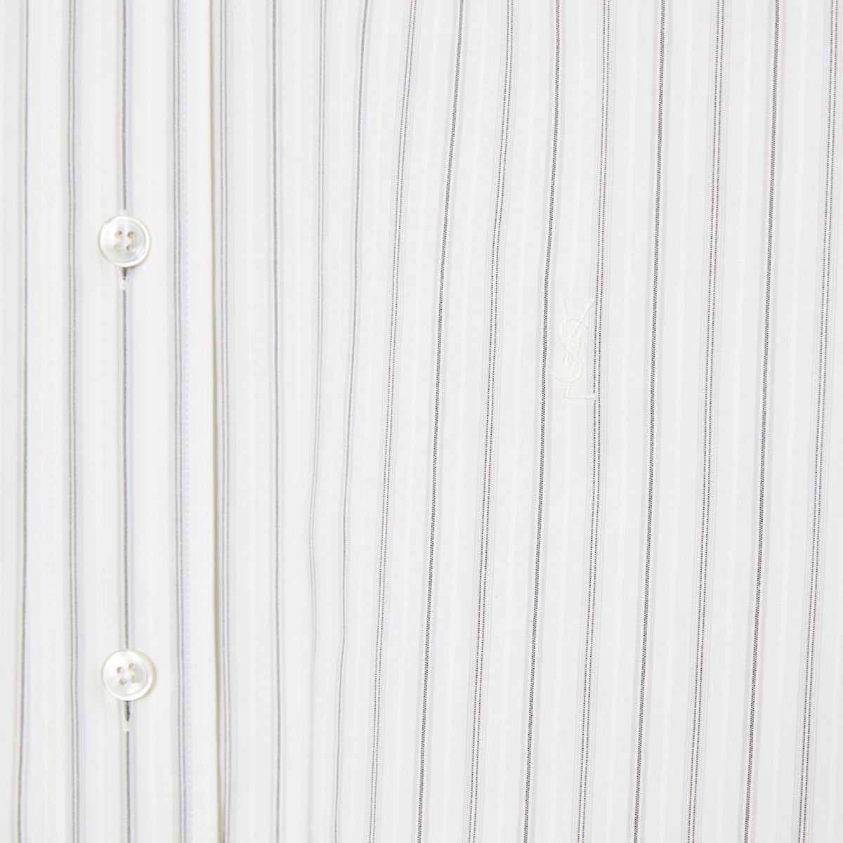 This Saint Laurent sport shirt features a classic striped motif in a crisp white color. Designed with a point collar, button front, and long sleeves with button cuffs, it offers a regular fit for a comfortable silhouette.