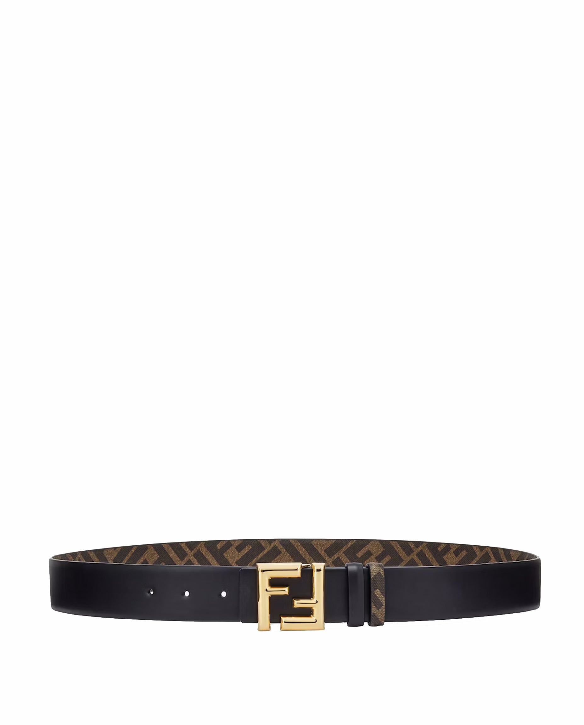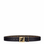 Reversible belt. Iconic FF stud buckle. Made of smooth black leather. Reverse side in fabric with brown and tobacco FF motif. Gold-finish metalware.