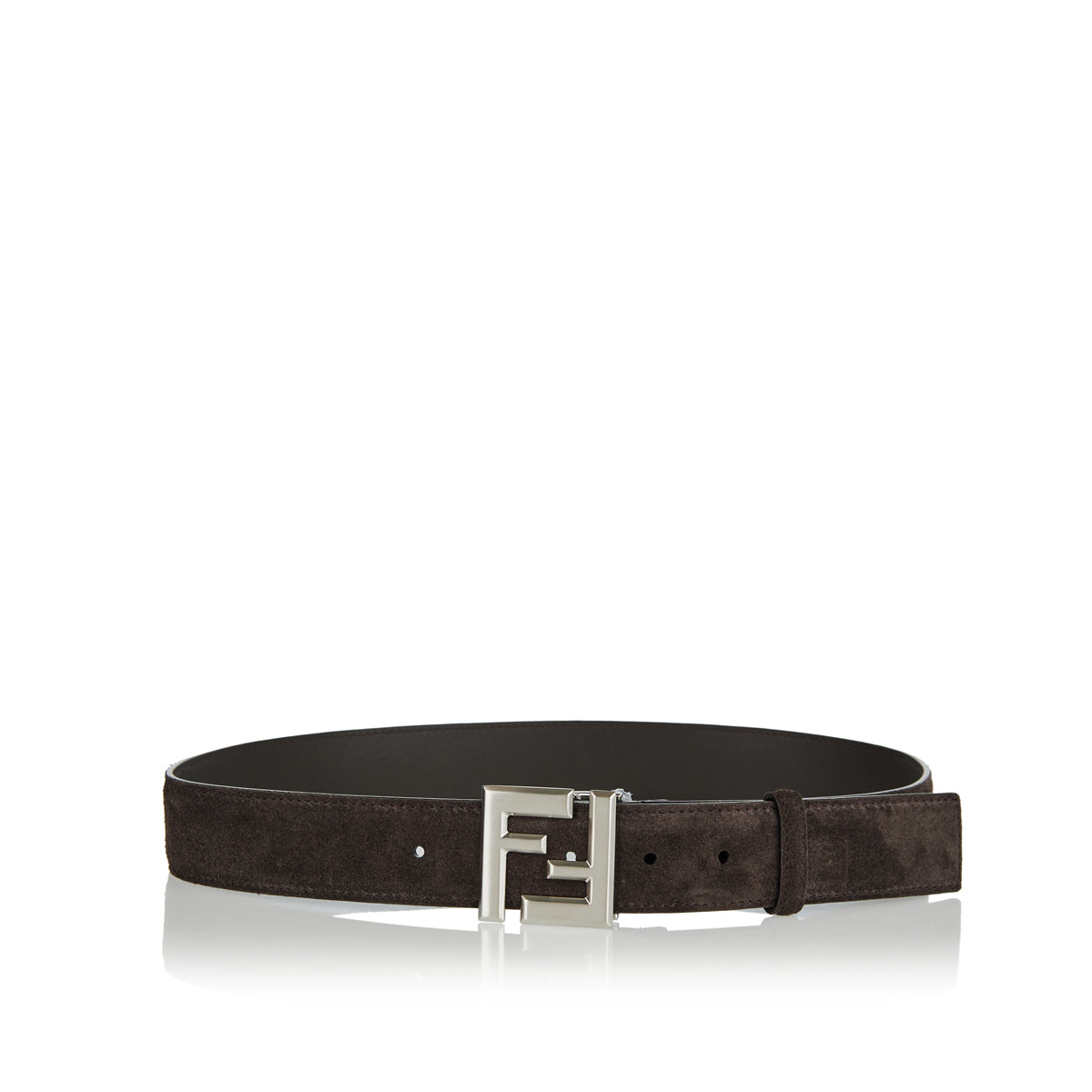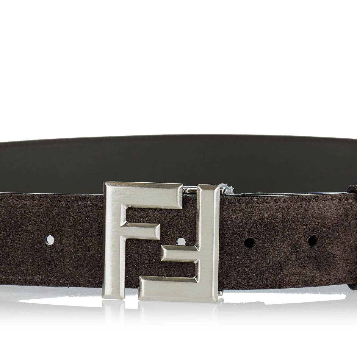 This Fendi belt is crafted from dark brown suede with light brown leather lining, featuring the signature FF Squared buckle in brushed ruthenium finish. Designed for both casual and formal styling, it combines timeless Italian craftsmanship with refined elegance. Ideal for elevating tailored outfits or premium casual looks.