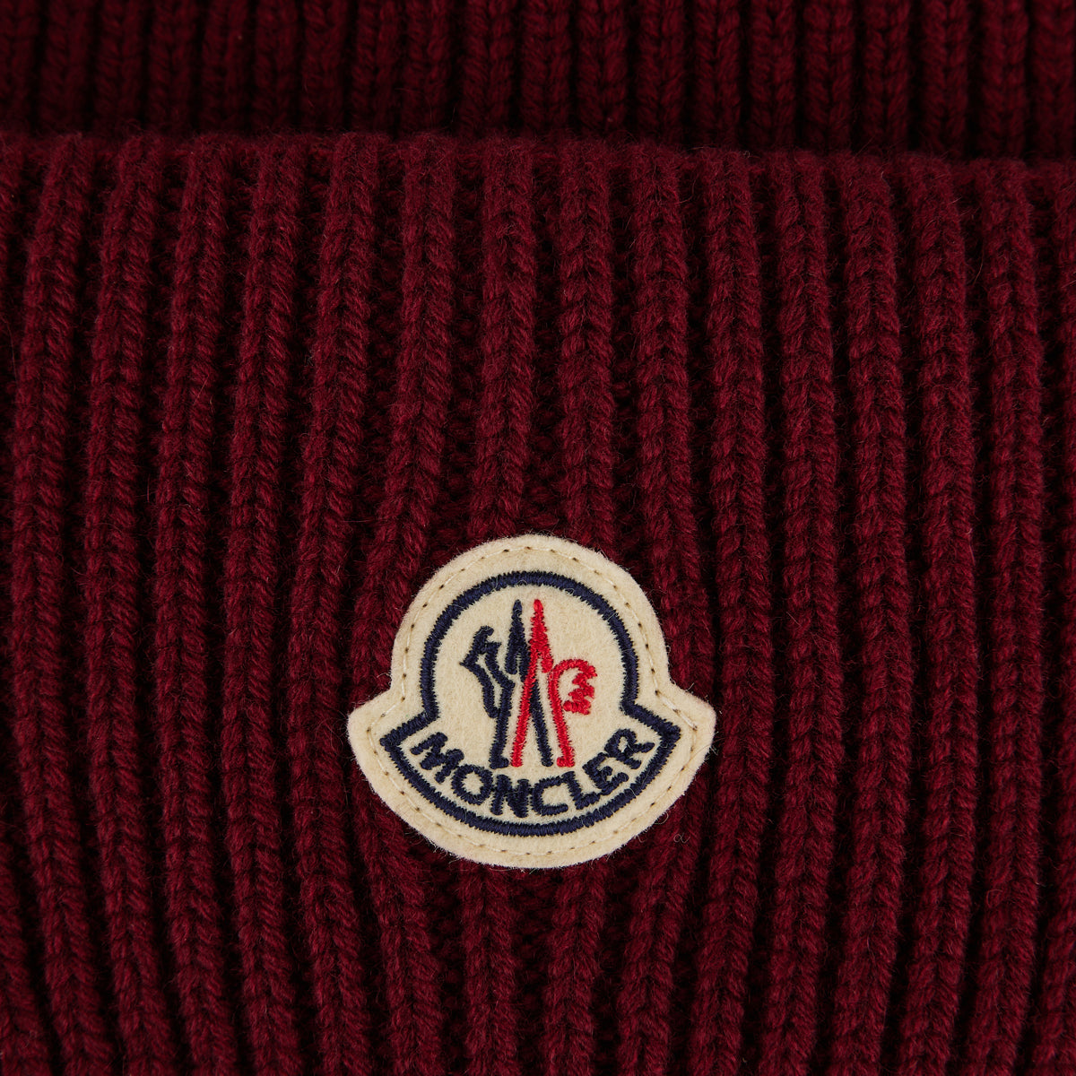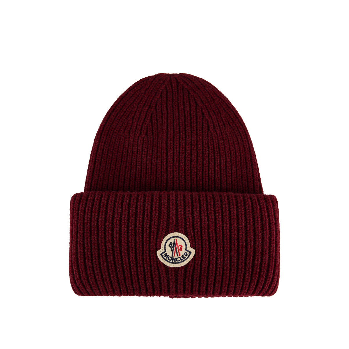 Crafted from ultra-fine virgin wool, this burgundy ribbed knit beanie features a classic fold-over cuff and a tonal Moncler logo patch. Designed in Italy, it offers both warmth and a refined, minimalist aesthetic.
