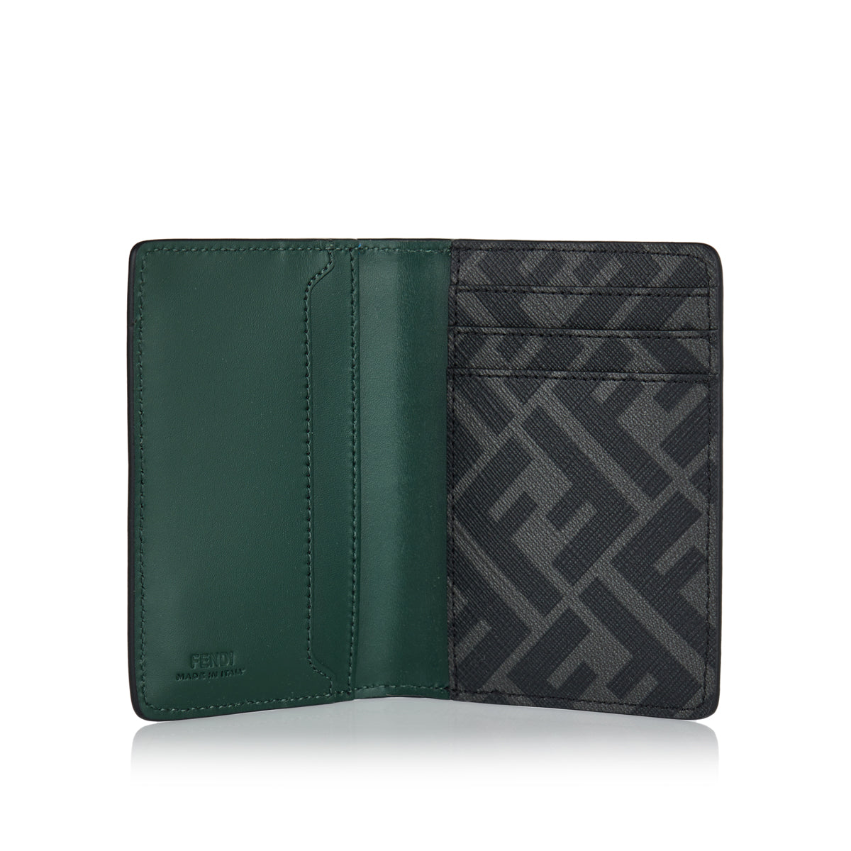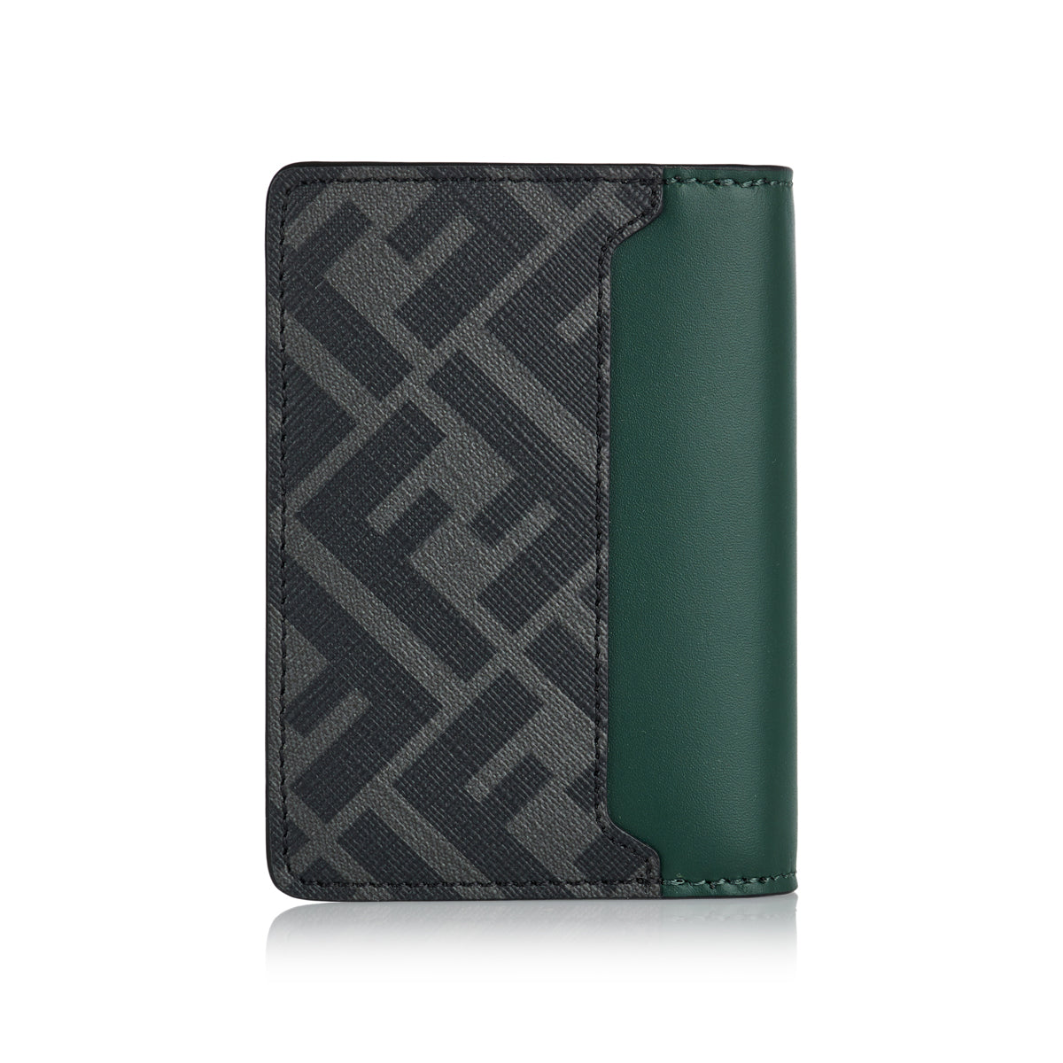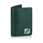 A luxury bi-fold card holder crafted from supple green calf leather with black FF canvas panels. It features a palladium-finish metal FF Squared motif, three internal card slots, three flat pockets, and a rear slip pocket. Made in Italy, this card holder blends bold branding with refined practicality.