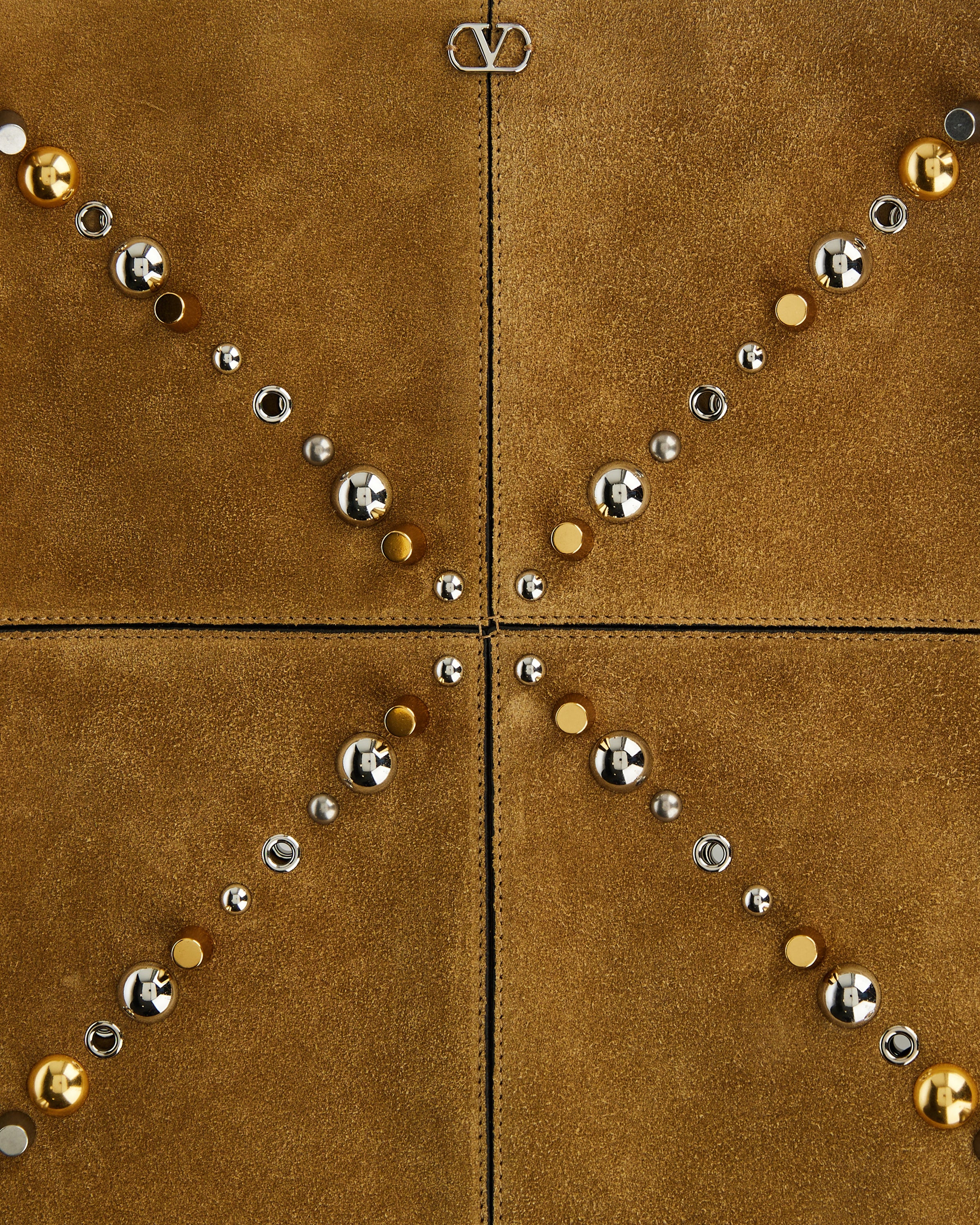 The Valentino Garavani macara shoulder bag in brown suede showcases signature Italian craftsmanship with eyelet and fringe embellishments, an adjustable shoulder strap and an open top design. This contemporary yet refined piece offers a versatile silhouette that enhances both elevated casual and formal ensembles with understated luxury.