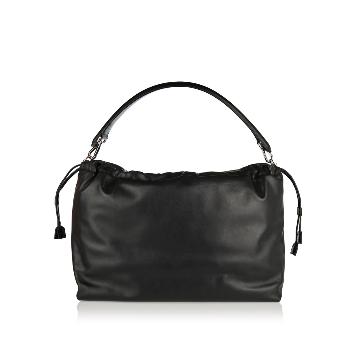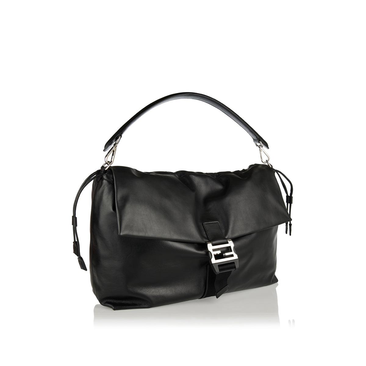 The Maxi Mamma Baguette from Fendi reimagines one of the house’s most iconic shapes in a larger, contemporary format. Crafted in smooth black leather, it features a structured silhouette enhanced by the signature FF magnetic clasp. A versatile design that can be worn by hand, over the shoulder, or crossbody thanks to its adjustable strap, making it the perfect companion for both day and evening refinement.