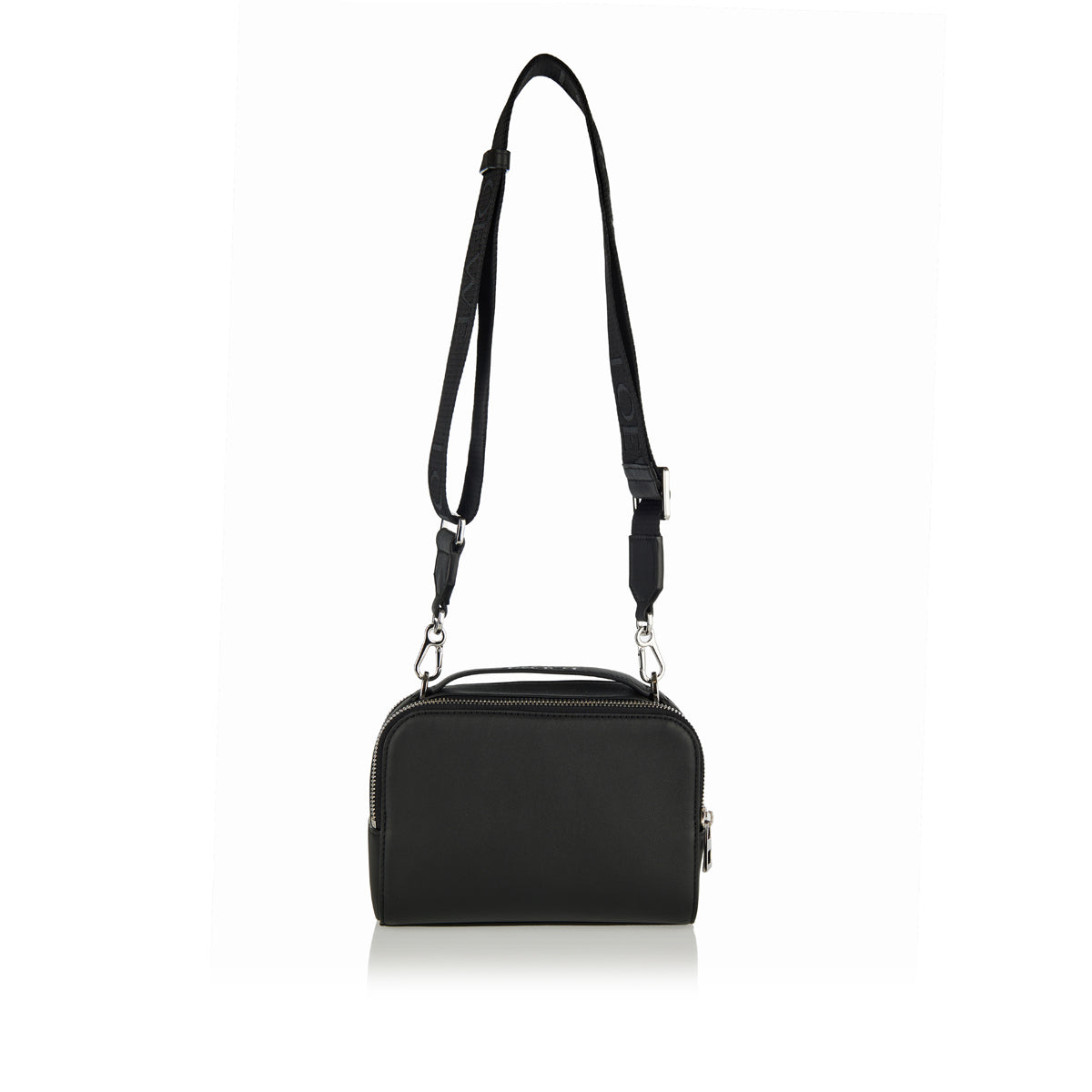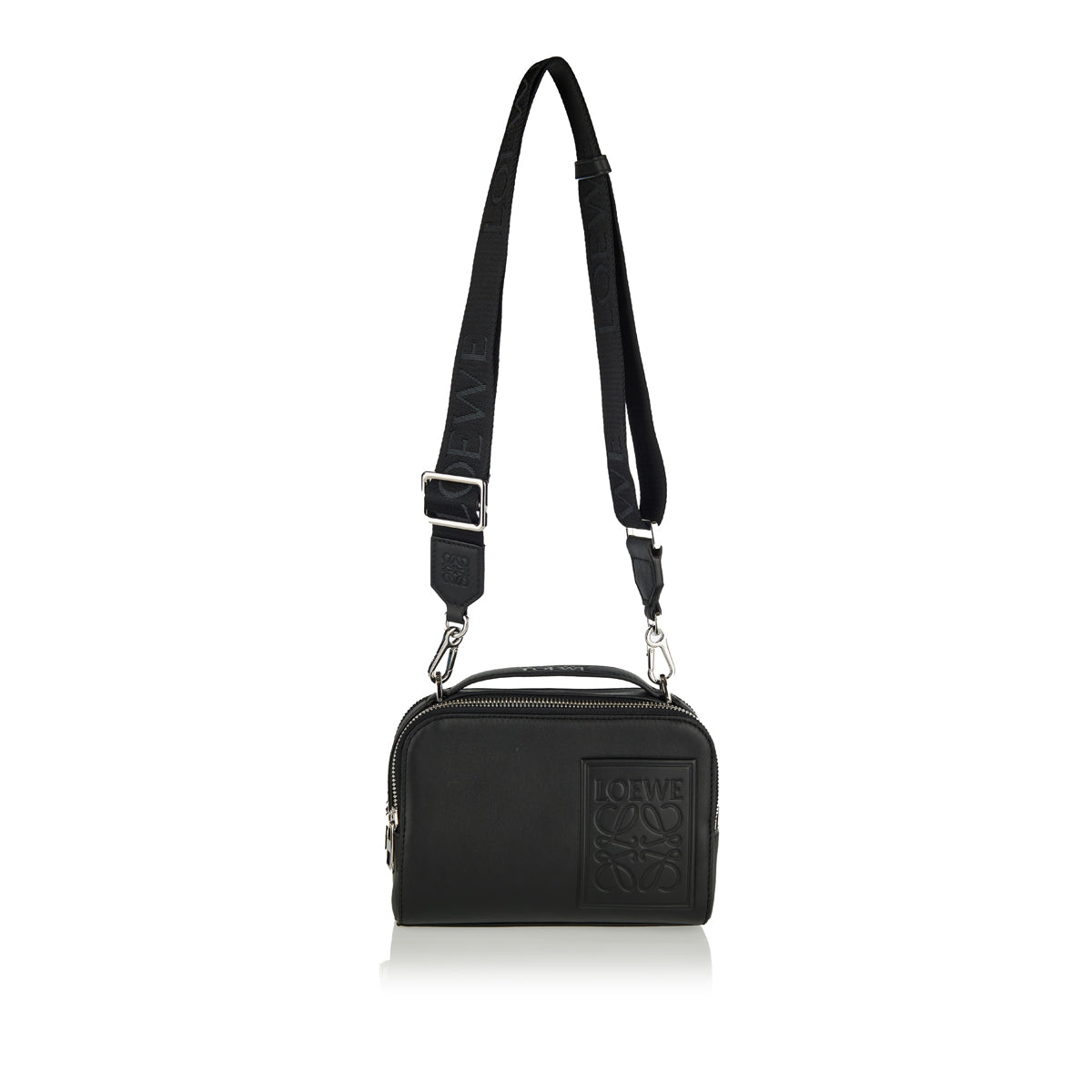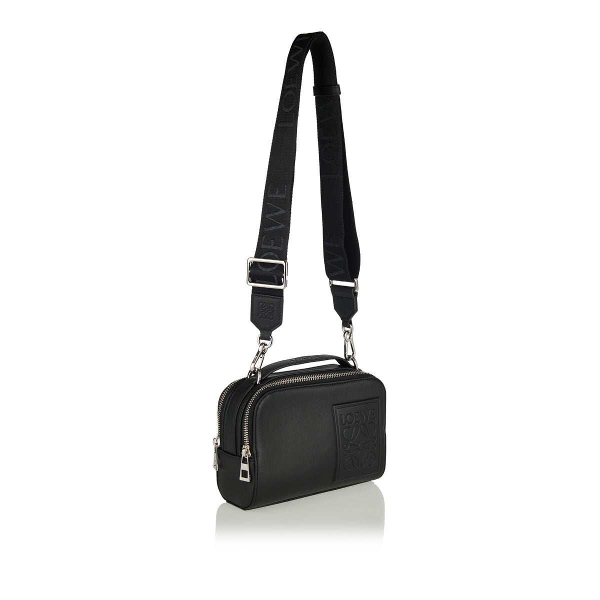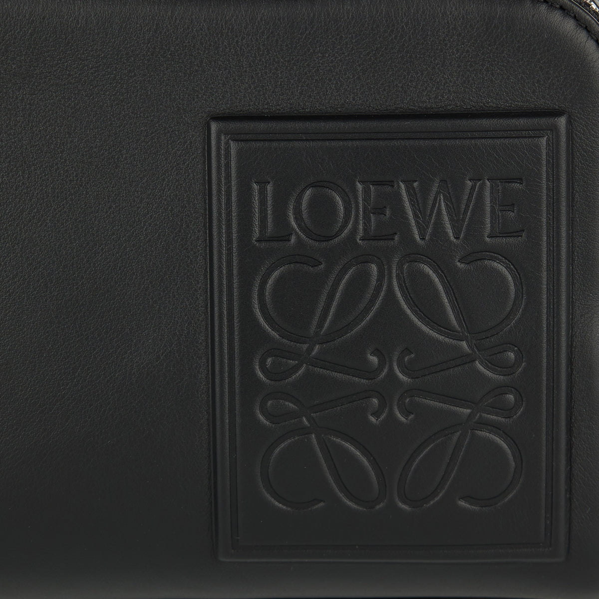 A sculptural and sophisticated Loewe mini bag, crafted from smooth black calfskin with a subtly debossed Anagram patch. It features two zip compartments, a detachable and adjustable webbing strap, and a herringbone cotton lining — ideal for both hand carry and cross‑body wear. A versatile, elegant piece for elevated everyday style.