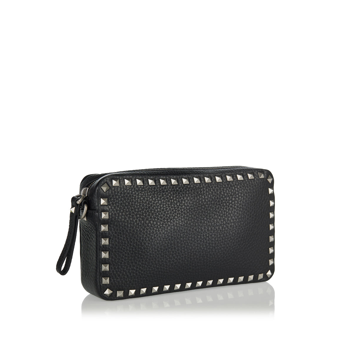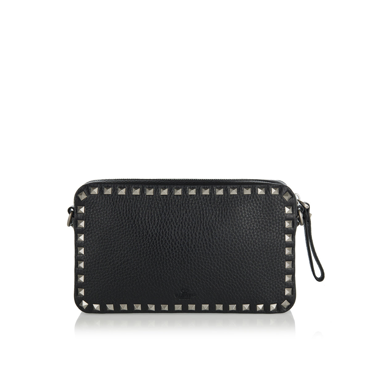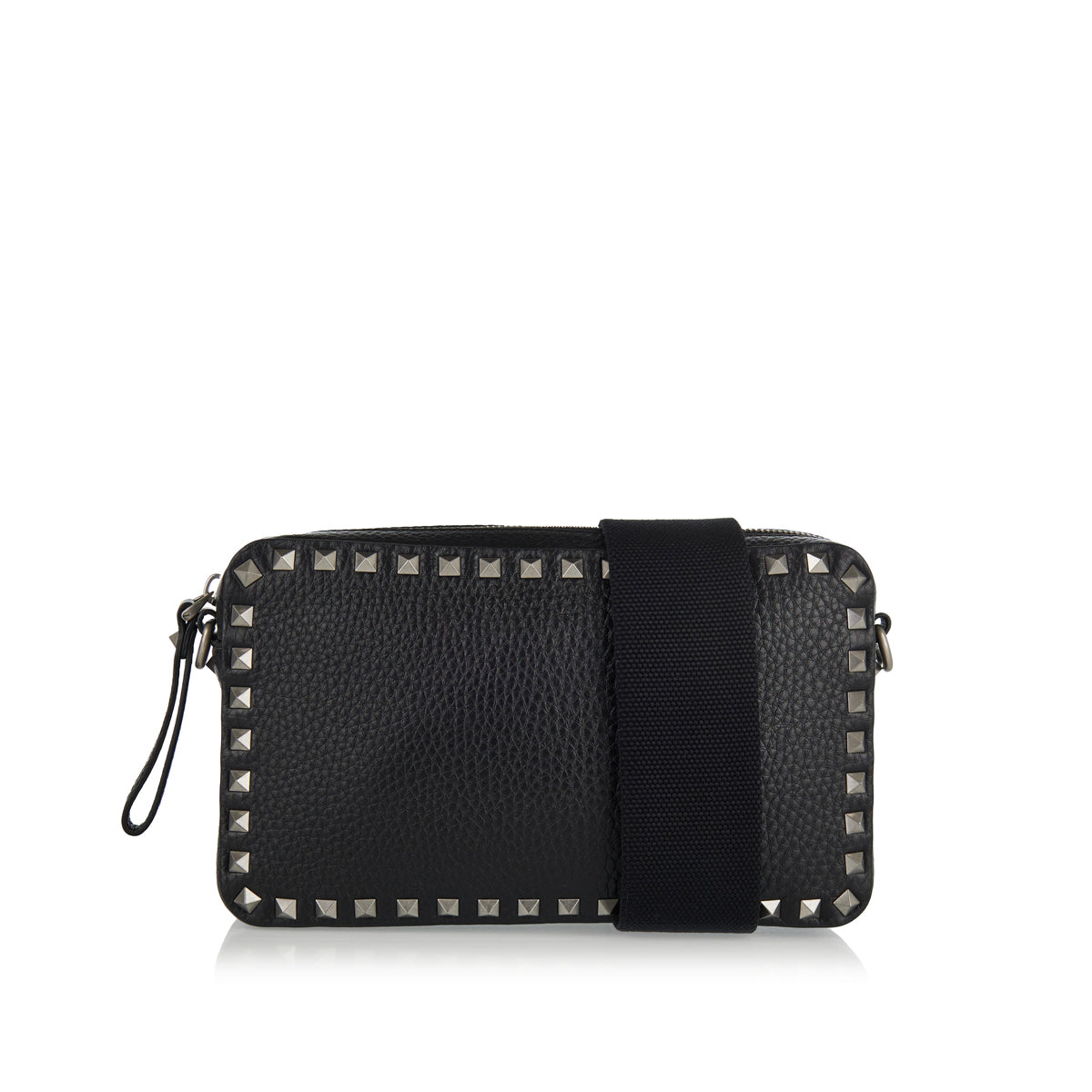 Handcrafted in Italy from smooth black lambskin leather, this Valentino Garavani Rockstud crossbody bag features a quilted diamond pattern adorned with gold-finish studs. It includes a removable top handle with signature studs, an adjustable leather strap, two zip-closure compartments and three internal card slots. Dust bag included for protective storage.