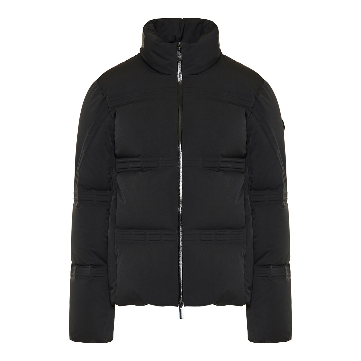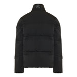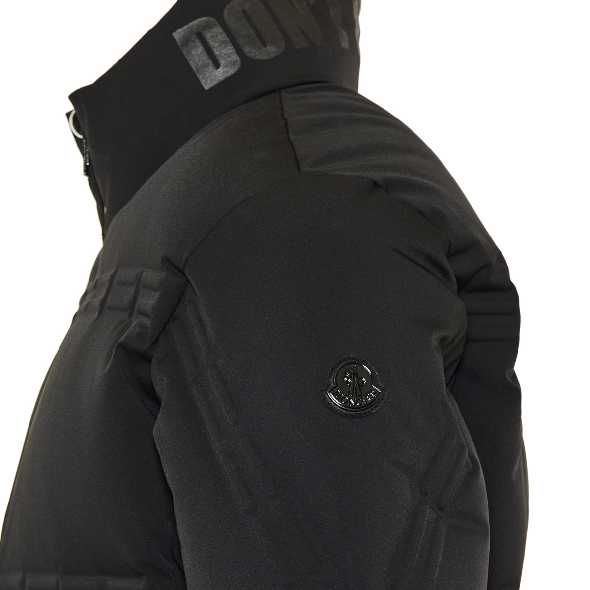 The Rally jacket from the Moncler Genius x A$AP Rocky collaboration reimagines classic outerwear with a bold streetwear influence. Crafted in technical black fabric, it features an oversized quilted design with embossed detailing, a high collar with tonal “DON’T BE DUMB” lettering, and a glossy two-way zipper for a striking finish. Perfect for urban styling, this jacket combines statement aesthetics with functionality, offering a contemporary layer for both casual and elevated looks.