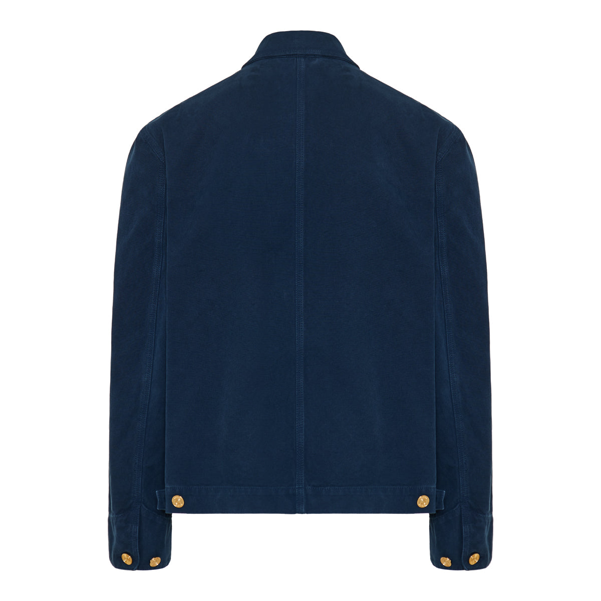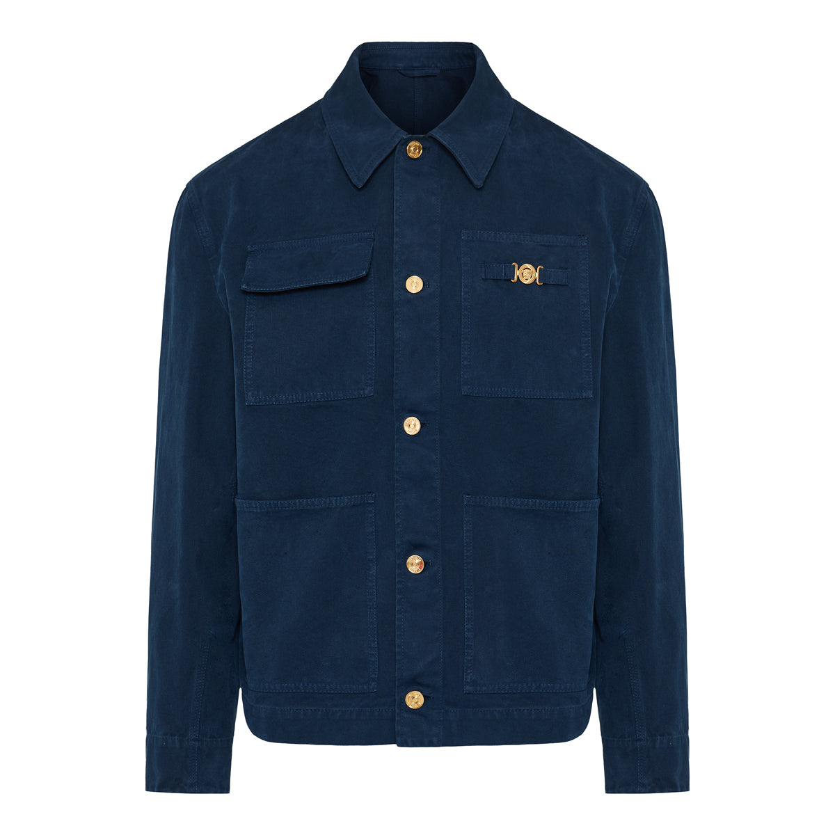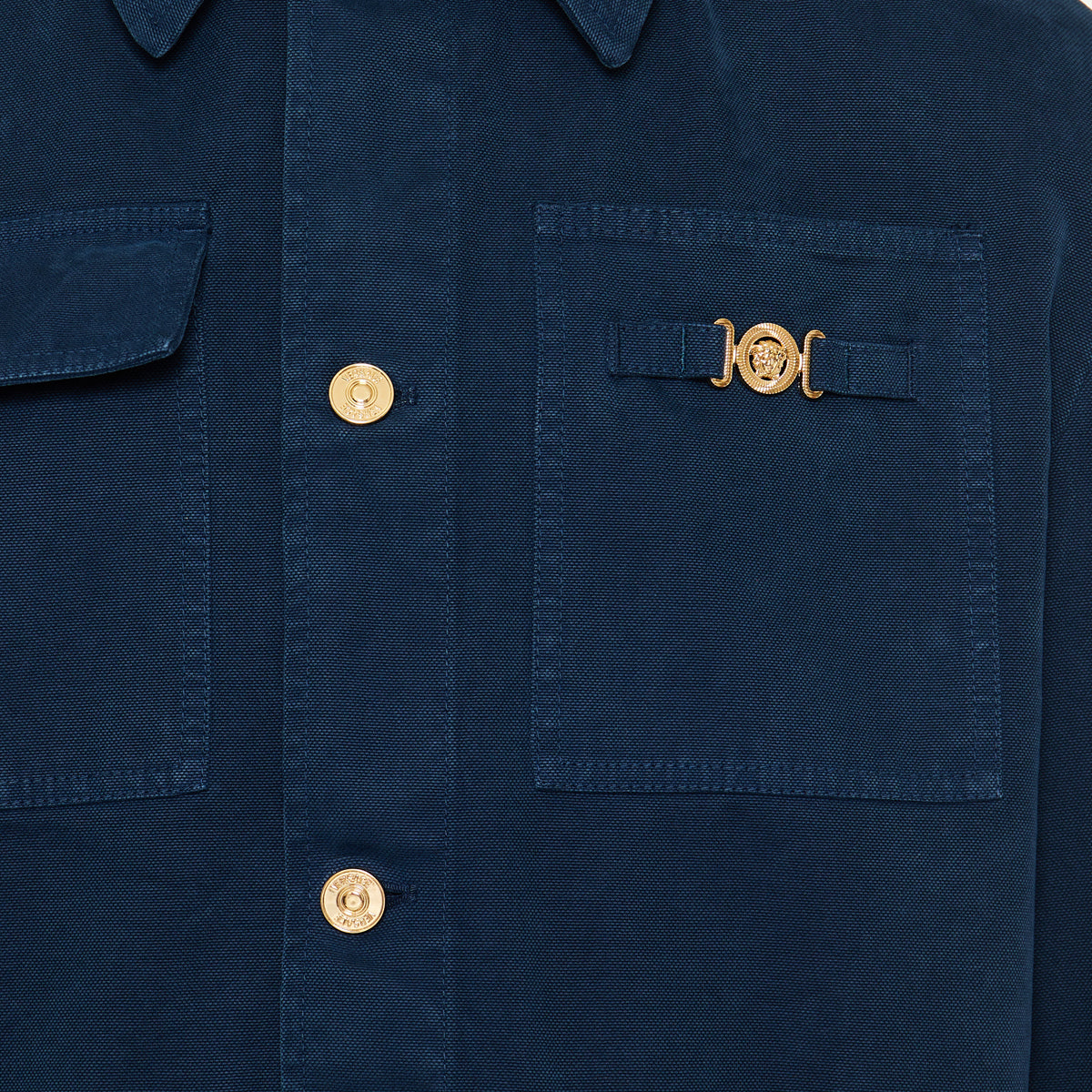 The Versace Overdyed canvas carpenter jacket blends rugged workwear styling with refined luxury — crafted from heavy cotton canvas and detailed with signature Medusa Biggie hardware. With multiple pockets, button closures, and a structured silhouette, it suits elevated casual wear and urban layering for a bold yet sophisticated street‑style look.