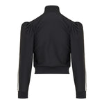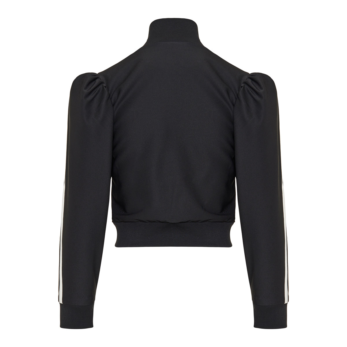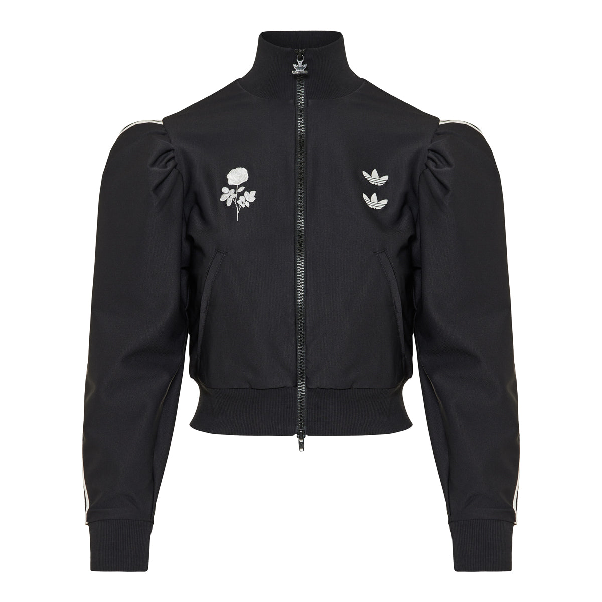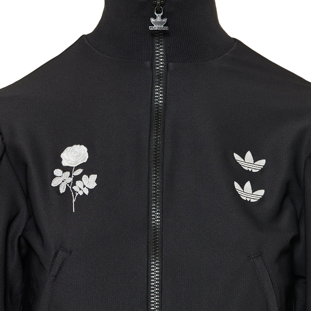 A fashion-forward adidas x Willy Chavarria blouse track jacket in deep black, combining classic sporty heritage with contemporary design. Crafted from structured woven fabric with puffed shoulders, a high mock-neck and full-zip closure, it features signature three-stripe detailing down the sleeves and embroidered Trefoil and floral motifs for elevated athleisure style. Ideal for refined everyday layered looks or standout casual outfits.