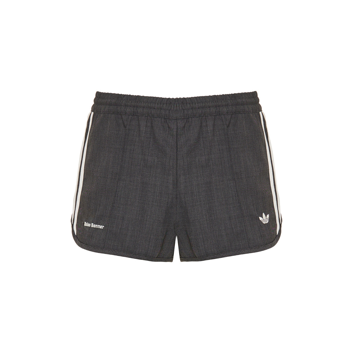 These wool shorts from the Adidas × Wales Bonner collaboration are crafted from a 50% recycled PET / 50% wool blend, featuring an elastic waistband, white side stripes, and the Wales Bonner logo at the front hem. Designed for elevated casual wear, they combine sporty heritage and luxury detailing.