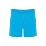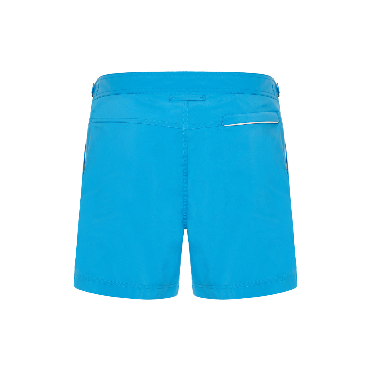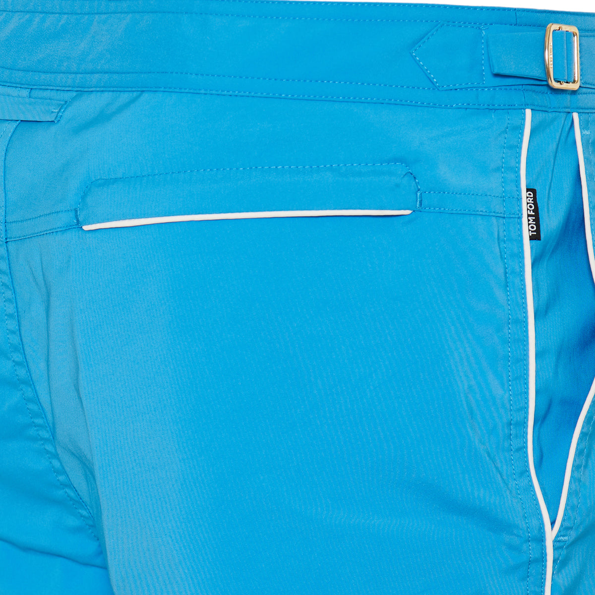Elevate summer leisure with TOM FORD compact buckle-epaulettes swim shorts in striking turquoise. Tailored in 100% lightweight polyester with mesh lining, they showcase concealed hook-and-eye and zip-fly closure, pale gold side adjusters, buckle epaulettes at the waist and a zip-back pocket. Their regular mid-rise cut delivers refined elegance poolside, beachside and at resort-club gatherings.