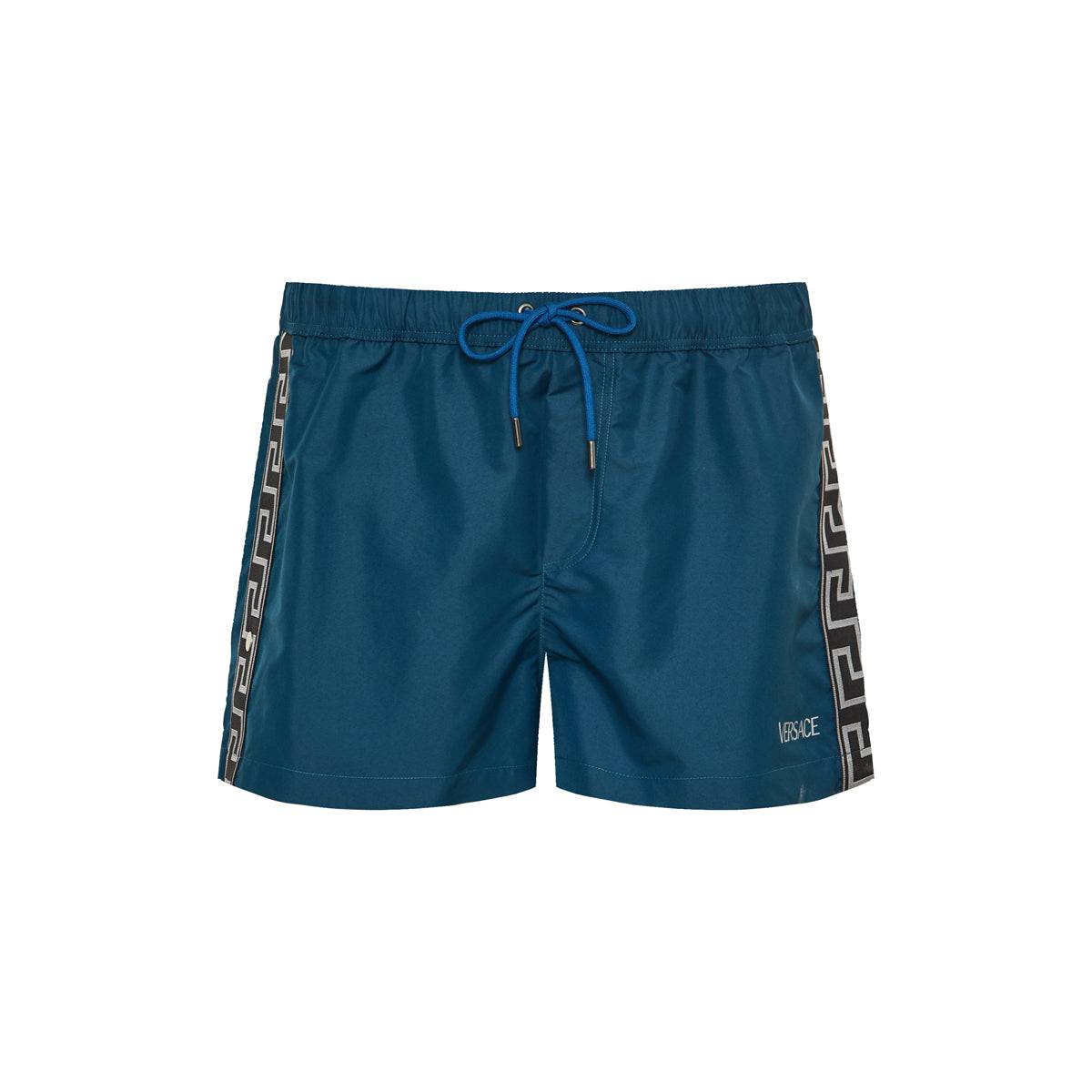 A sophisticated swimwear piece combining timeless design and modern practicality. The elastic drawstring waistband and signature Greca‑border side bands frame a refined silhouette. With mesh slip lining, side and back pockets, these boardshorts are tailored for stylish beach or poolside wear — ideal for luxurious summer escapes.