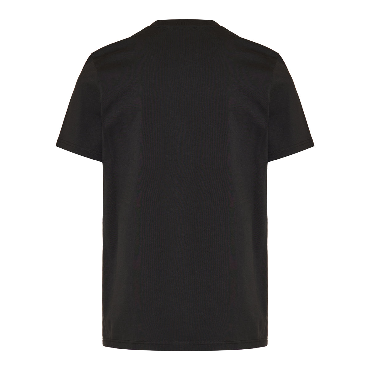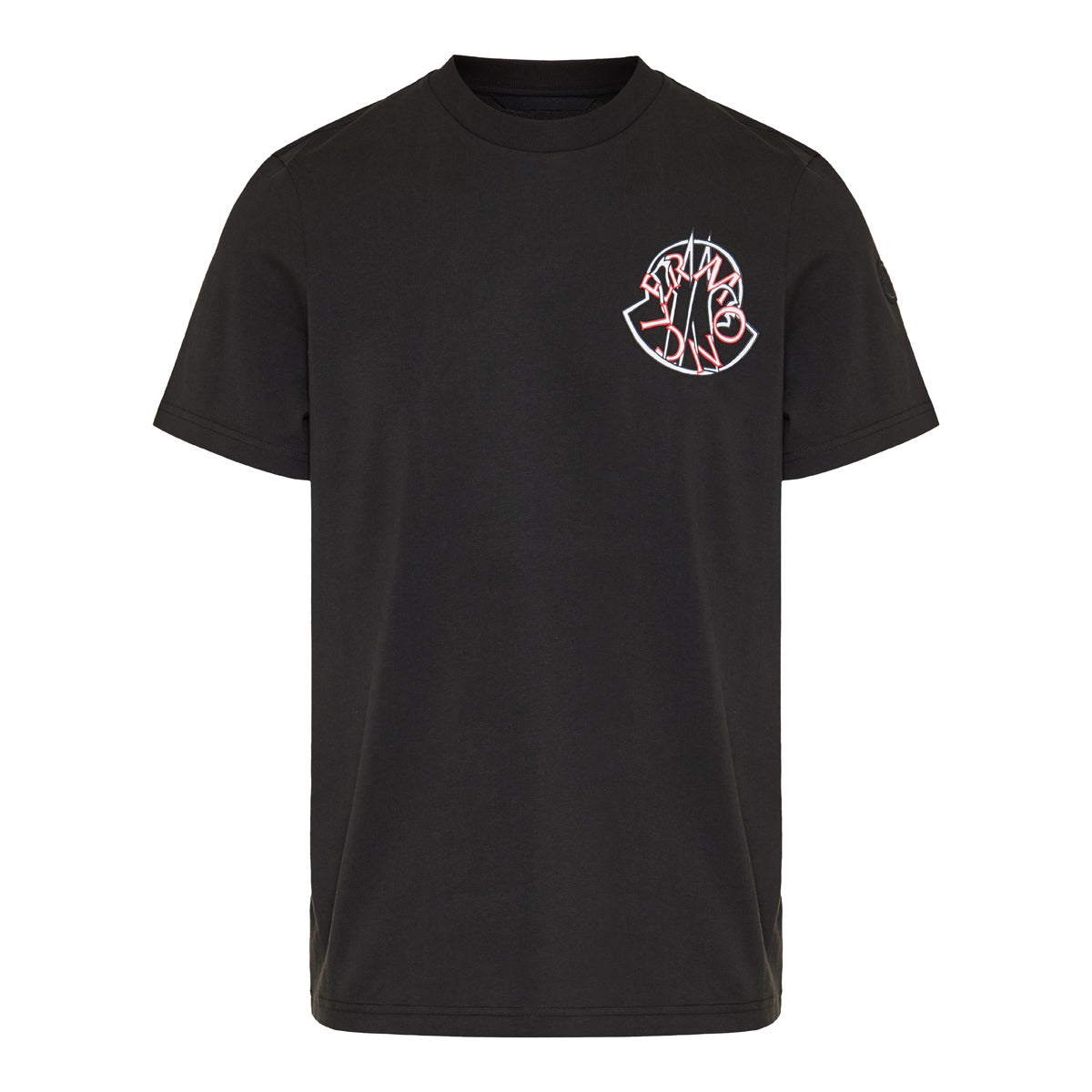 The Moncler Overlapped Logo Cotton T-shirt in Black is a refined wardrobe essential. Crafted from soft cotton jersey, it features a classic crew neck, short sleeves, and is adorned with an overlapping Moncler logo print on the chest. Designed for a regular fit, this versatile piece offers both comfort and style, suitable for various occasions.